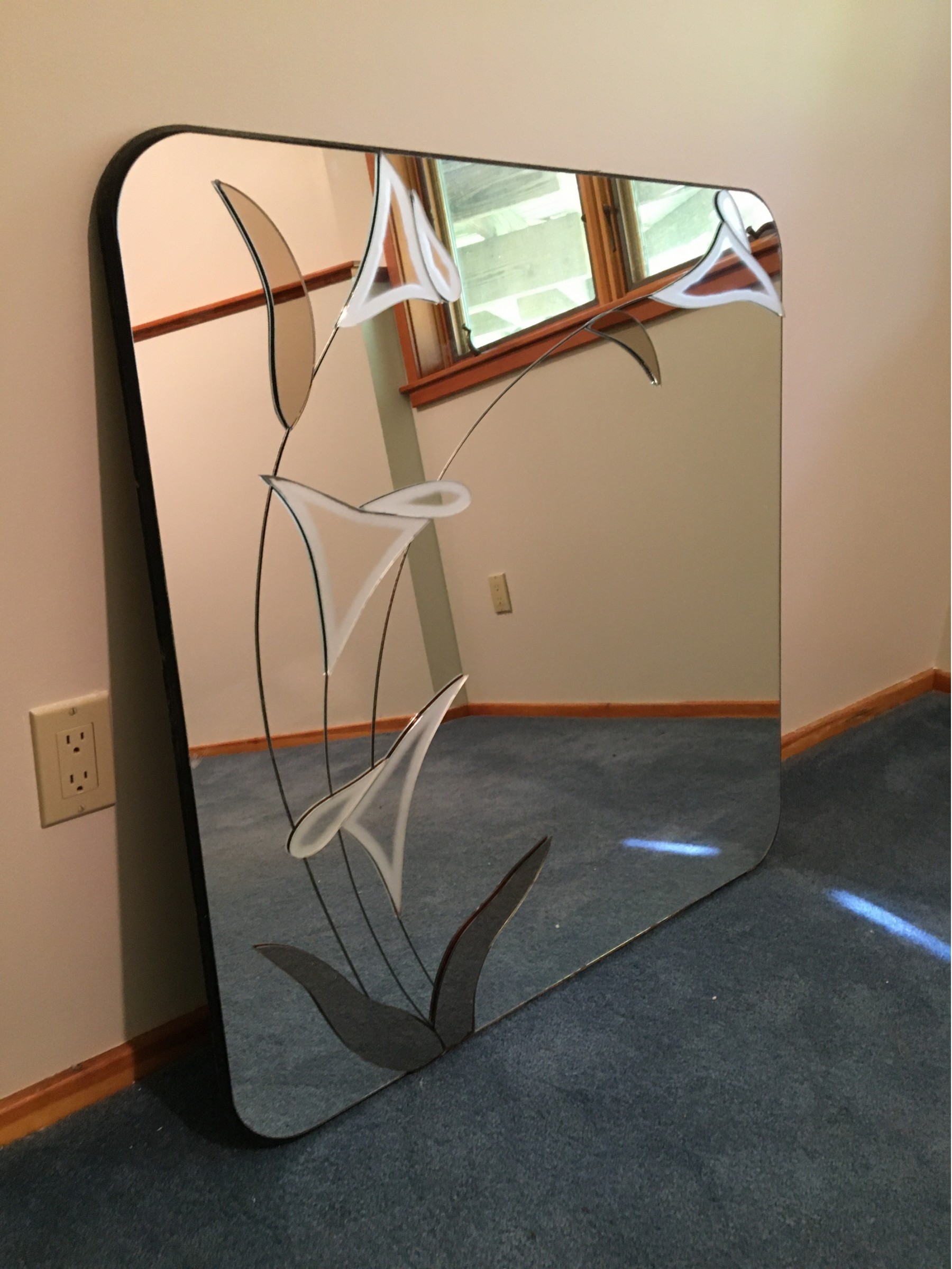 Great 36"x36" frameless mirror with rounded edges and a contemporary floral glass-on-glass style. Perfect decorating accessory to help a small space feel lighter, brighter and roomier, this mirror is also large enough not to get lost on an expansive wall. No flaws noted; excellent used condition.