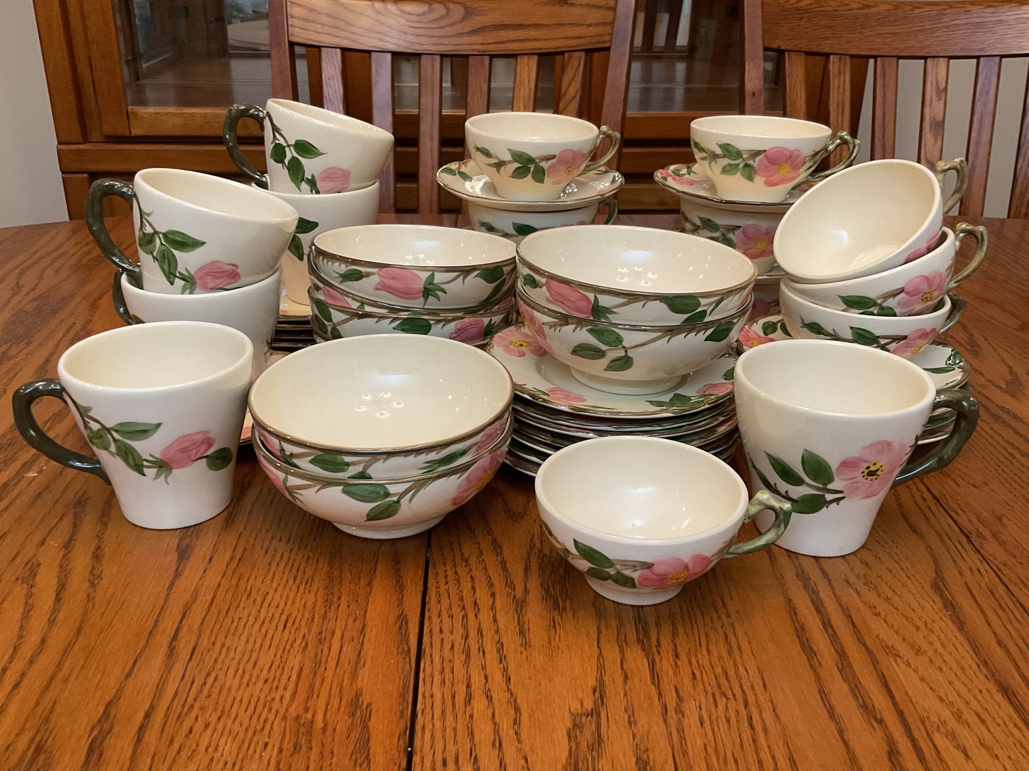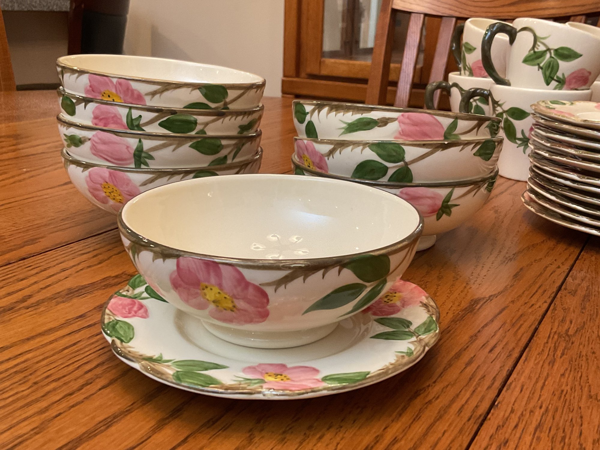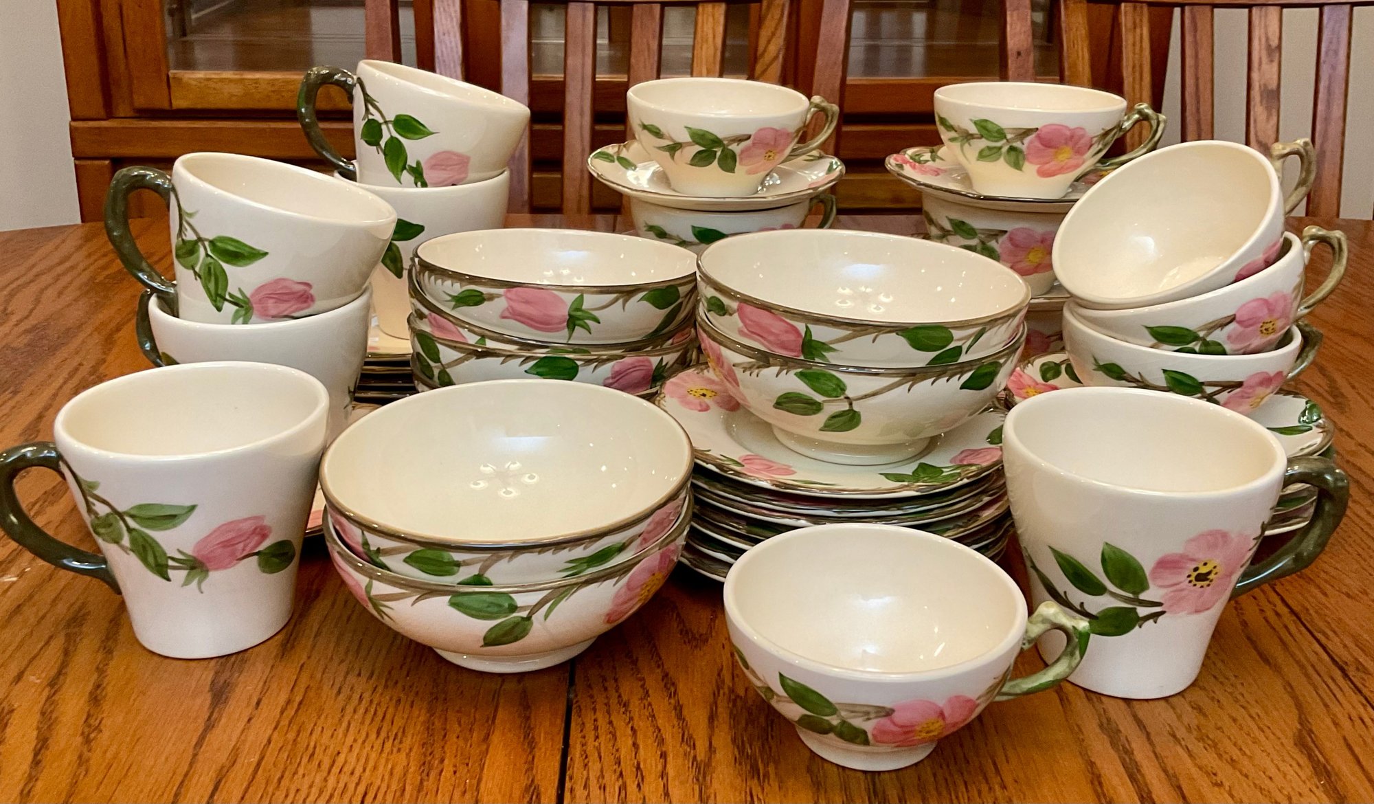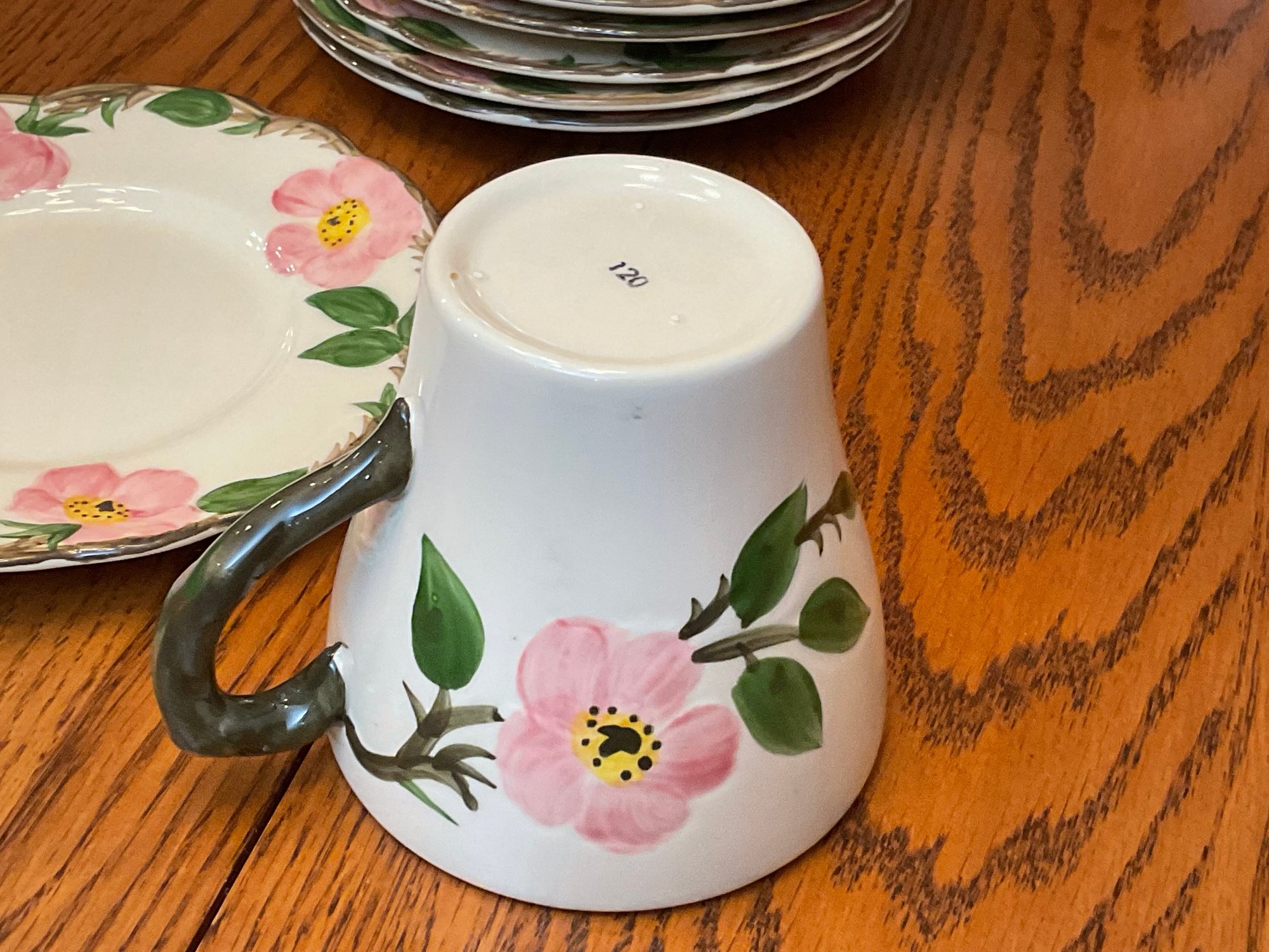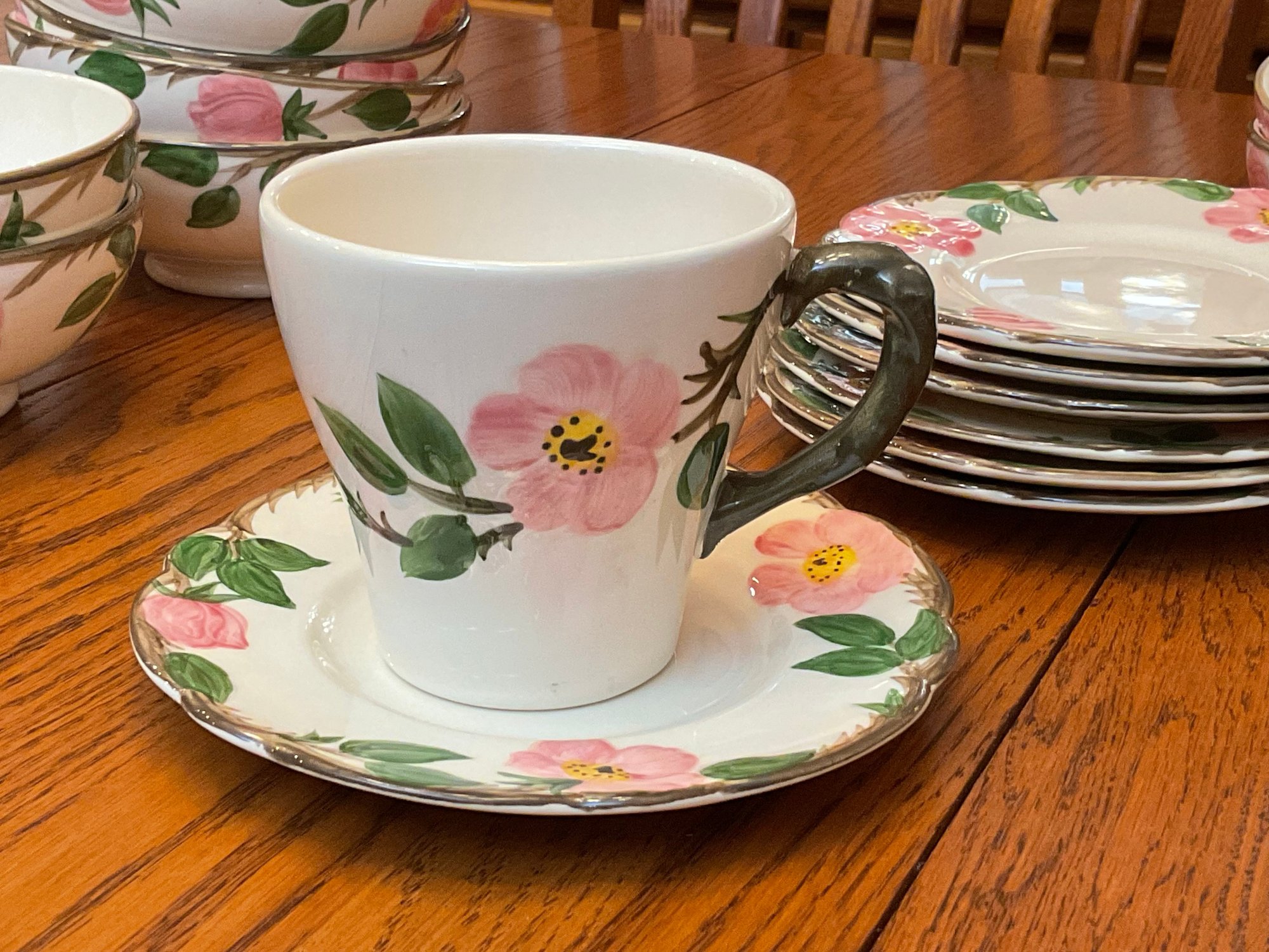 This listing features a classic and extensive set of Franciscan "Desert Rose" hand-decorated earthenware. This iconic pattern, known for its embossed pink roses and rugged vine handles, remains one of the most popular American dinnerware designs. Most pieces in this lot feature the "Made in USA" and "Oven-Safe" backstamps.