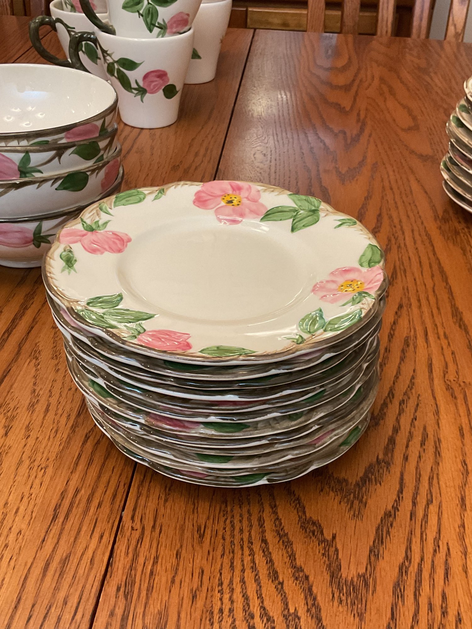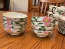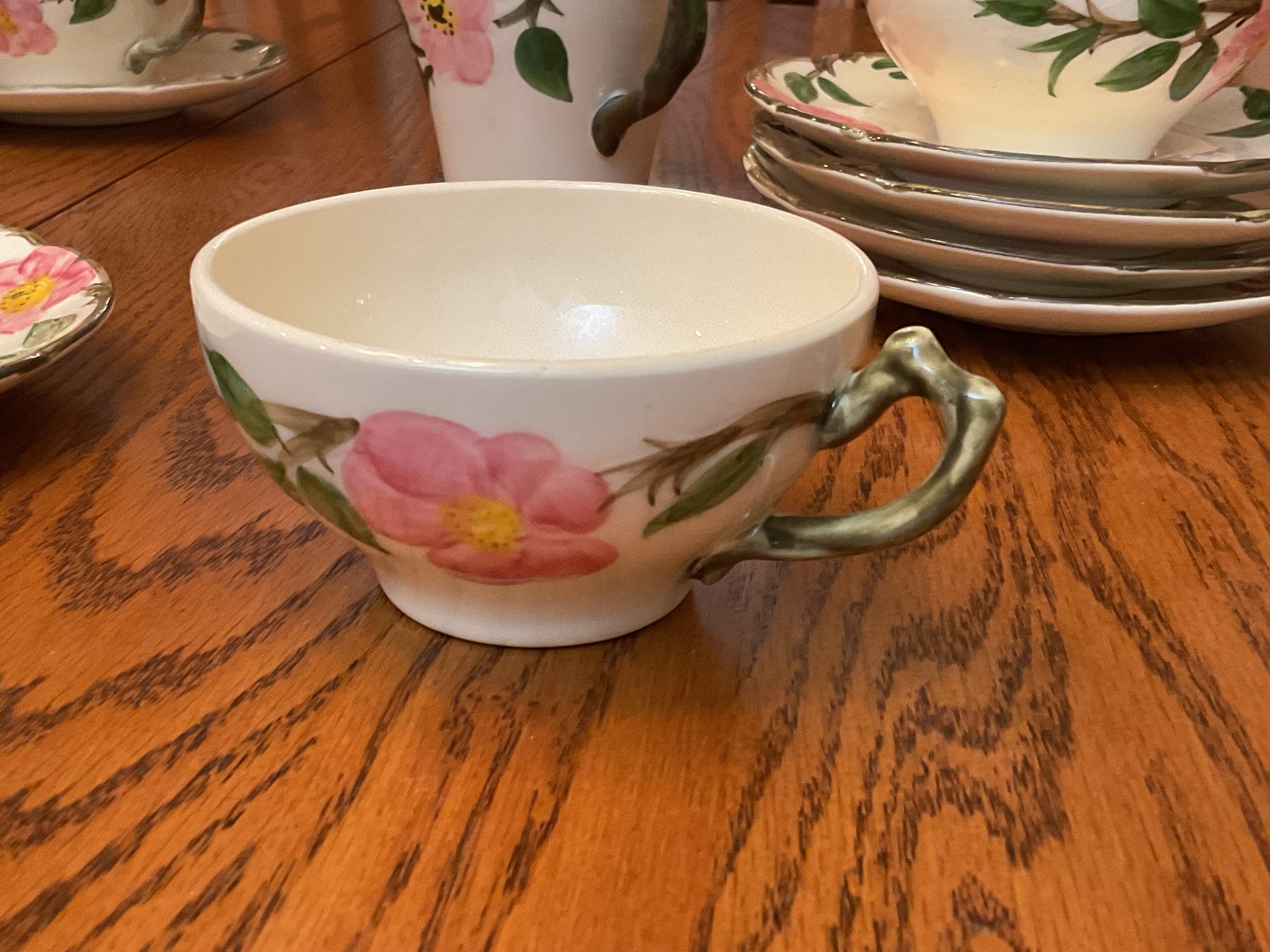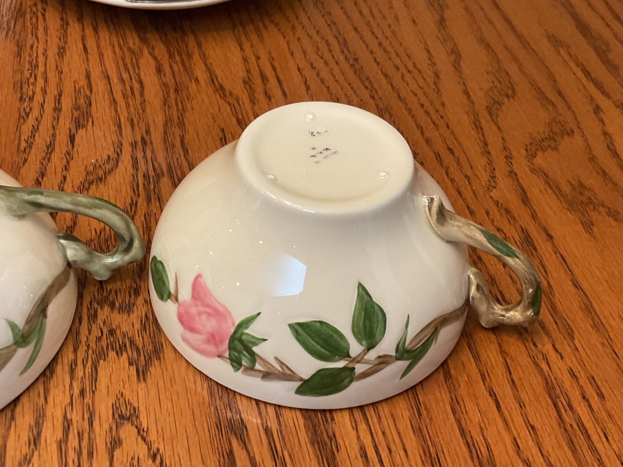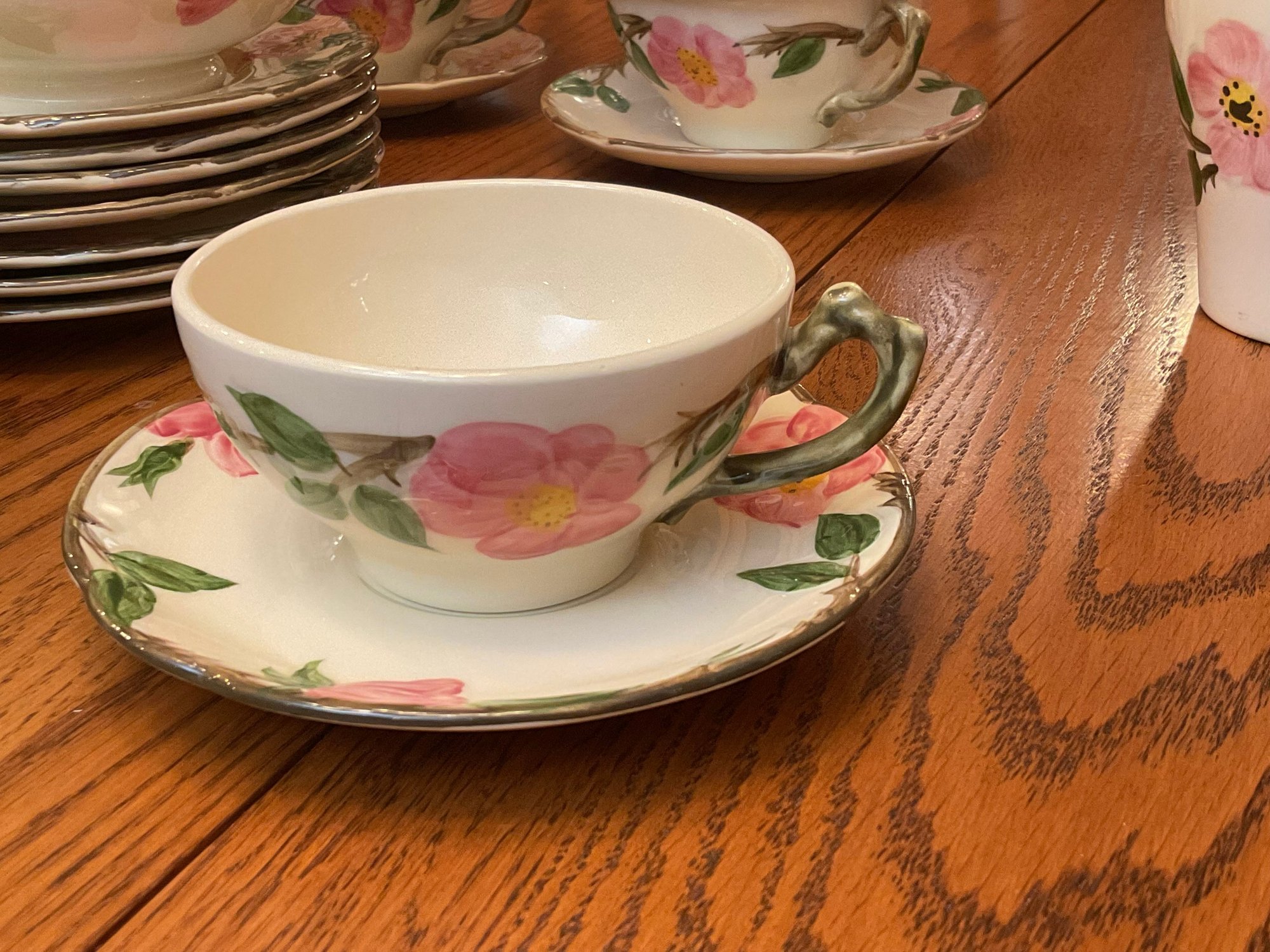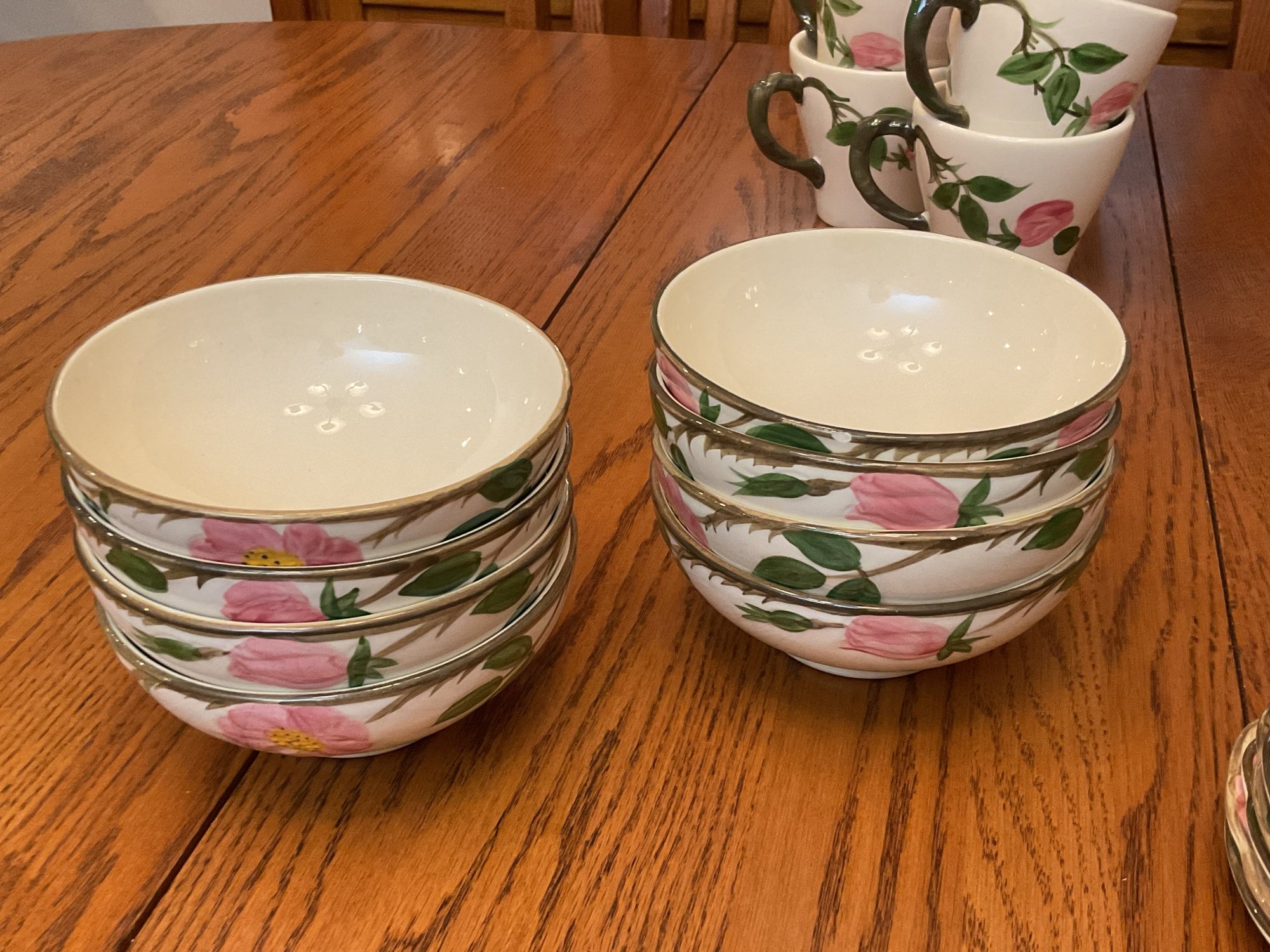 This listing features a classic and extensive set of Franciscan "Desert Rose" hand-decorated earthenware. This iconic pattern, known for its embossed pink roses and rugged vine handles, remains one of the most popular American dinnerware designs. Most pieces in this lot feature the "Made in USA" and "Oven-Safe" backstamps.