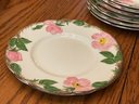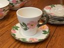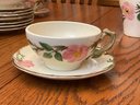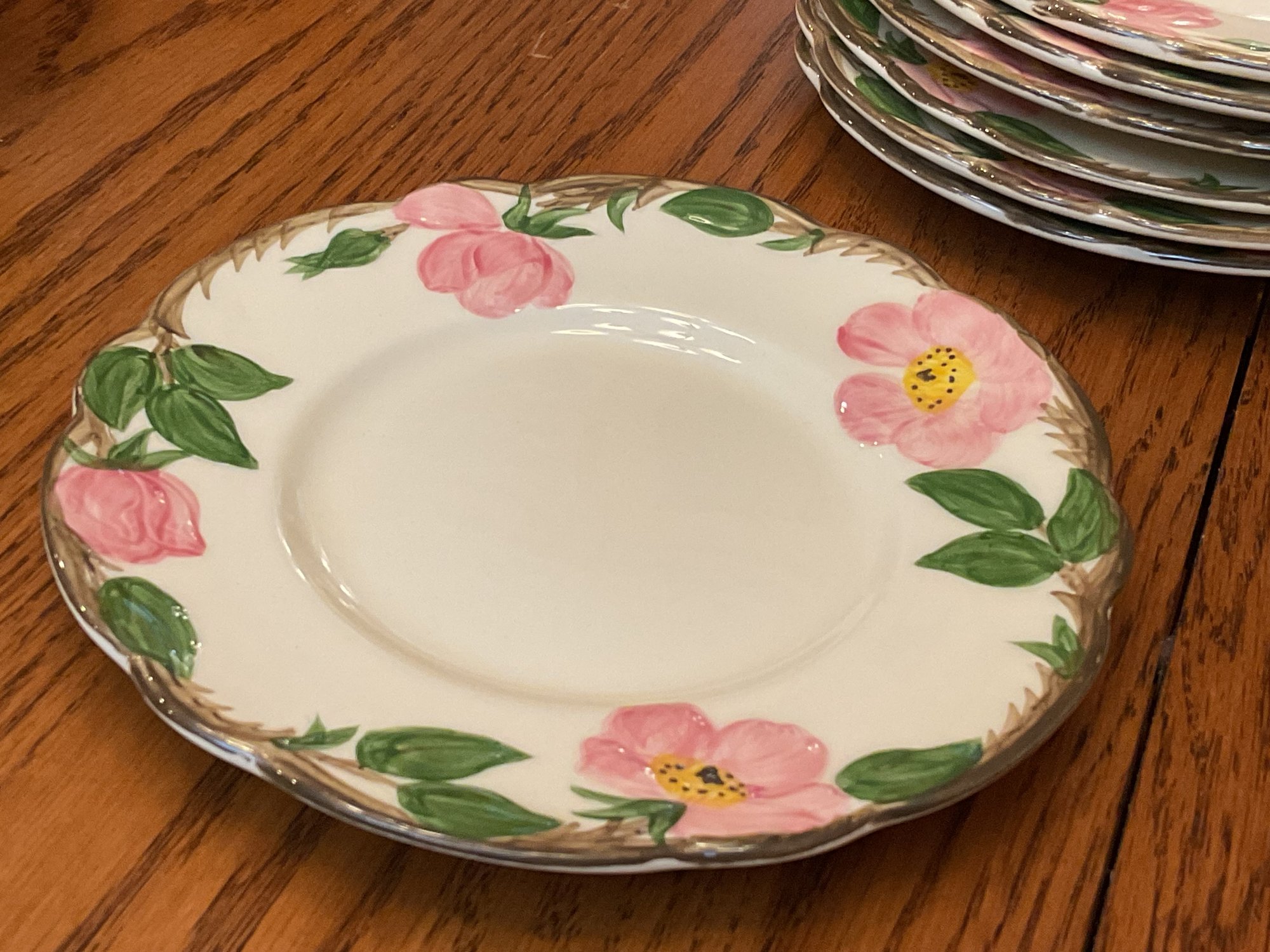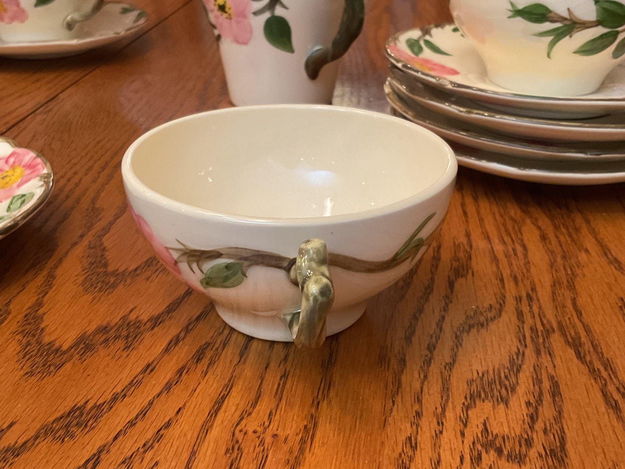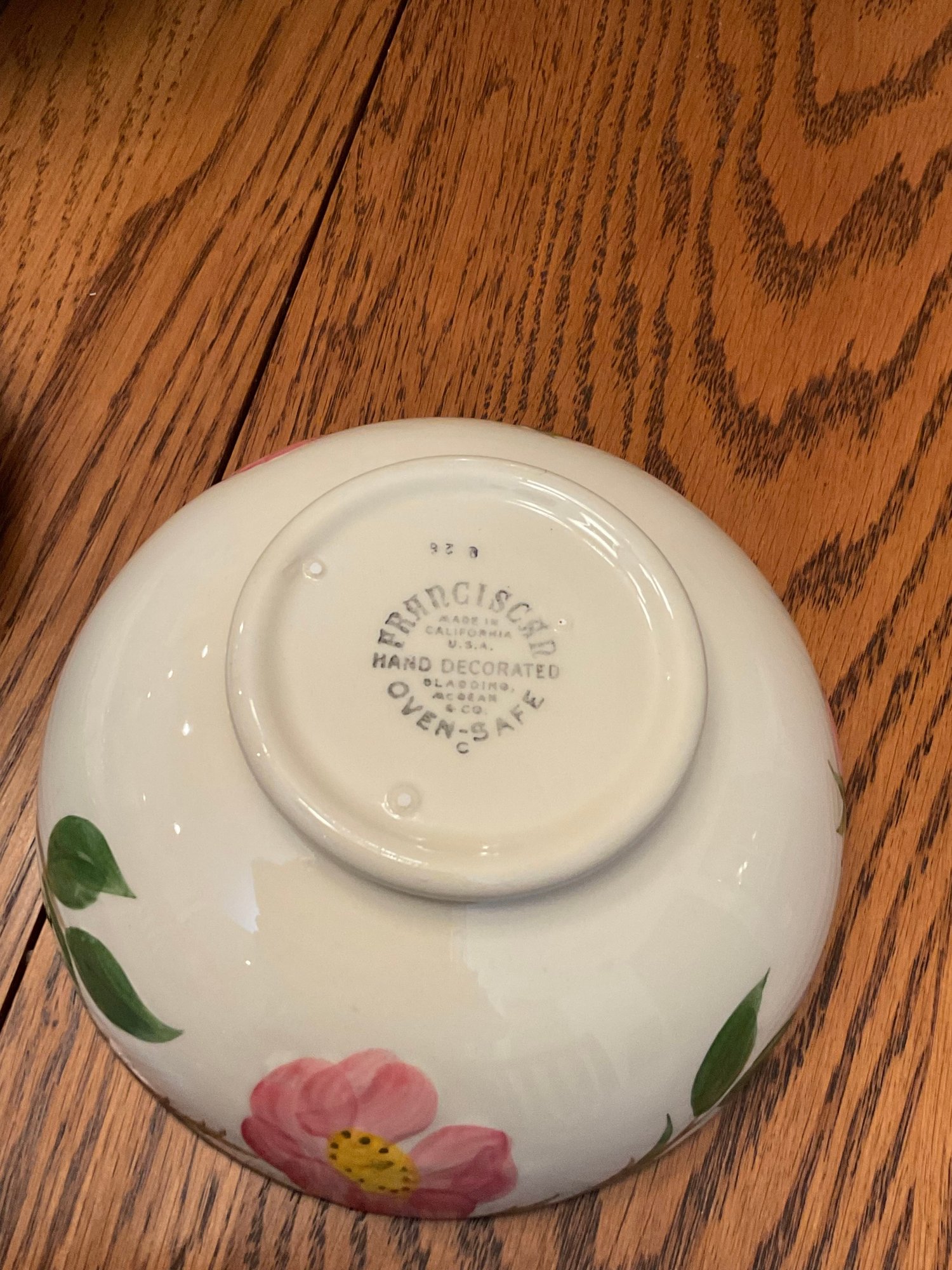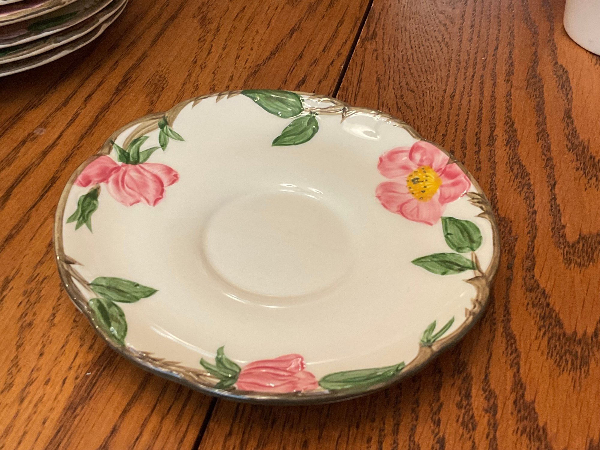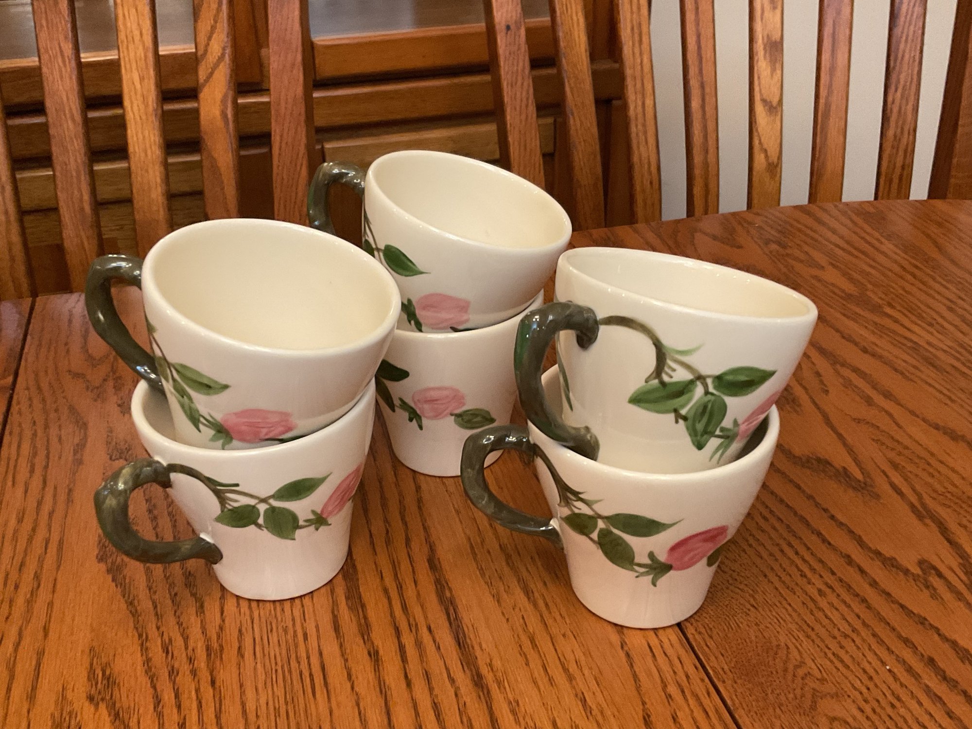This listing features a classic and extensive set of Franciscan "Desert Rose" hand-decorated earthenware. This iconic pattern, known for its embossed pink roses and rugged vine handles, remains one of the most popular American dinnerware designs. Most pieces in this lot feature the "Made in USA" and "Oven-Safe" backstamps.