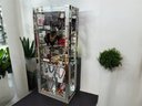 This floor model display case has clear glass on the front and sides, and the back is mirror mounted on board. The glass is framed by 3" wide beveled mirror. Access is through both sides, which are magnetized doors with small chrome handles. There is some damage to the front mirror framing on the front corners down near the floor, where it is hardly noticeable.