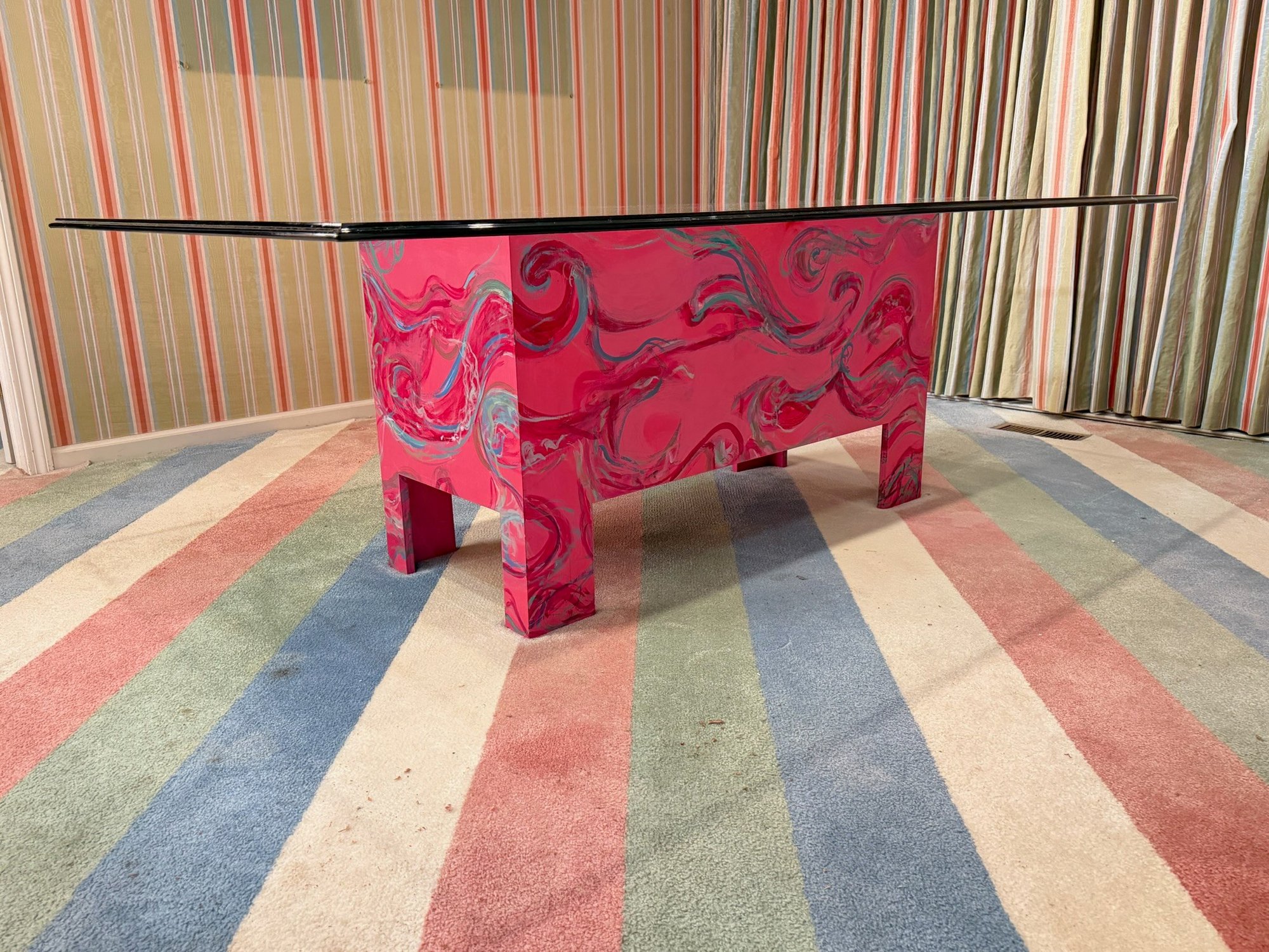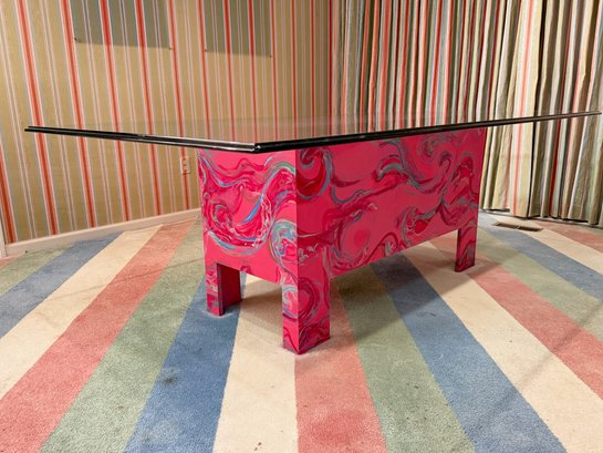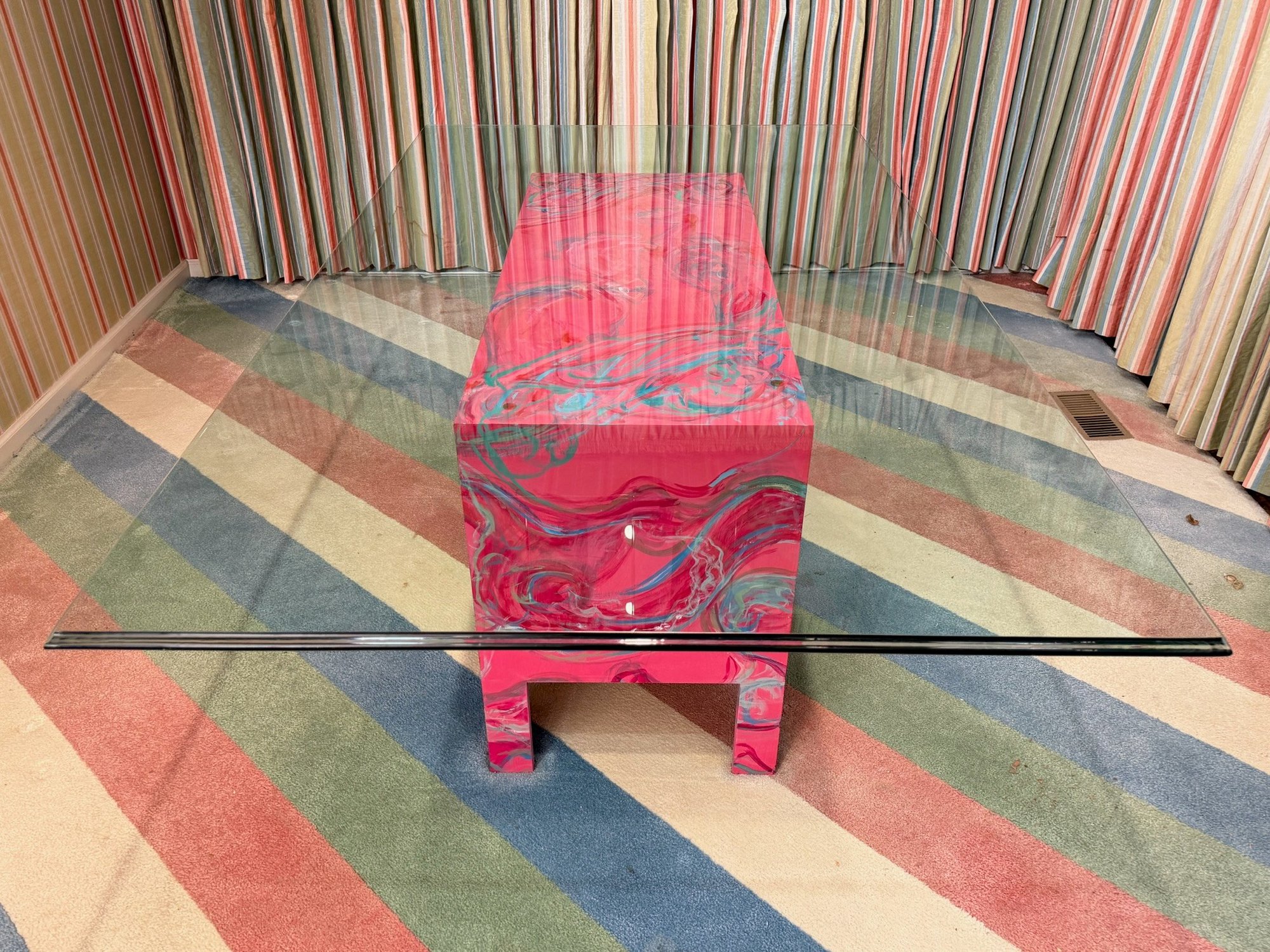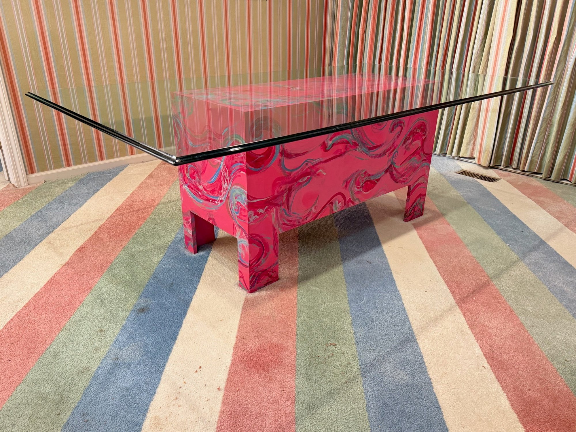 Painted wood base, glass top with small chip, 3/4" thick glass with beveled edge. 84" x 48" x 28" height, base is 48" x 20" x 28". Sold As Is.