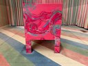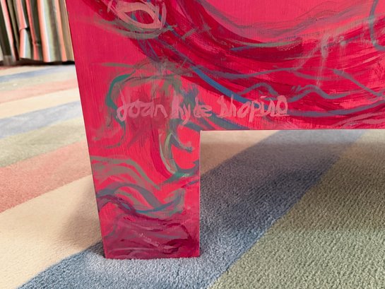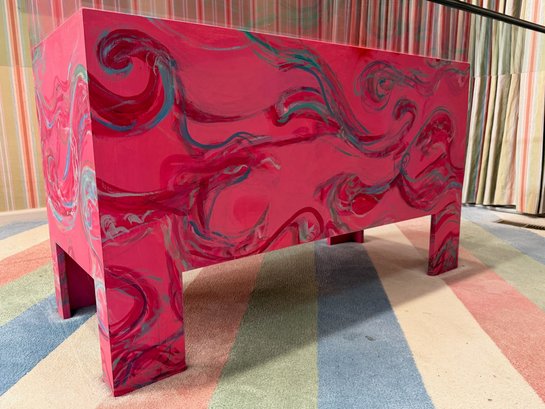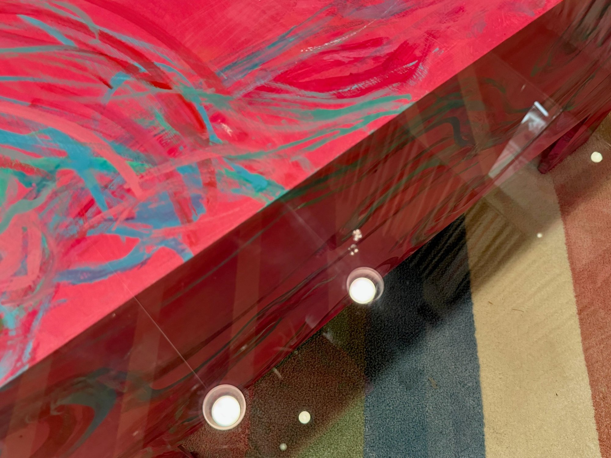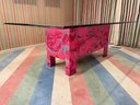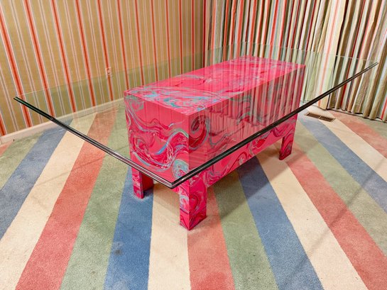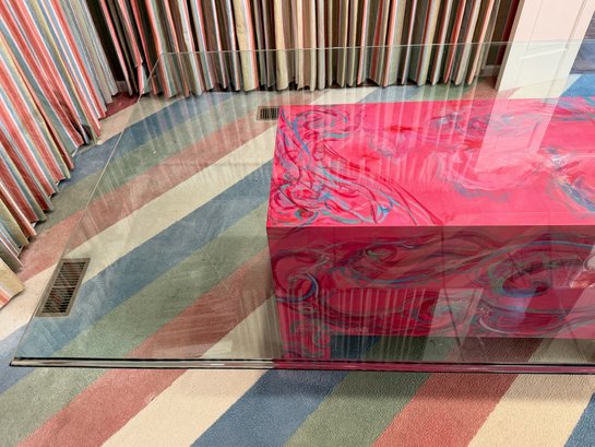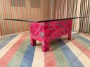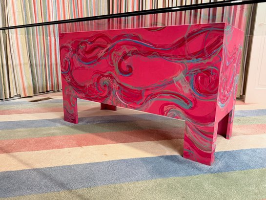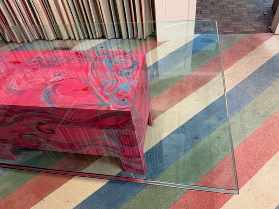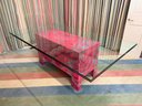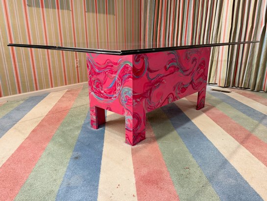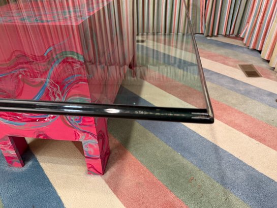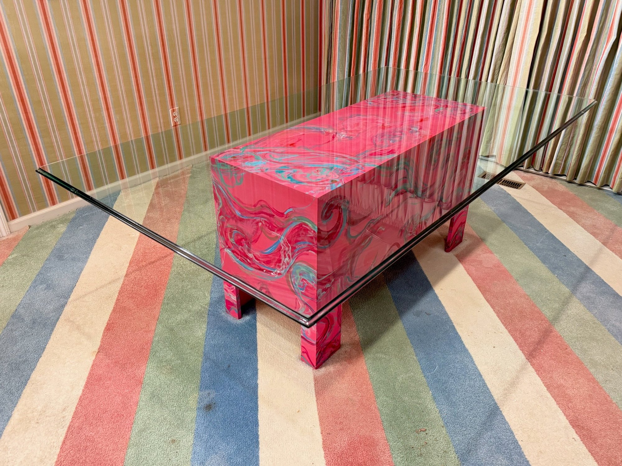 Painted wood base, glass top with small chip, 3/4" thick glass with beveled edge. 84" x 48" x 28" height, base is 48" x 20" x 28". Sold As Is.