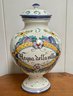 A spectacular large Italian handmade and hand painted lidded jar. It reads "Acqua della villa" meaning water from the villa. It has "Made in Italy" on the bottom. It's in very good overall condition but note one slight 1/4" touch up on the blue band on the rim - hardly noticeable. The jar measures 15" by 8 1/2" at the widest point.