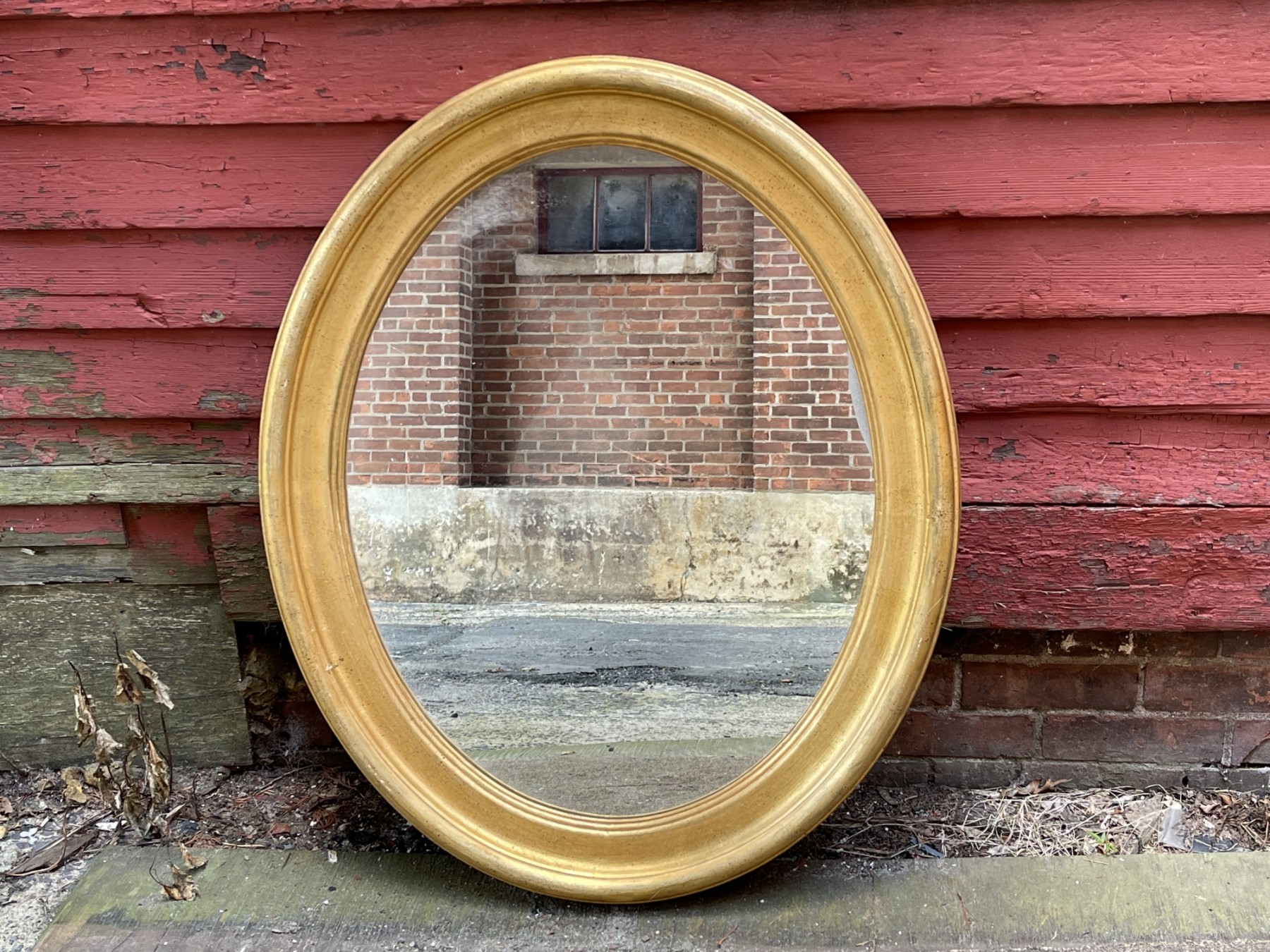 A fantastic Italian made oval mirror measuring 36x29 inches. It’s gold toned frame has some nice character to it. It comes with a wire on the back.