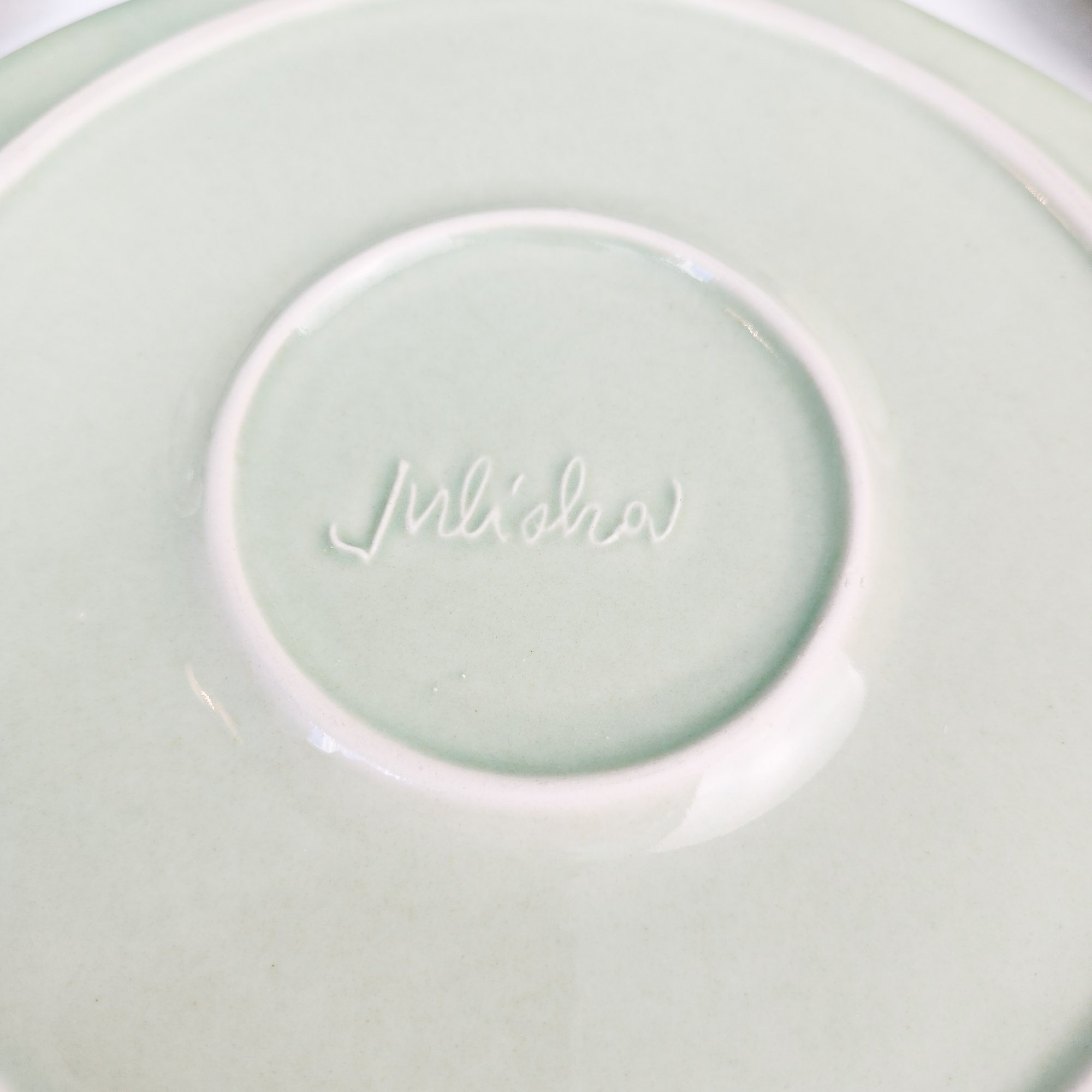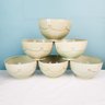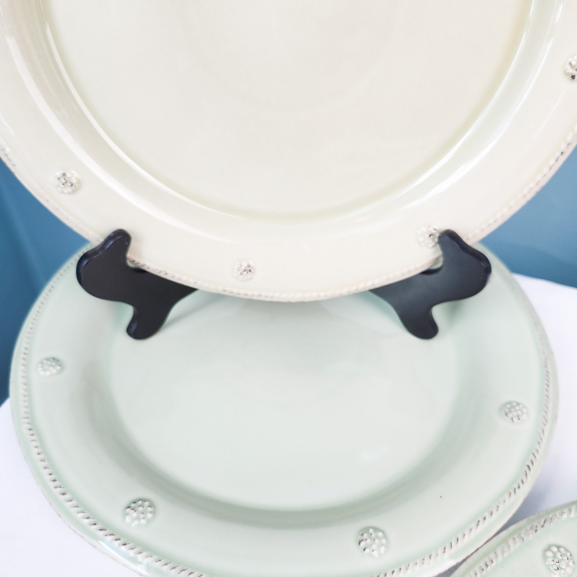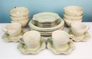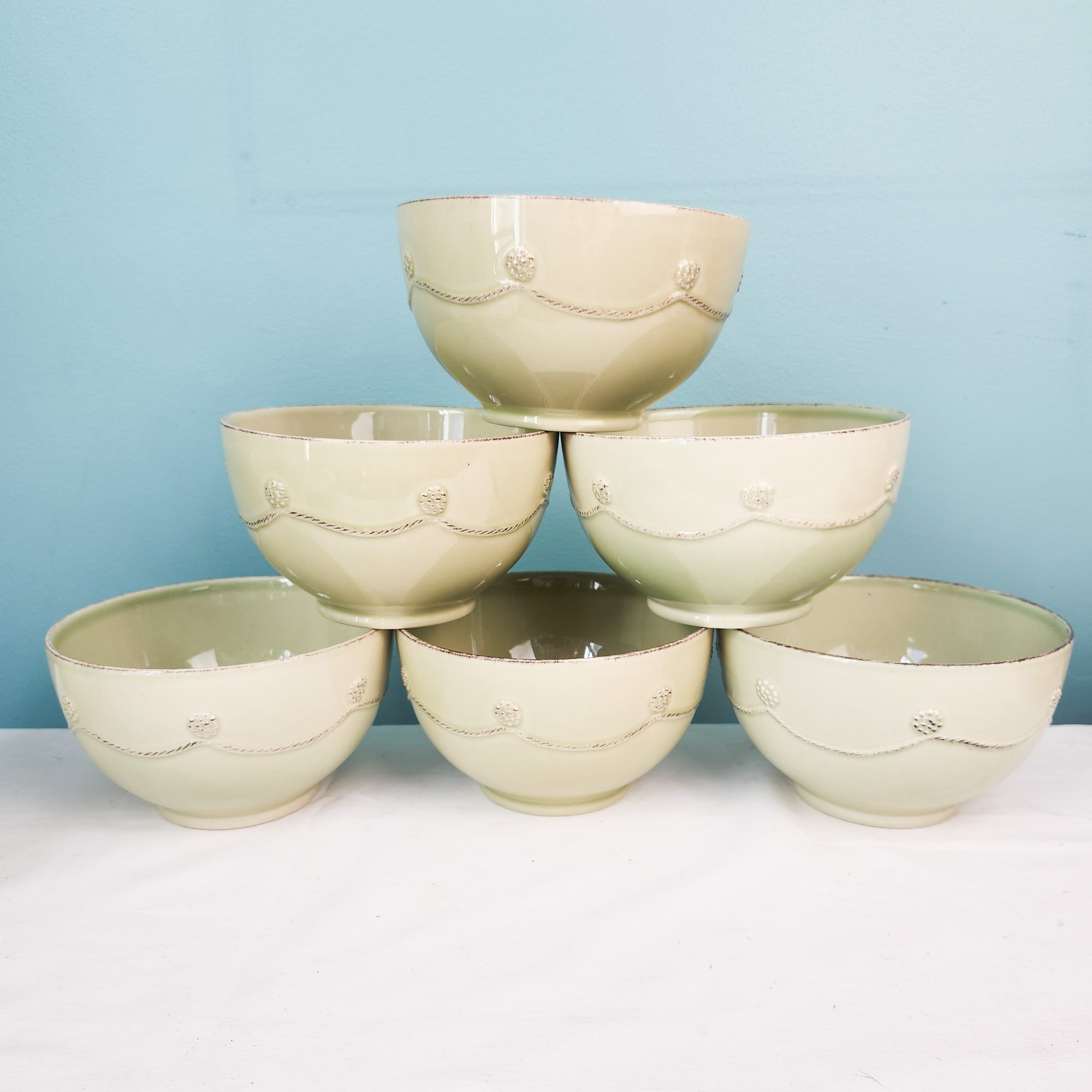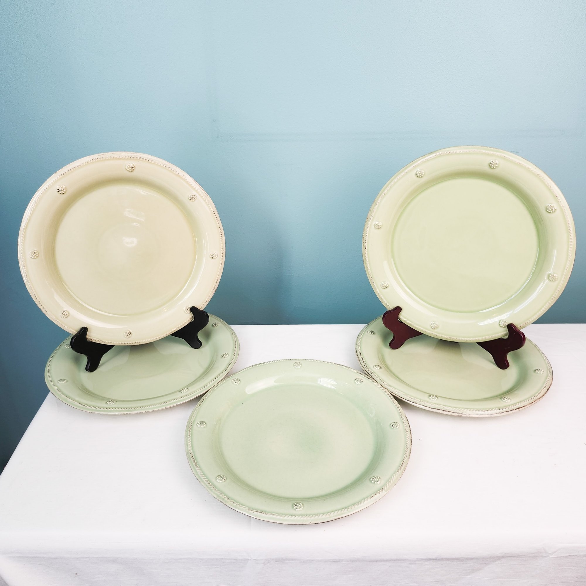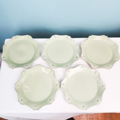 Pretty green dish set including 5 dinner plates, 5 dessert plates, 4 cups and saucers, and 6 soup bowls. All by Juliska in there iconic Berry and Thread pattern. Measurements are of a dinner plate.