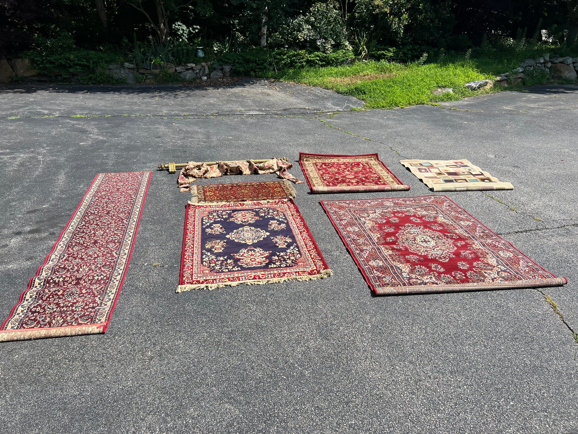 Sold as is, all need a cleaning. Some older, some newer. Sold as is, need cleaning and have wear. Also has a curtain.