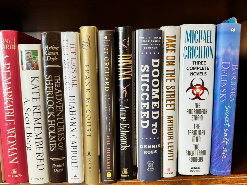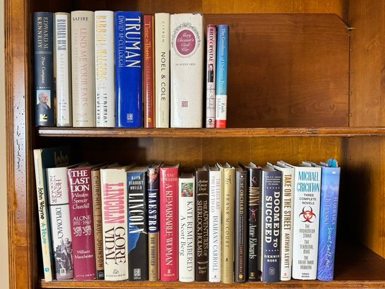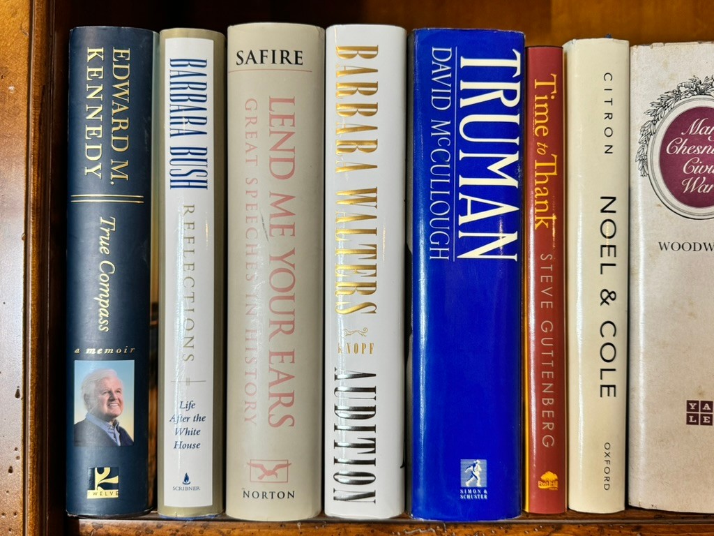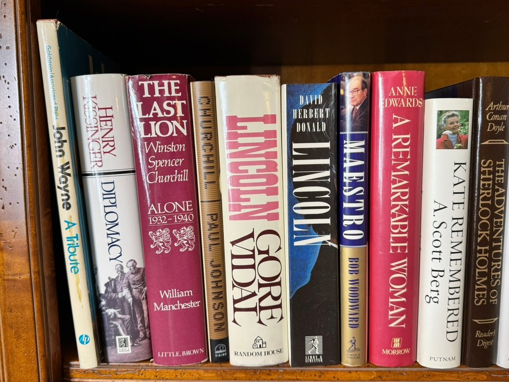 A substantial and varied grouping of hardcover books spanning biography, presidential history, diplomacy, literature, and modern fiction.