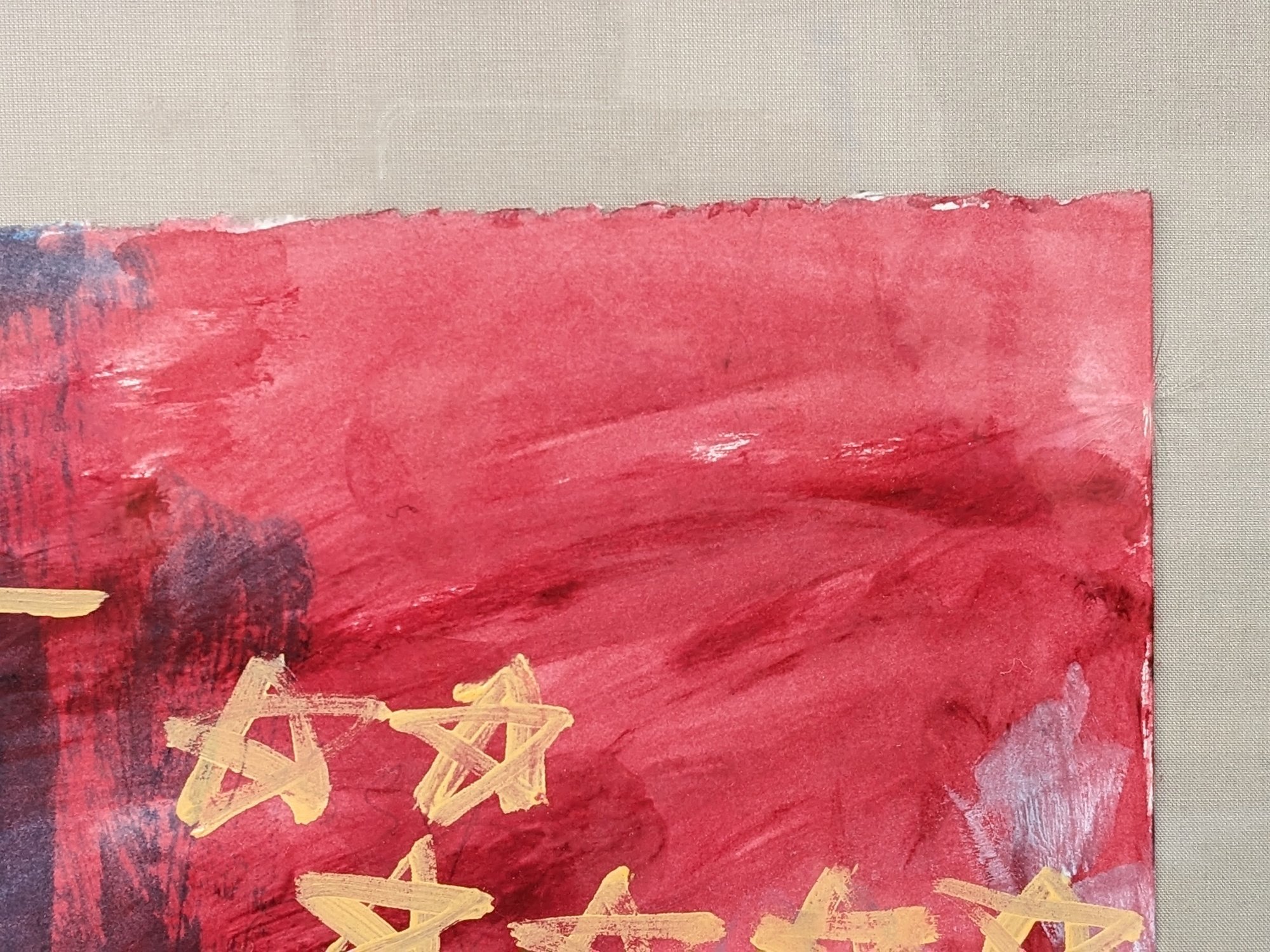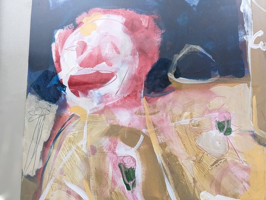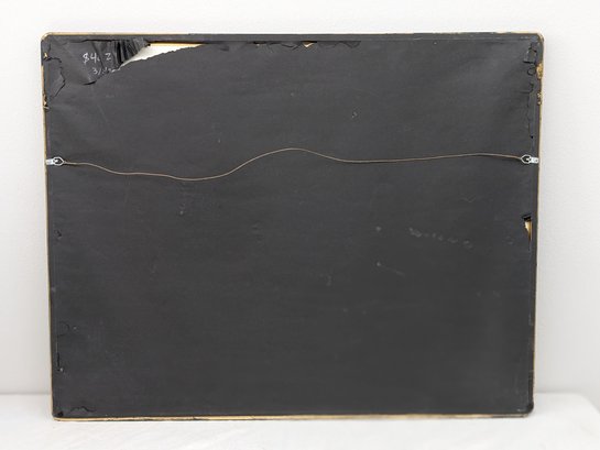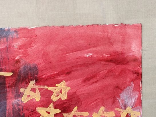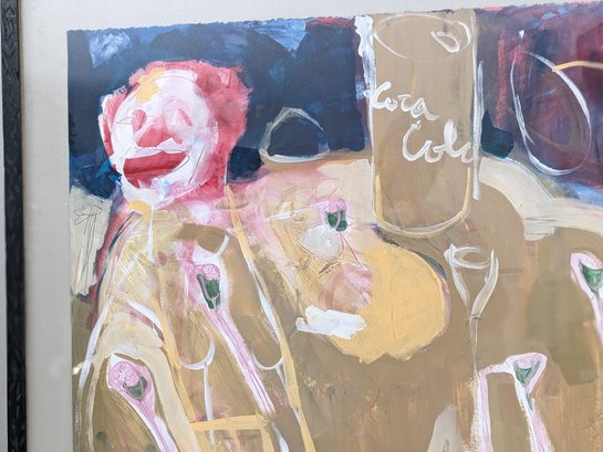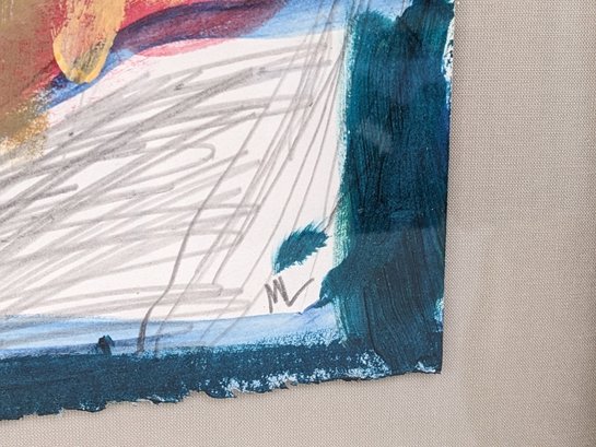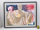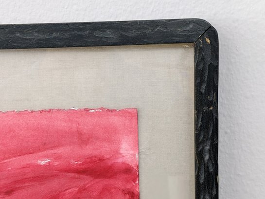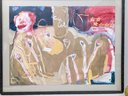 This is a very interested abstract painting. The frame and plexiglass have some wear from age and use.