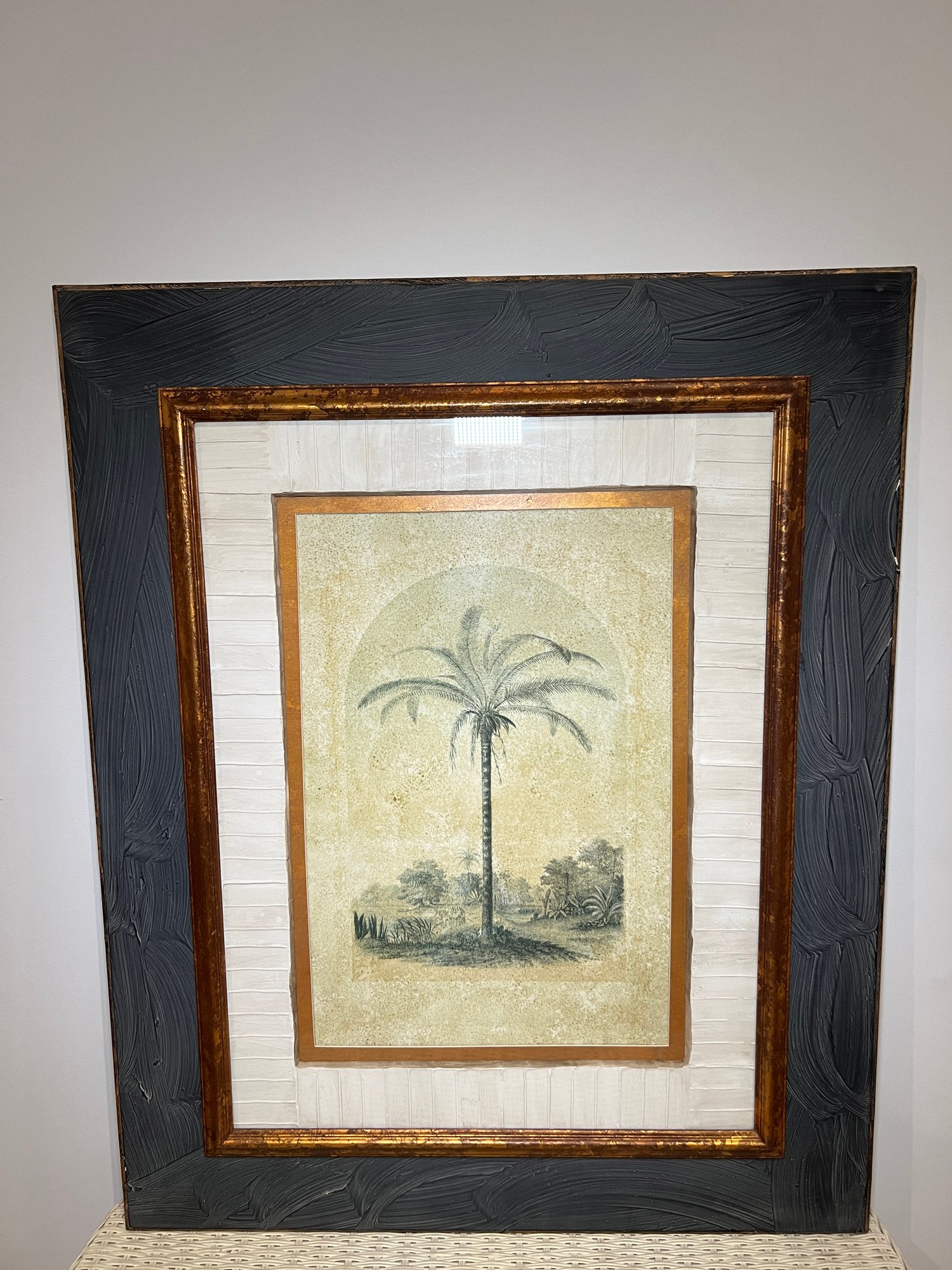 Substantial beautifully framed print of an antique style palm tree illustration in grayscale.