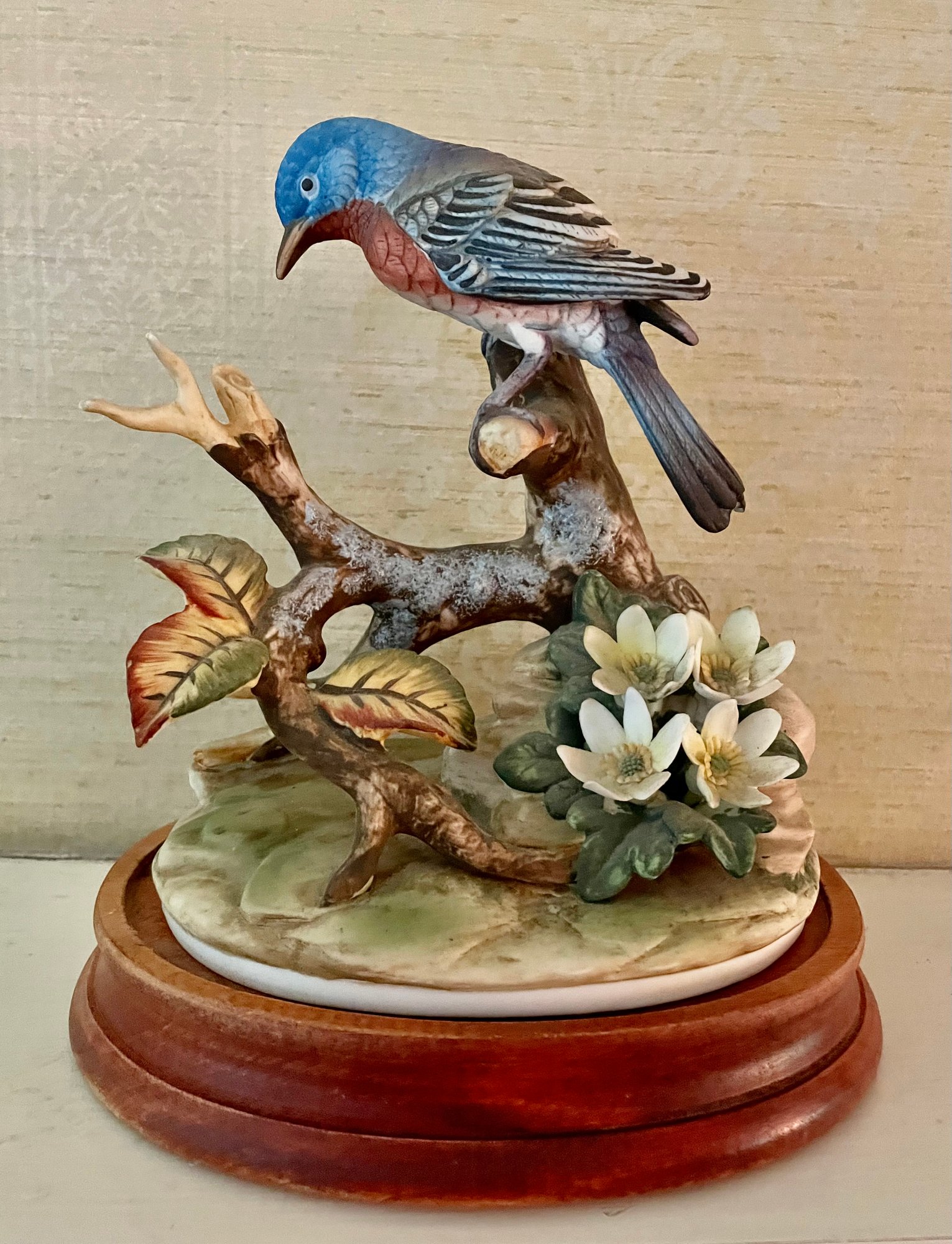 A nice large size vintage porcelain blue bird on branch - resting on a wooden plinth. It was made in Japan marked "by Andrea" and "Andrea by Sadek". It's in excellent condition. It measures 8" high.