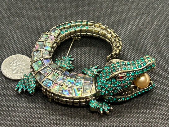 I used a quarter to showcase its' substantial scale. The alligator's body is encrusted in green stones, with ruby-colored eyes, abalone scutes, and a large faux pearl in its' open mouth. Condition is excellent.
