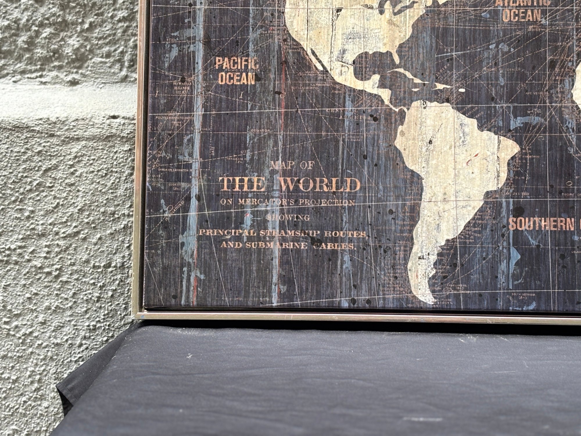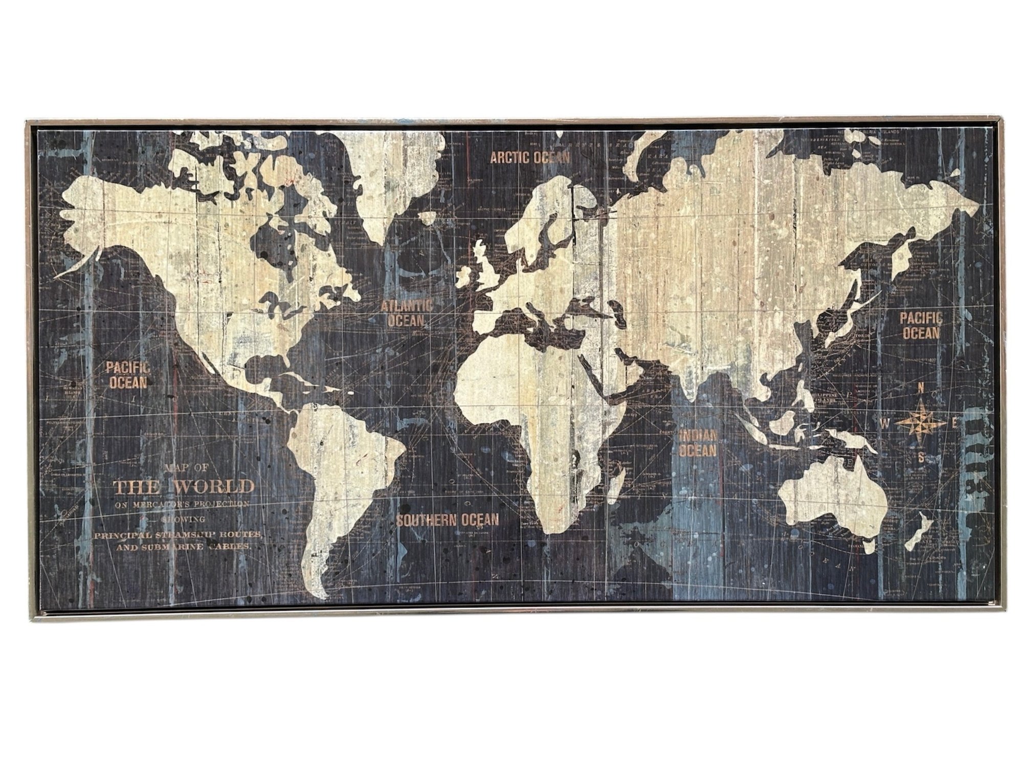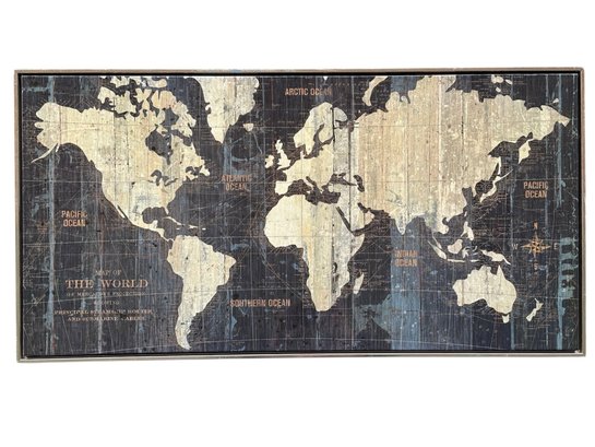 Large-scale world map panel with a deliberately weathered, timeworn look that feels pulled from a captain’s study or a well-traveled loft wall. Rendered in deep inky blues and warm parchment tones, the continents pop against a gridded Mercator-style backdrop with labeled oceans and classic cartographic detailing. The distressed finish gives it instant character—no passport required. Cleanly framed and ready to hang, this piece makes a bold statement without shouting… it really maps out the room.
