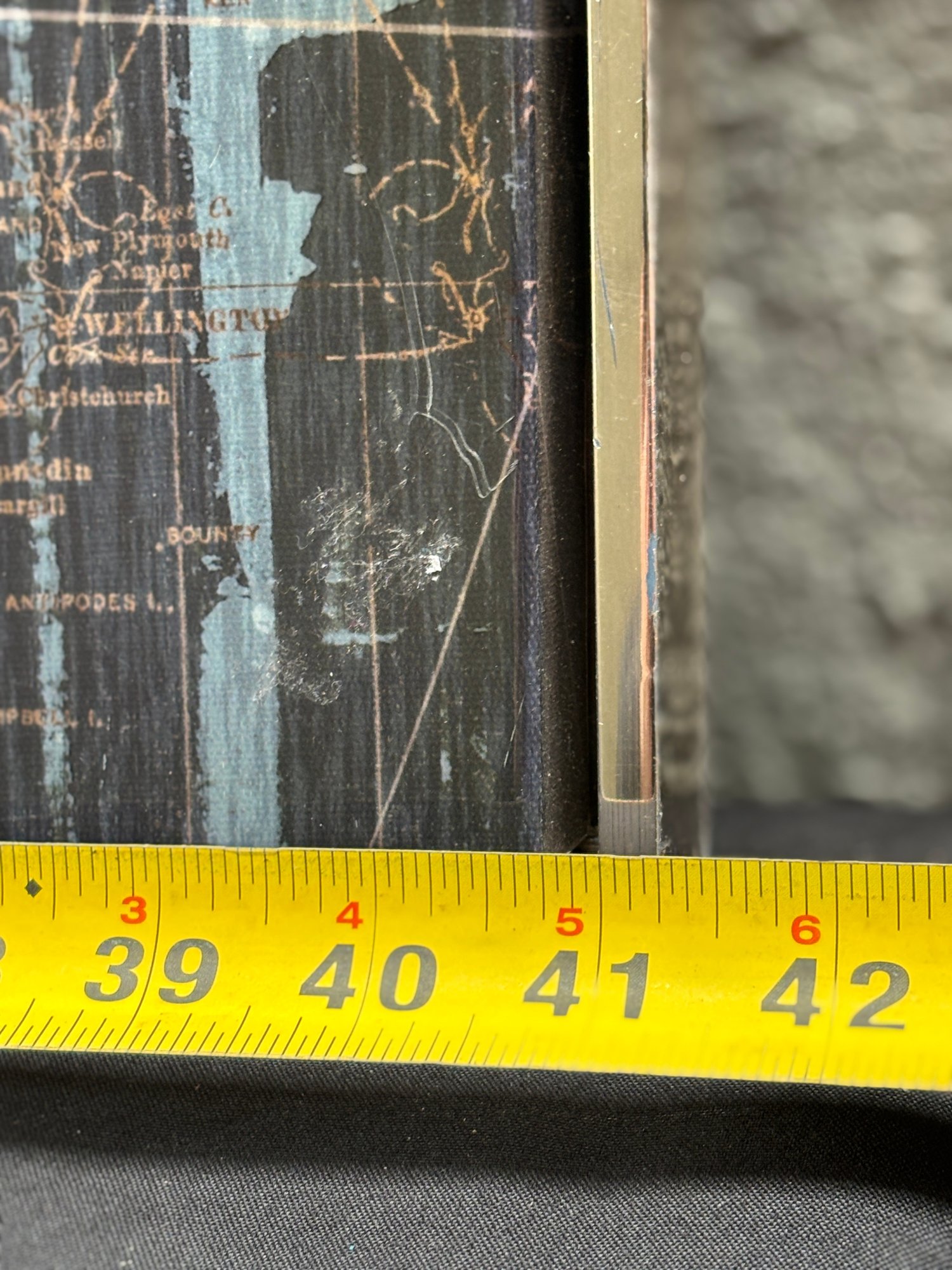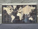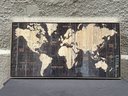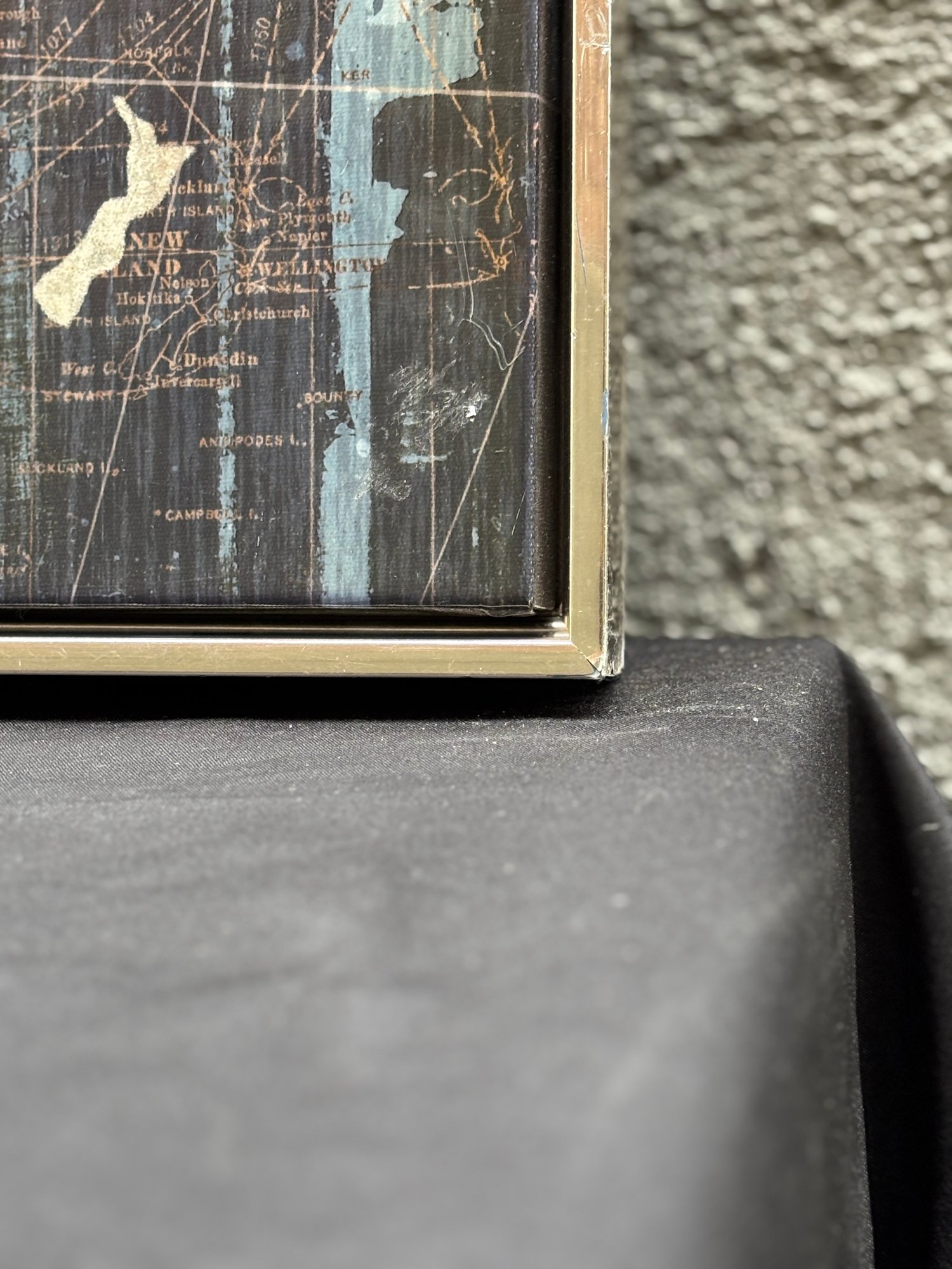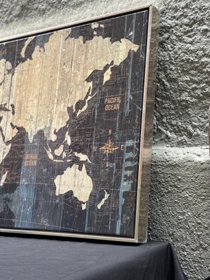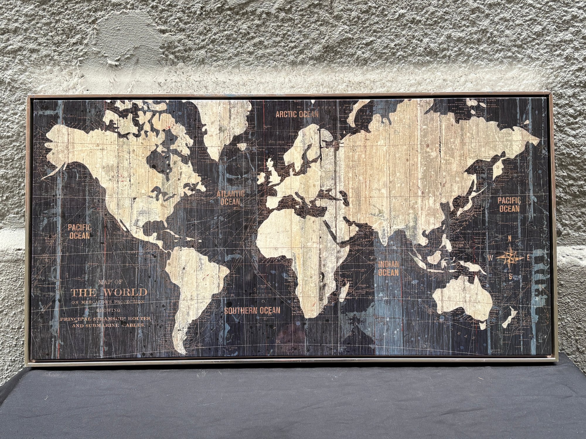 Large-scale world map panel with a deliberately weathered, timeworn look that feels pulled from a captain’s study or a well-traveled loft wall. Rendered in deep inky blues and warm parchment tones, the continents pop against a gridded Mercator-style backdrop with labeled oceans and classic cartographic detailing. The distressed finish gives it instant character—no passport required. Cleanly framed and ready to hang, this piece makes a bold statement without shouting… it really maps out the room.