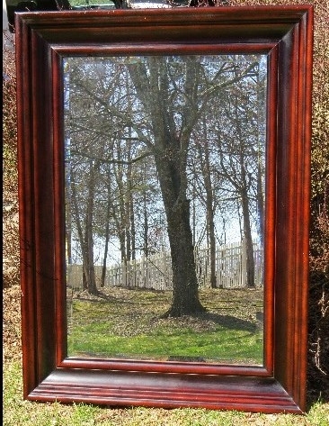 Over the mantle, in the hall, bedroom, plenty of spaces & places for this attractive beveled glass mirror. Contemporary, but has that Early Americana 19th C. look to it. Measures 46" long x 33.5" wide. Few light finish scratches & corner edge wear.