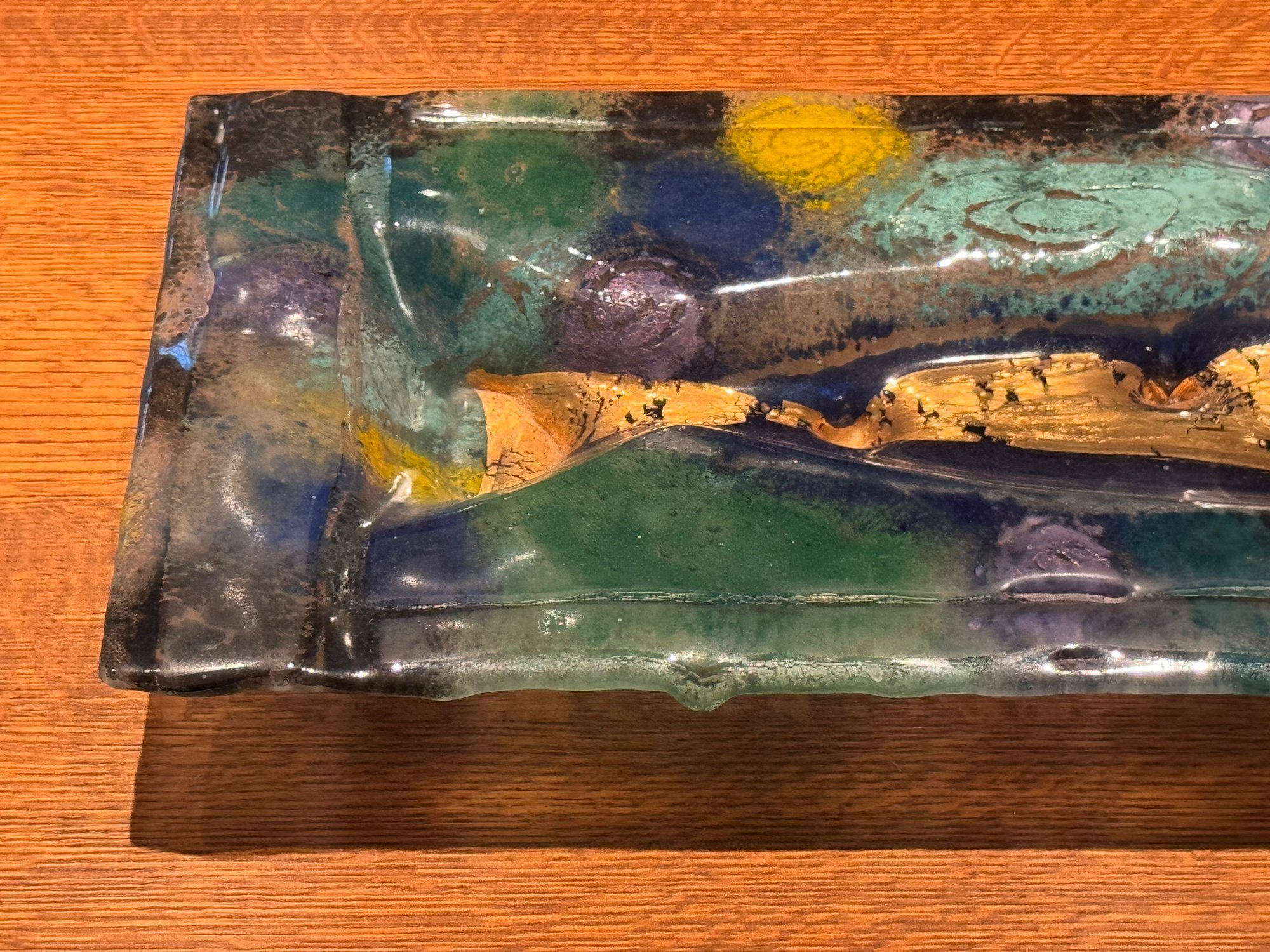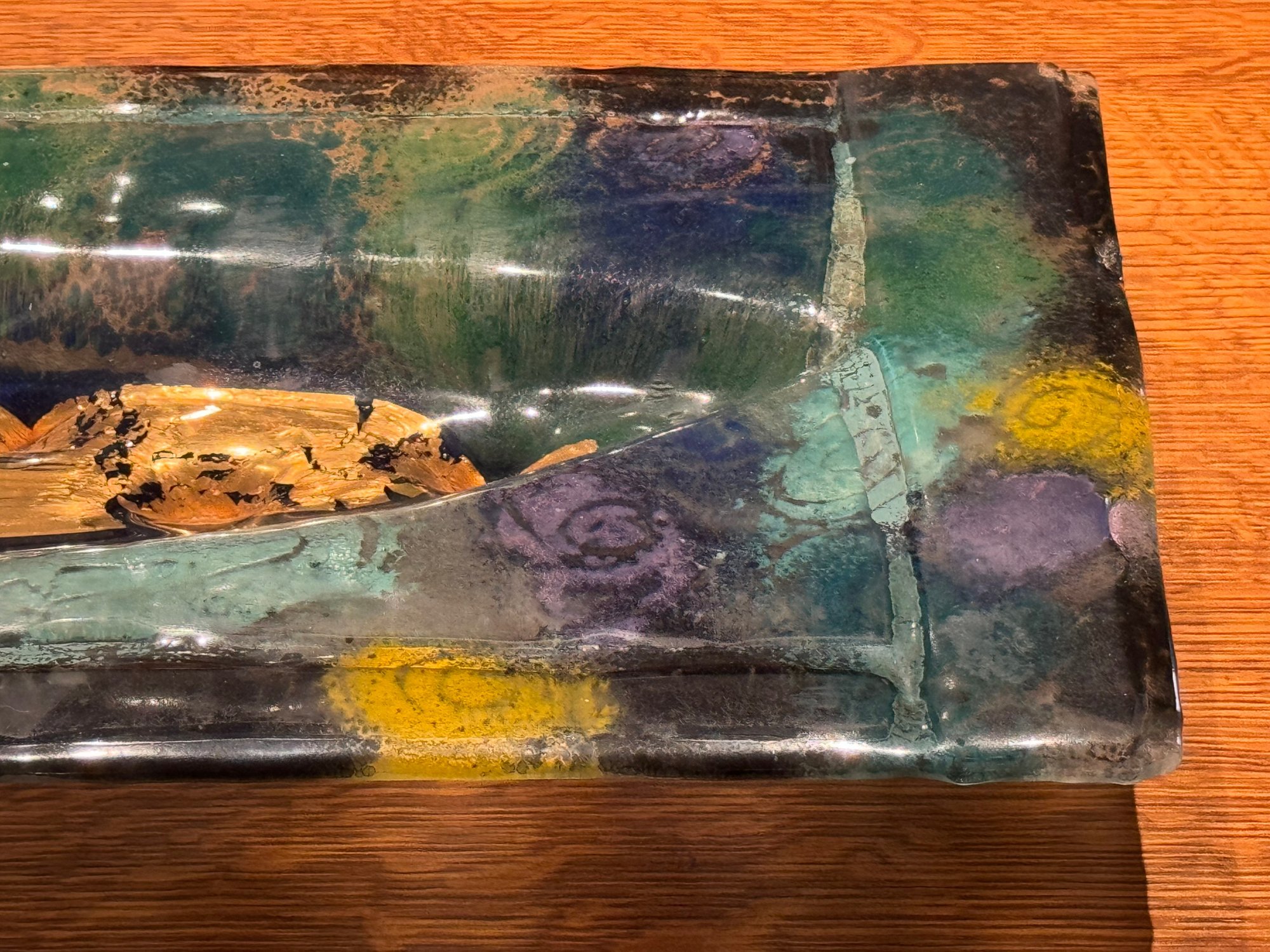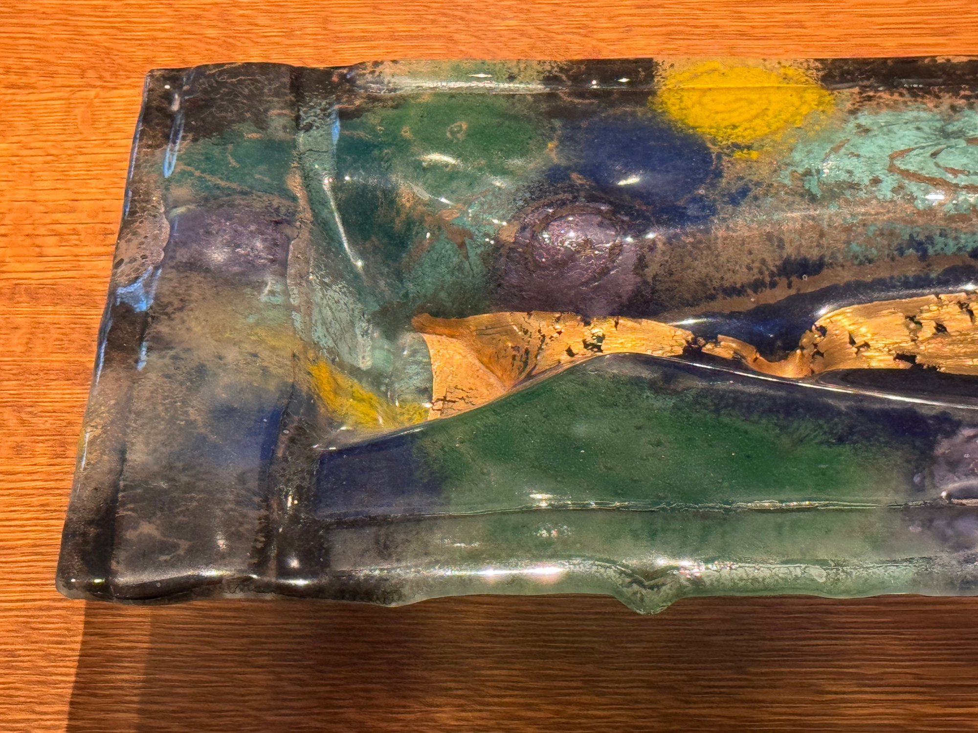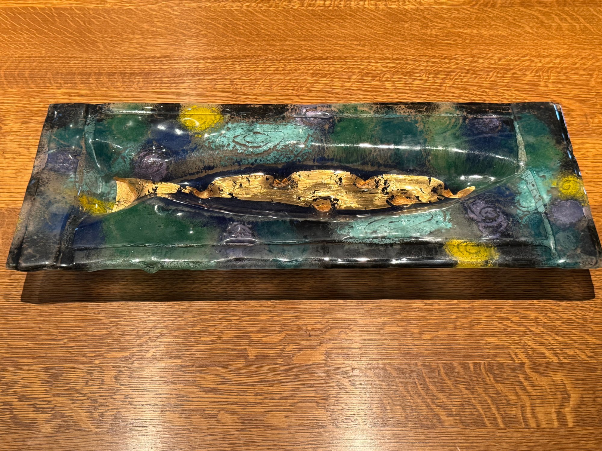This beautiful handmade large artisan dish was purchased in Iceland and made by the artist Ulla Sand. Made of glass in deep rich colors of sea blue, green and black with bright gold accents. Can be used decoratively on a stand or placed on table top. Signed bottom corner Ulla Sand. Size 26 L x 10 D x 1.75 H. In very nice condition. Beautiful and Amazing in person!