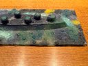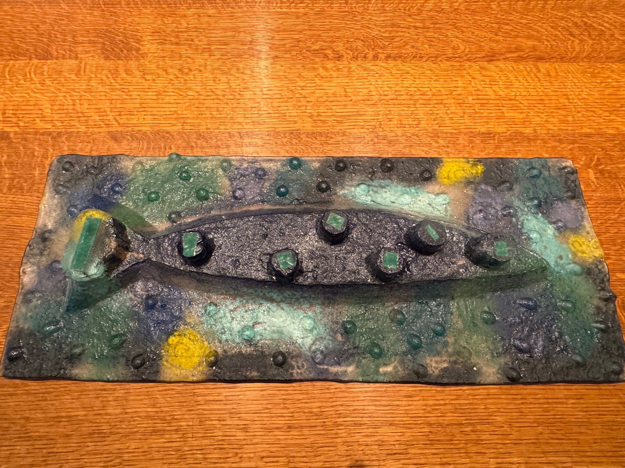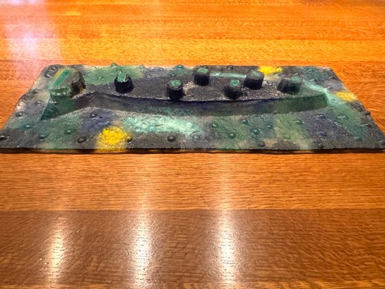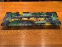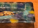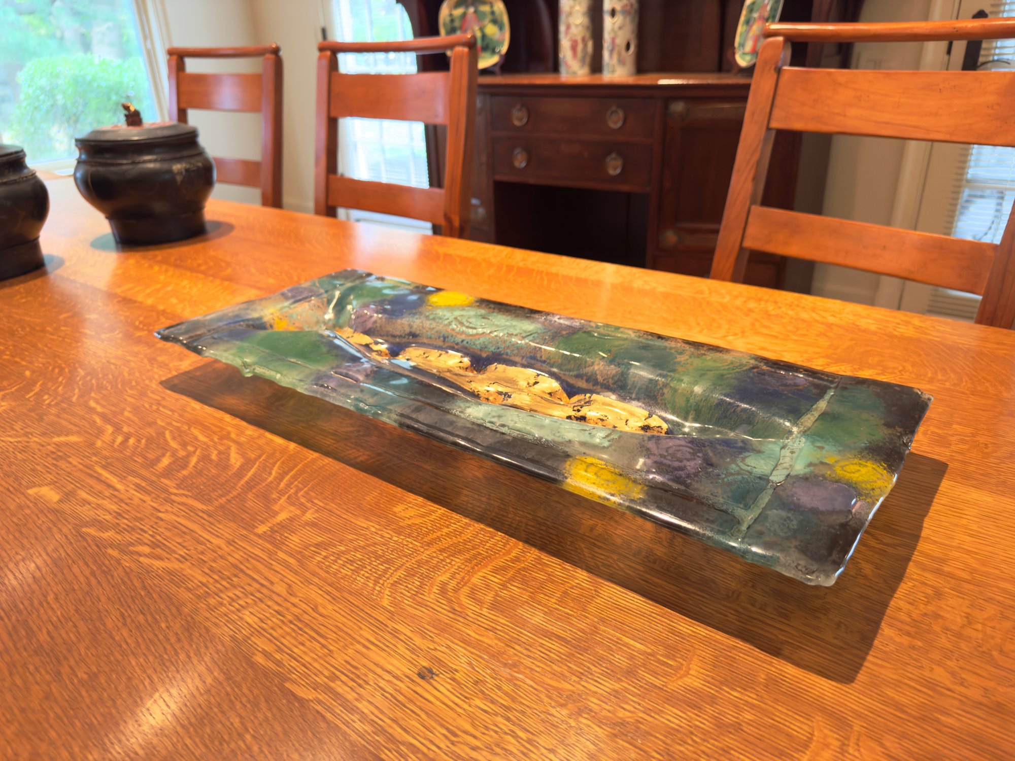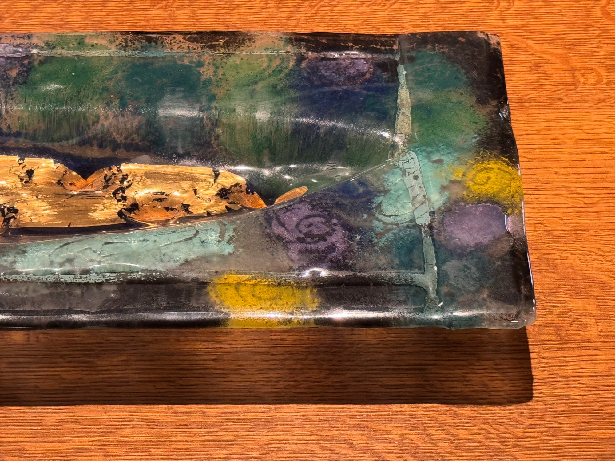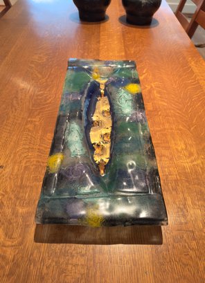 This beautiful handmade large artisan dish was purchased in Iceland and made by the artist Ulla Sand. Made of glass in deep rich colors of sea blue, green and black with bright gold accents. Can be used decoratively on a stand or placed on table top. Signed bottom corner Ulla Sand. Size 26 L x 10 D x 1.75 H. In very nice condition. Beautiful and Amazing in person!