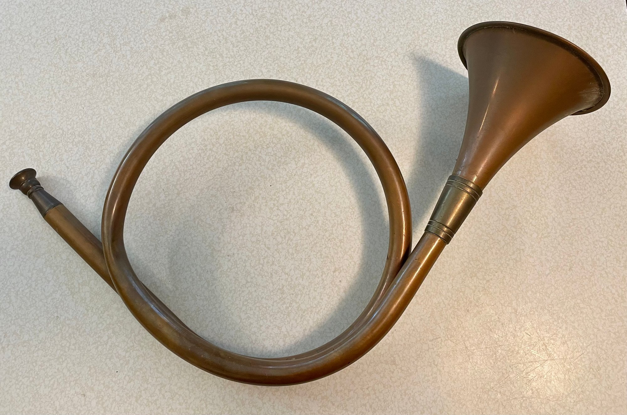 A great looking brass post horn - 19 1/2" long. The condition is good but note it has a slight dent - very hard to see. Not sure if this was ever a working horn but great for decoration.