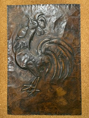 An unusual embossed copper relief of a rooster mounted on board and ready to hang. It's a large piece -