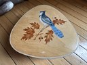 Another wonderful example by the former Connecticut artist, triangular in form, the lid adorned with a striking bluejay perched on an oak tree branch. The interior lining is a great touch, matching the box's exterior. Condition is very good.