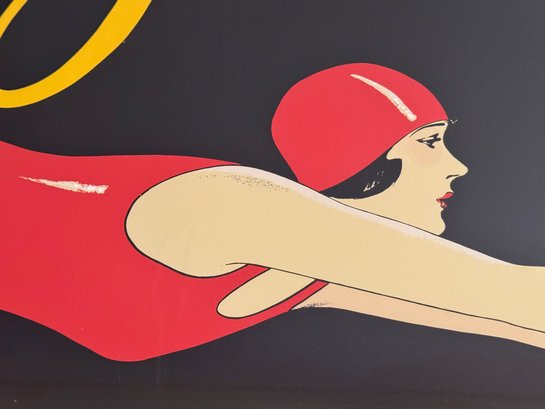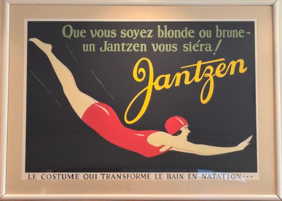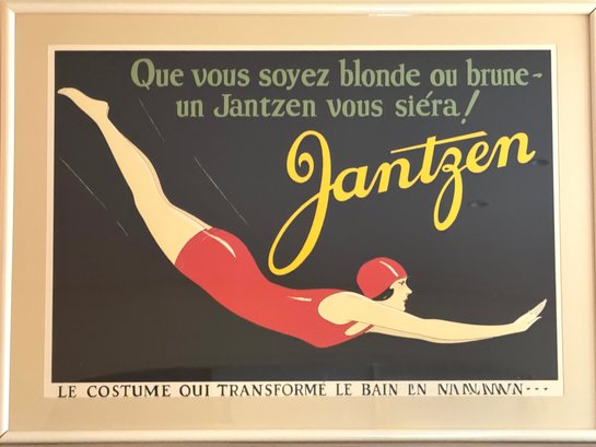 This is an original vintage French screenprint poster for Jantzen Swimsuits originally designed for a 1928 Paris sales promotion Sales featuring a diving woman in a red bathing suit and swim cap, text reads: "Qe vous soyez blonde ou brune - un Jantzen vous siera! Le costume qui transforme le bain en natation" that translates to "Whether you're blonde or brunette, a Jantzen suit will look great on you! The suit that turns bathing into swimming. There is a very small blemish crack on the paper above the the word Transforme - otherwise poster is in appearance in very nice condition". *Not examined without frame
