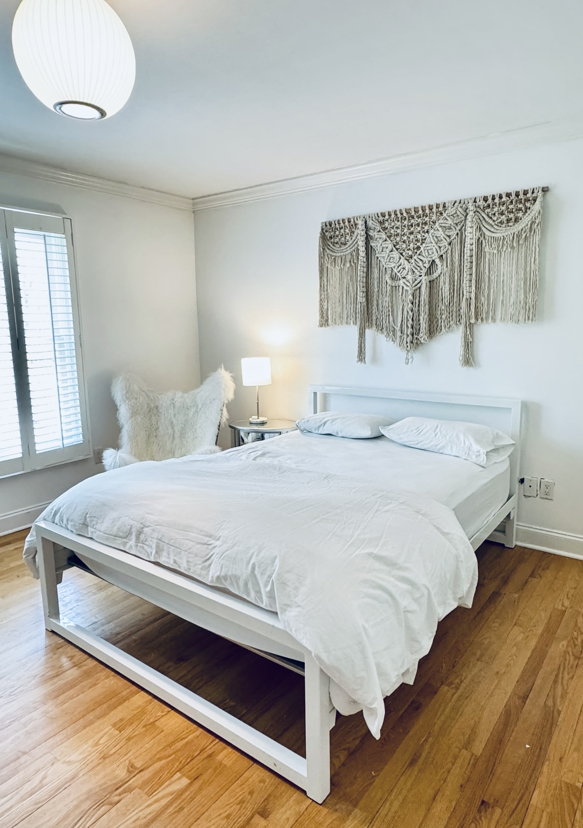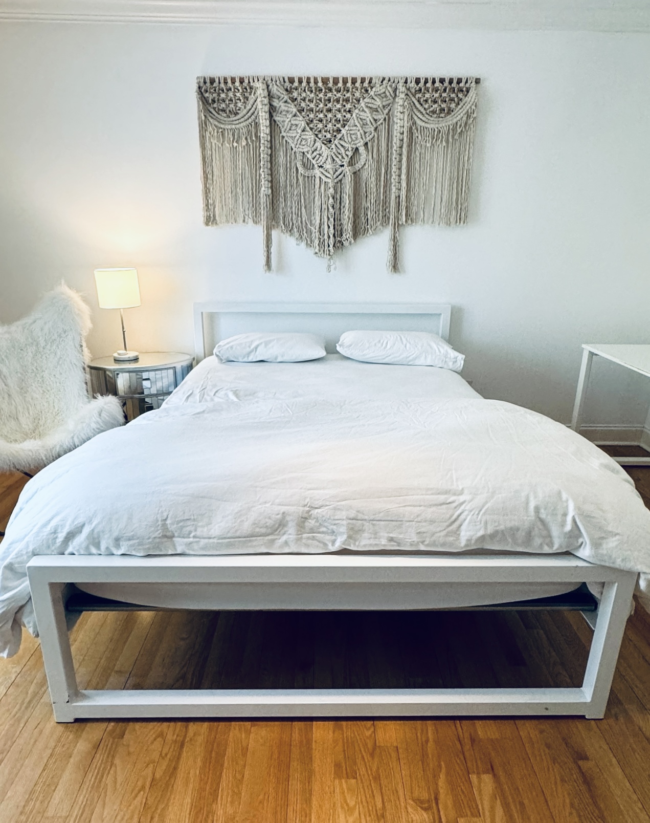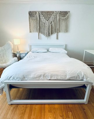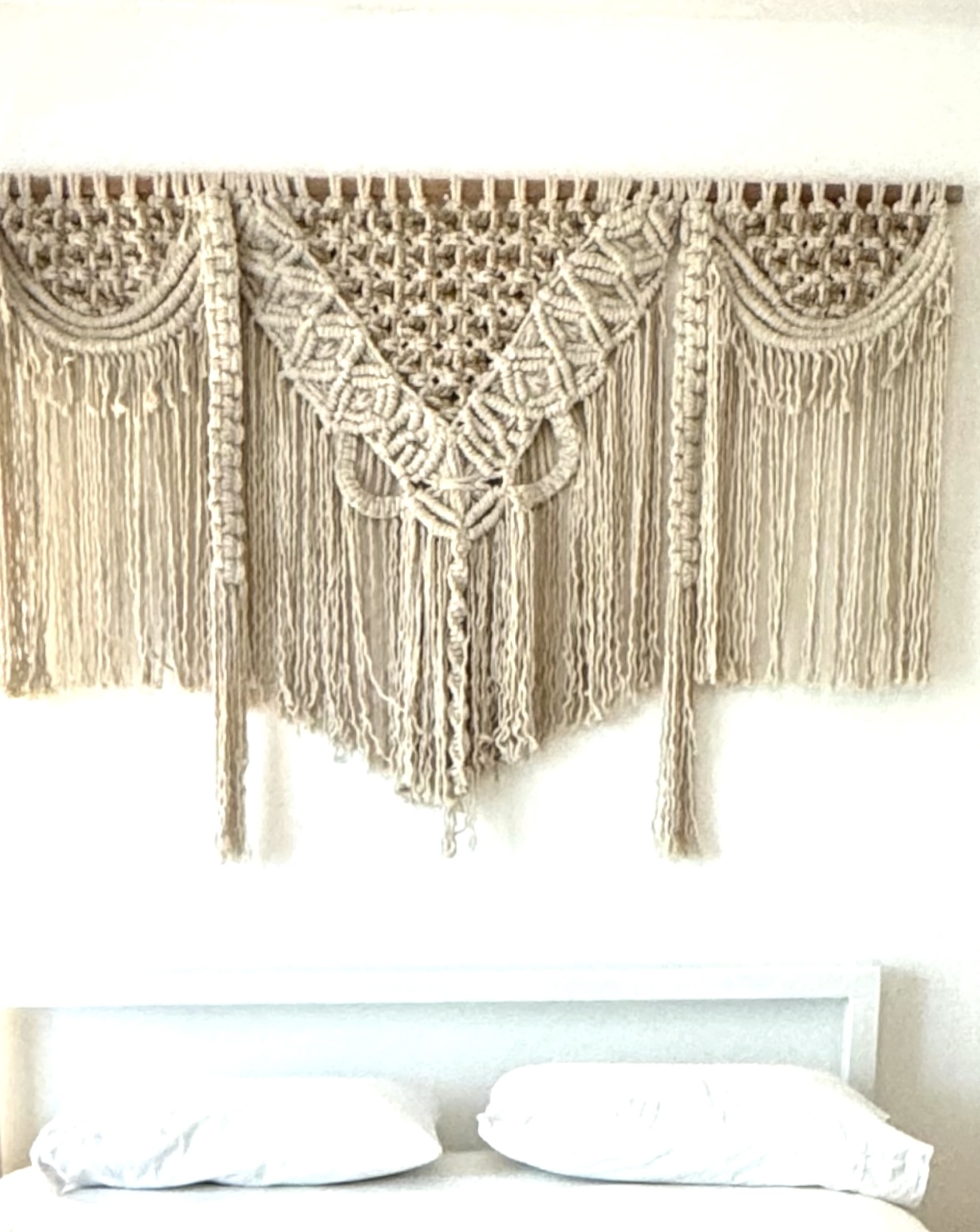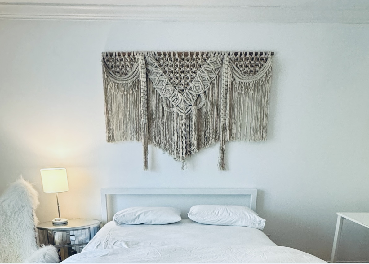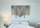 This a C1970’s large macrame woven wall hanging on wood frame - popular decor for time and still looks contemporary in this modern girls room! Condition is good for age.