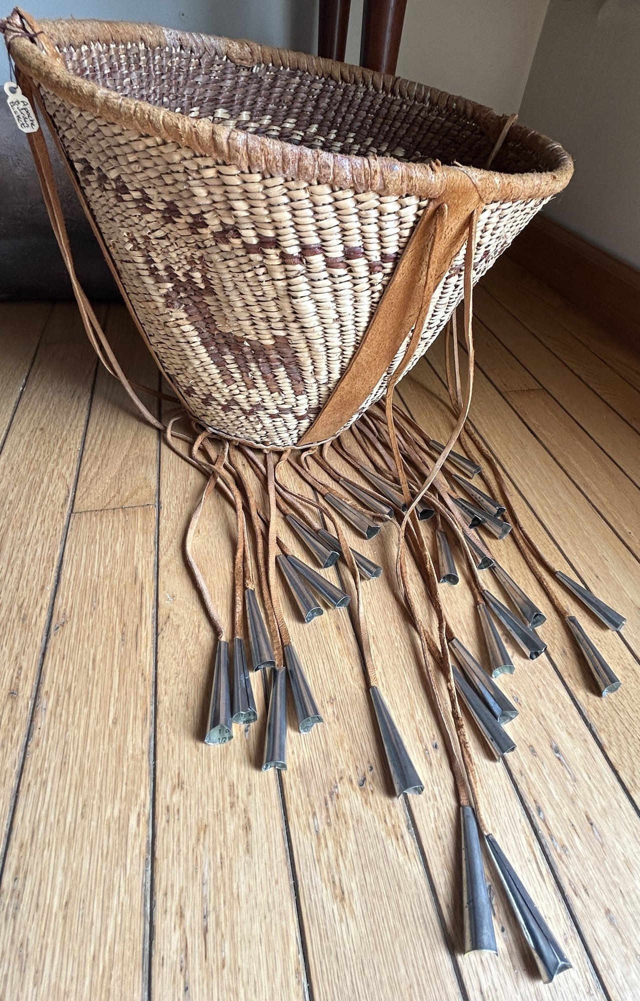 A finely woven Native American made APACHE 'Burden Basket'. It is vintage, large in scale, and features elk in profile as well as geometric bands. Cone tinklers add visual interest and sound when carried. A wonderful example!