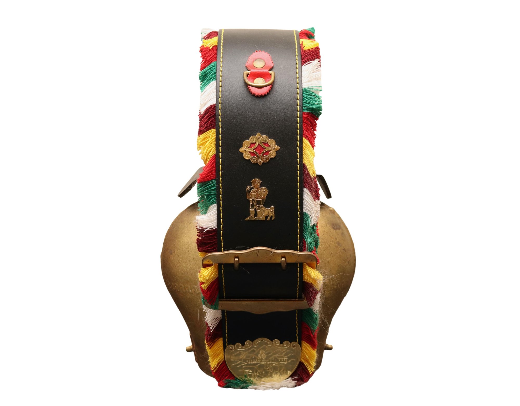 Celebrate Swiss tradition with this Vintage Treicheln-Style Cowbell, a striking piece that embodies heritage and craftsmanship. Featuring a robust brass bell with a deep, resonant chime, this trophy from the 1990s is adorned with a wide leather strap, richly decorated with multicolored fringe, intricate metal emblems, and precision stitching. The bold embellishments, including a red leather appliqué and engraved brass plate, hint at its significance as a competition award. A true collector’s item, perfect for Alpine enthusiasts, trophy collectors, or those looking for a statement piece with Swiss character.