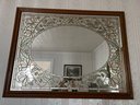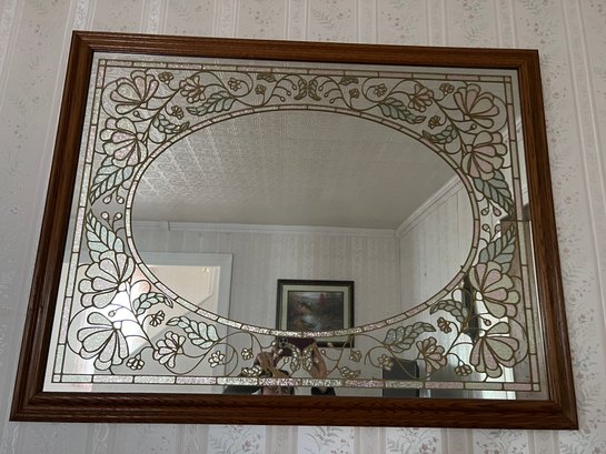 Vintage 1970s or 1980s "Tiffany Rose" design mirror featuring pink, green and white foiled reverse etching in an art deco inspired floral pattern with gold borders, creating an oval frame effect, housed in an oak frame.