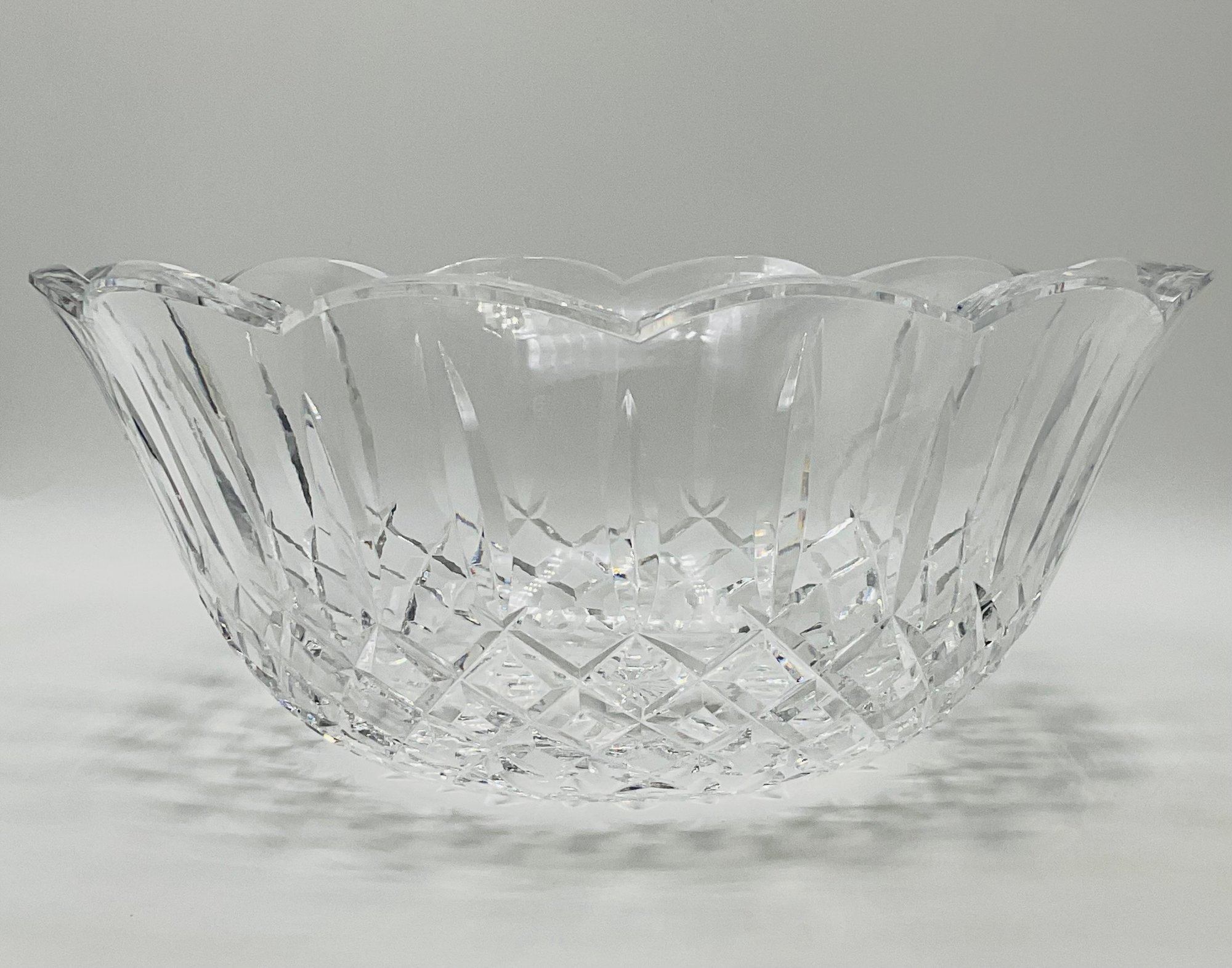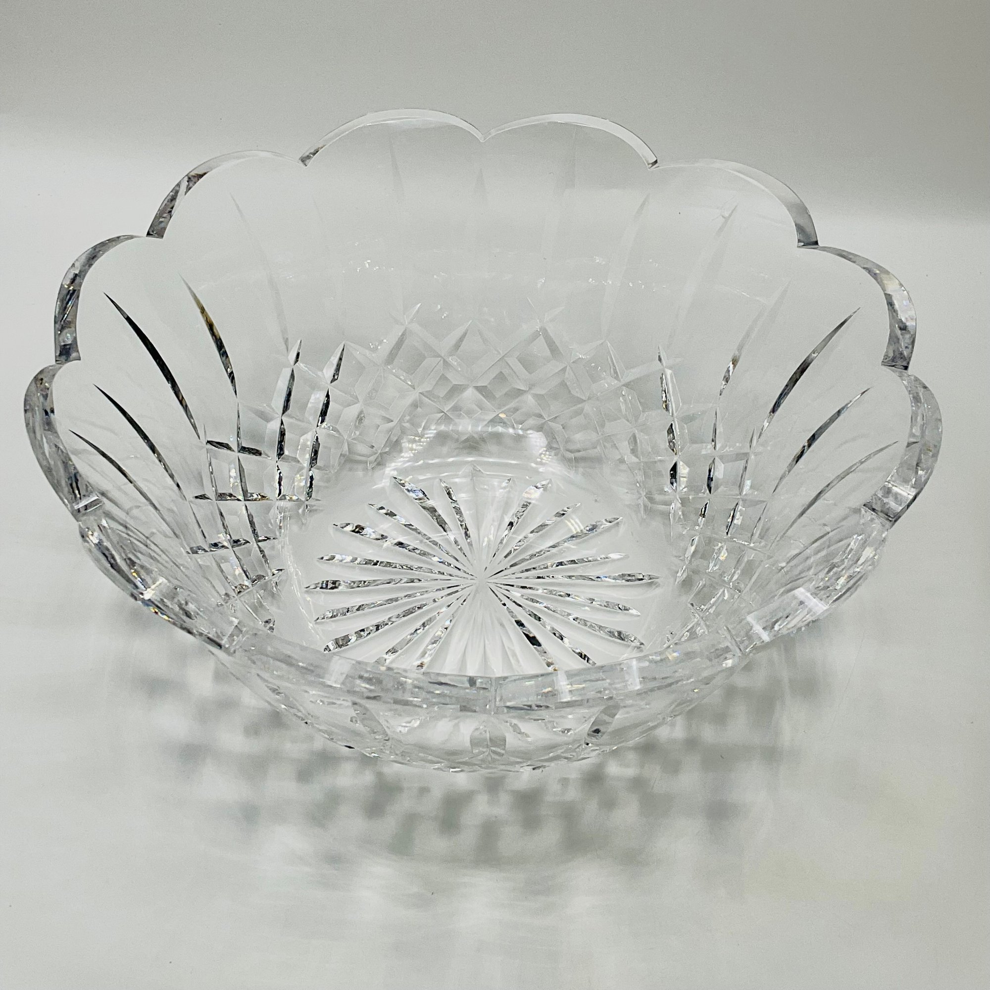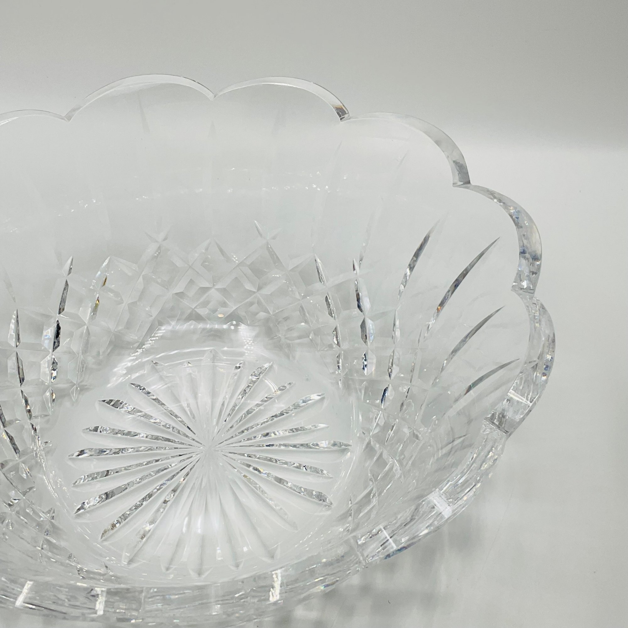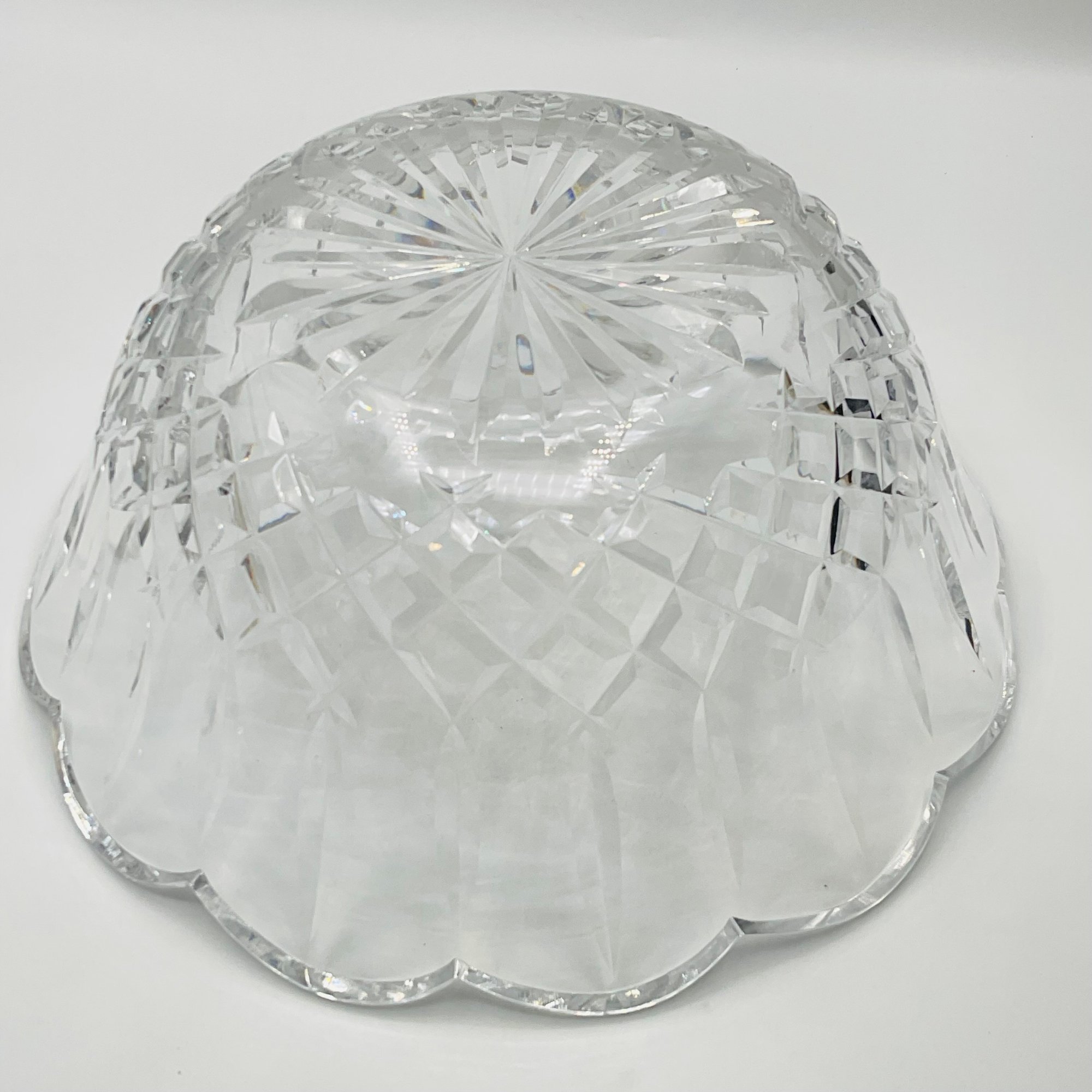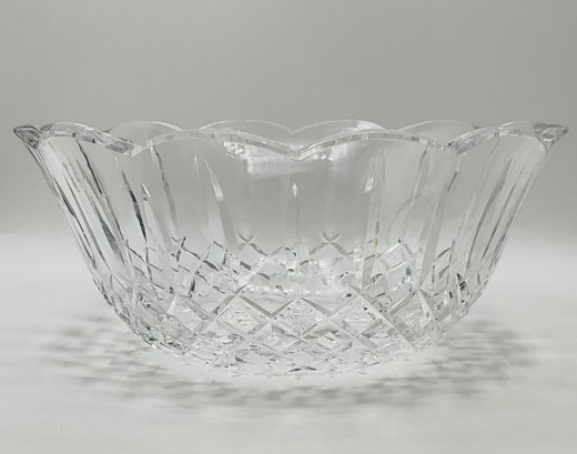 This is a stunning, authentic Waterford Crystal centerpiece bowl featuring a classic deep-cut pattern and a graceful scalloped rim. The bowl displays excellent clarity and the heavy lead crystal weight expected from a high-quality Waterford piece.