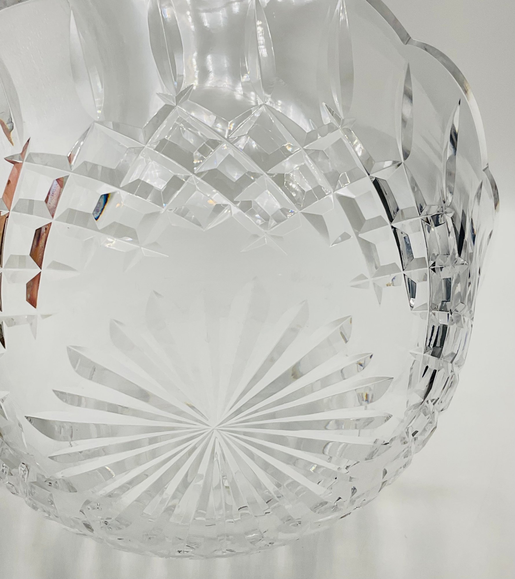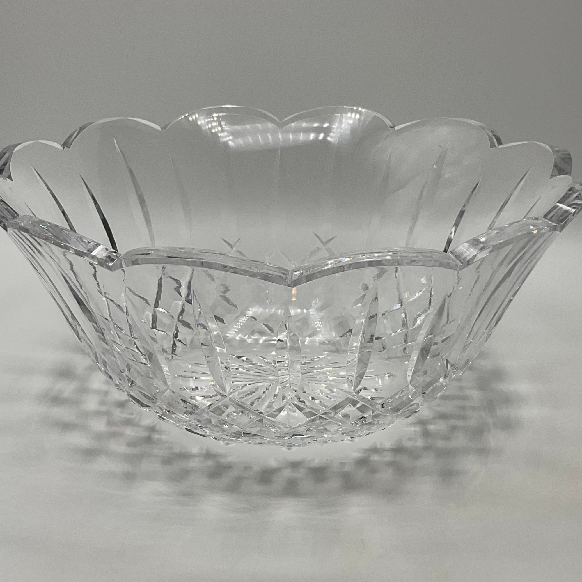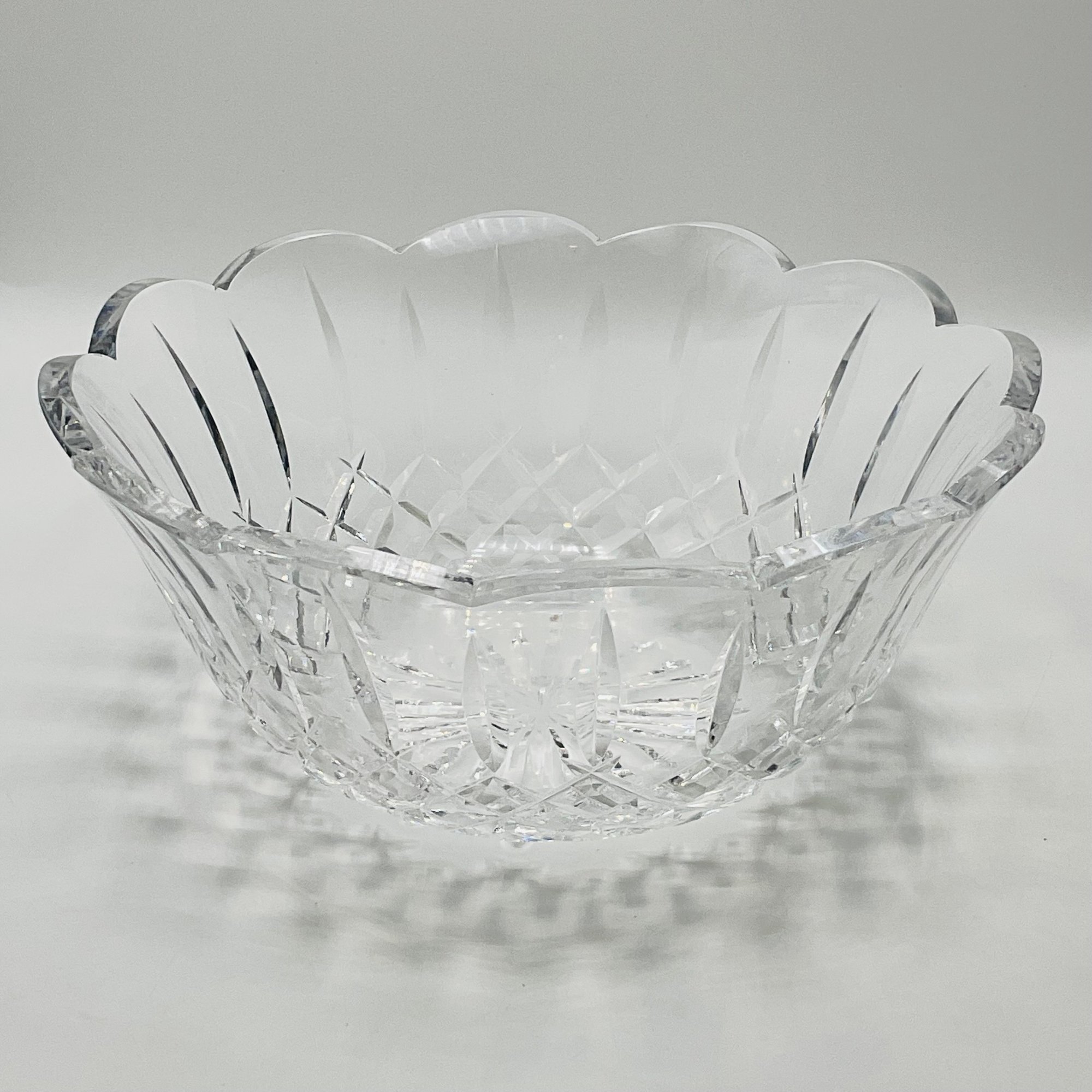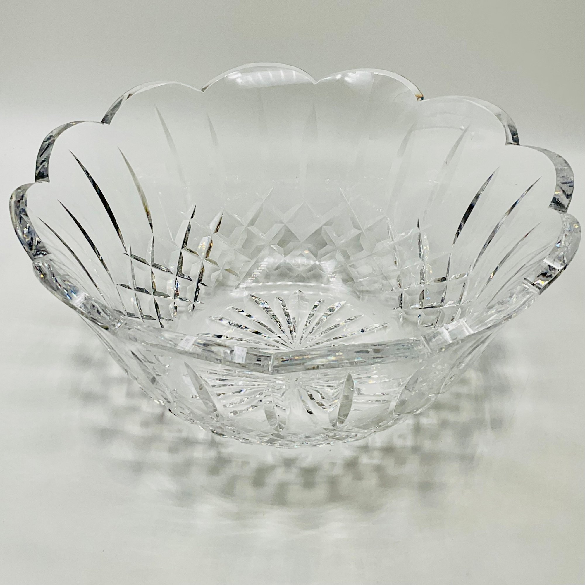 This is a stunning, authentic Waterford Crystal centerpiece bowl featuring a classic deep-cut pattern and a graceful scalloped rim. The bowl displays excellent clarity and the heavy lead crystal weight expected from a high-quality Waterford piece.