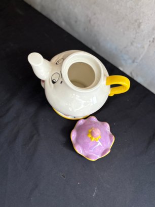 Charming large ceramic elephant teapot in playful figural form, featuring a smiling face, expressive eyes, and pink-and-yellow bonnet-style lid. The spout is cleverly integrated into the elephant’s trunk, with colorful decorative accents around the base.
