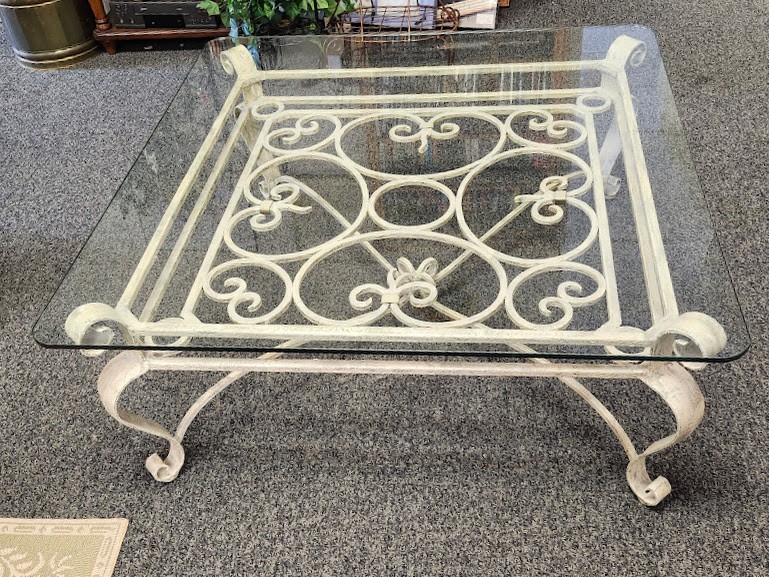 Beautiful large wrought iron scroll coffee table in an off white shade. It's approx. 40 x 40 x 16.5". There is a matching hallway/entry way table listed in this auction as well.