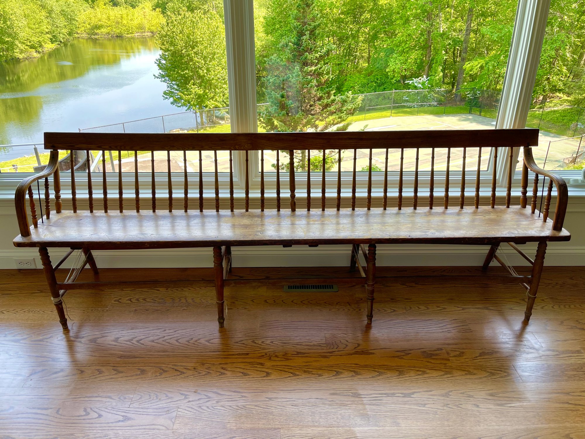 Condition: overall loss to finish, scratches and crack to seat, old nicks to wood and loose joints. Please view all photos for an accurate description and condition of the item.