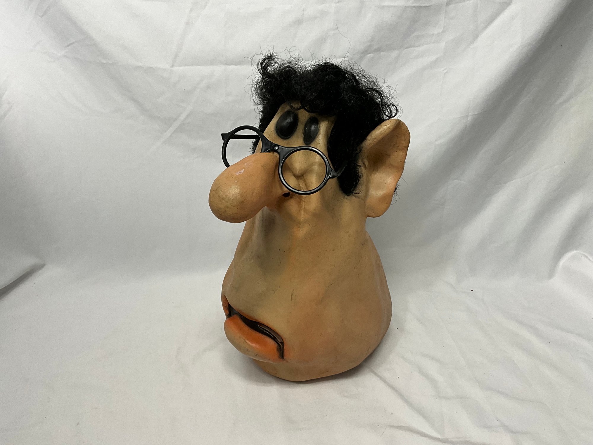 Made in 1978 by the Universal Press Syndicate, this Halloween mask is 18 inches tall so the eye holes are actually in the mouth. There is the ghost of a crack beginning under the nose, and the top on the back seam is beginning to open. He is an unusual mask. It’s stuffed with paper to hold its shape.