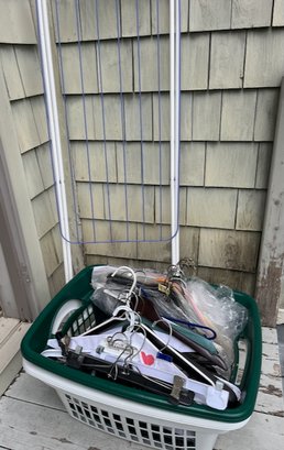 drying rack, 2 laundry baskets, hangers, clothes pins