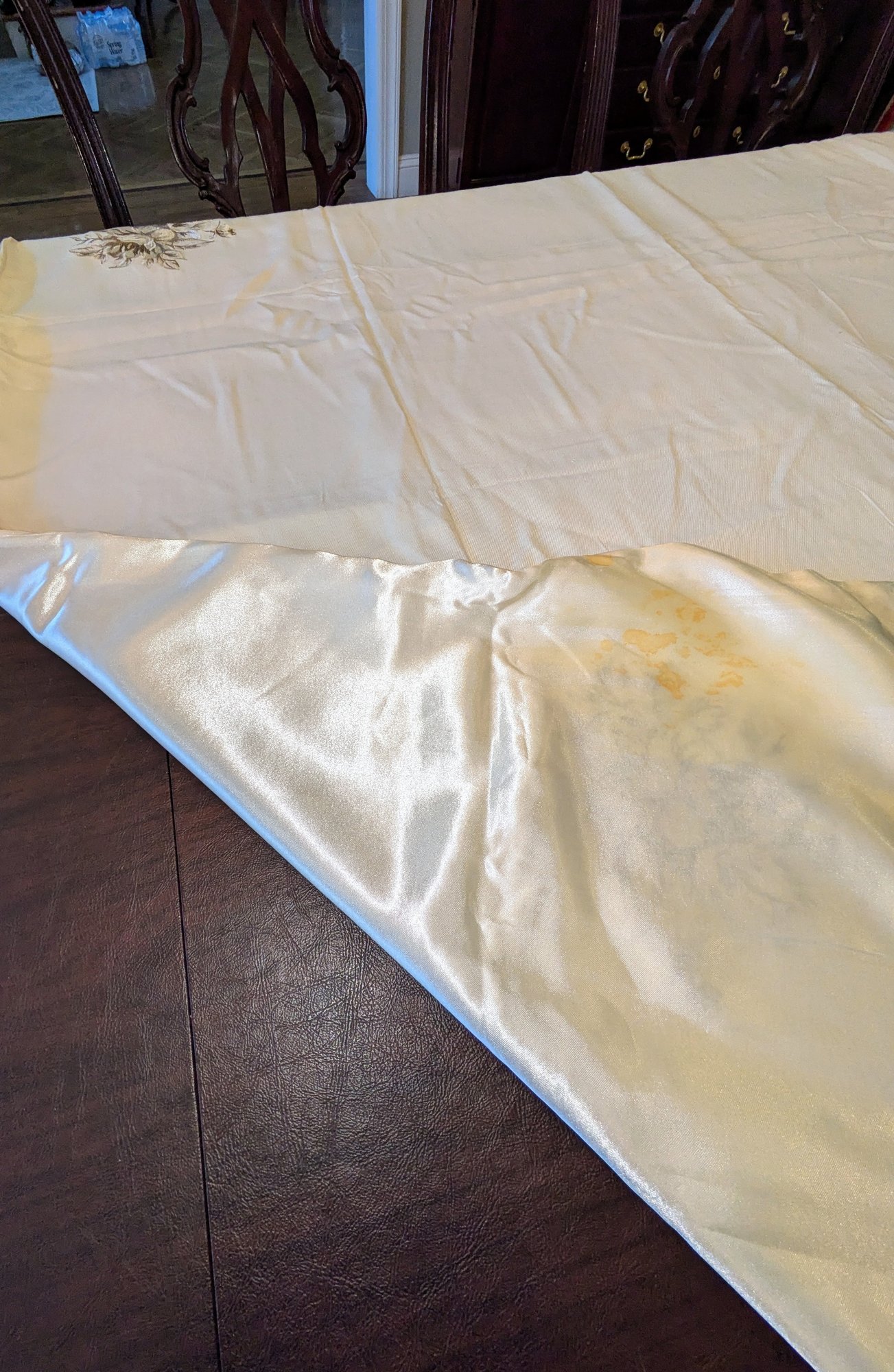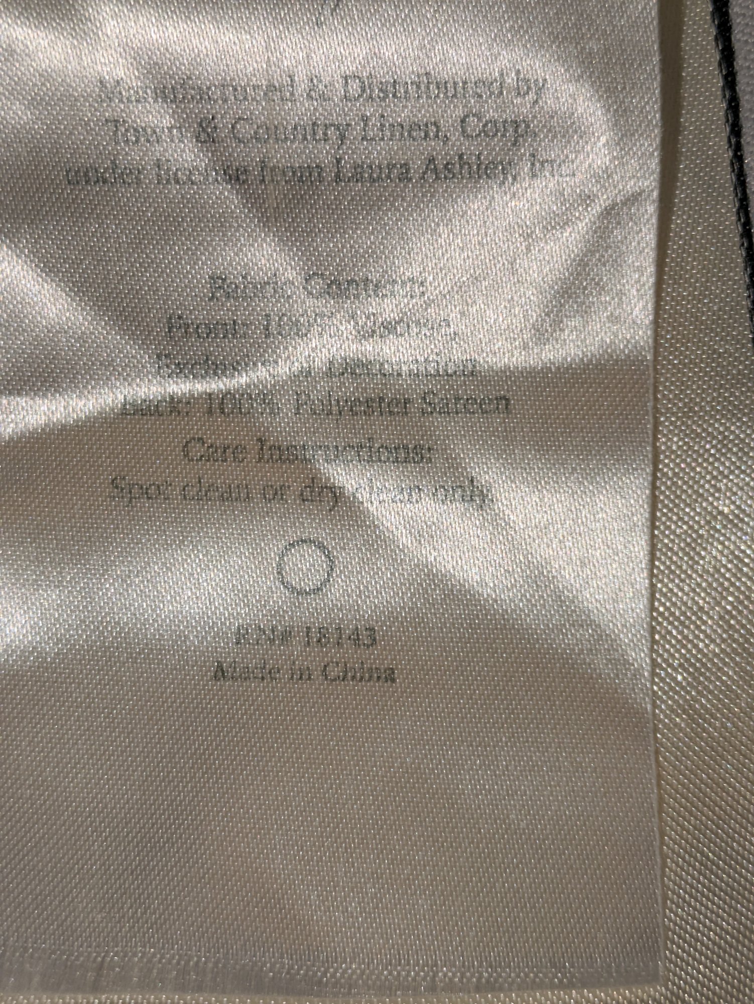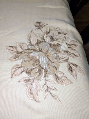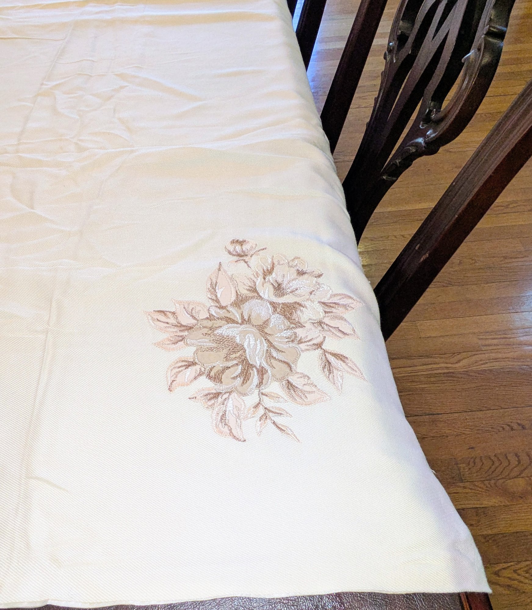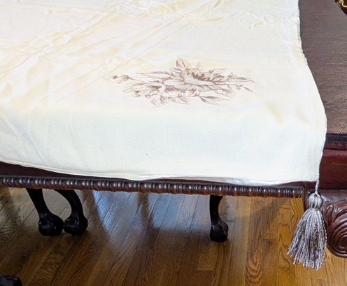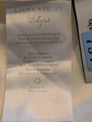 Laura Ashley Viscose & Poly, Embroidered Corner Edge & Tassel Detailed Square Tablecloth. Stunning Detailing and Design. There is a stain on both the front and back, consistent with age and use. Please see all photos as part of the description and condition. 58" x 50"
