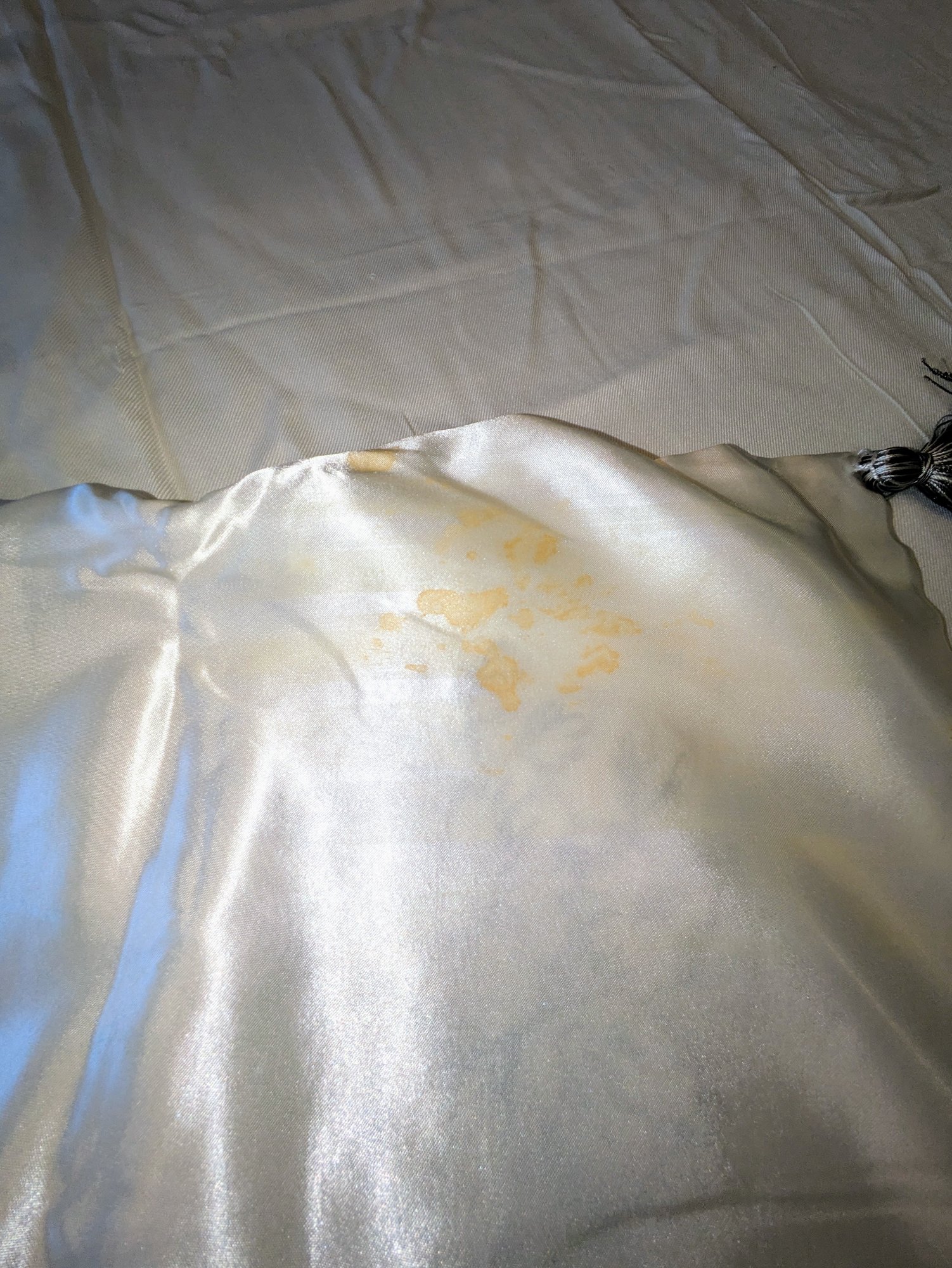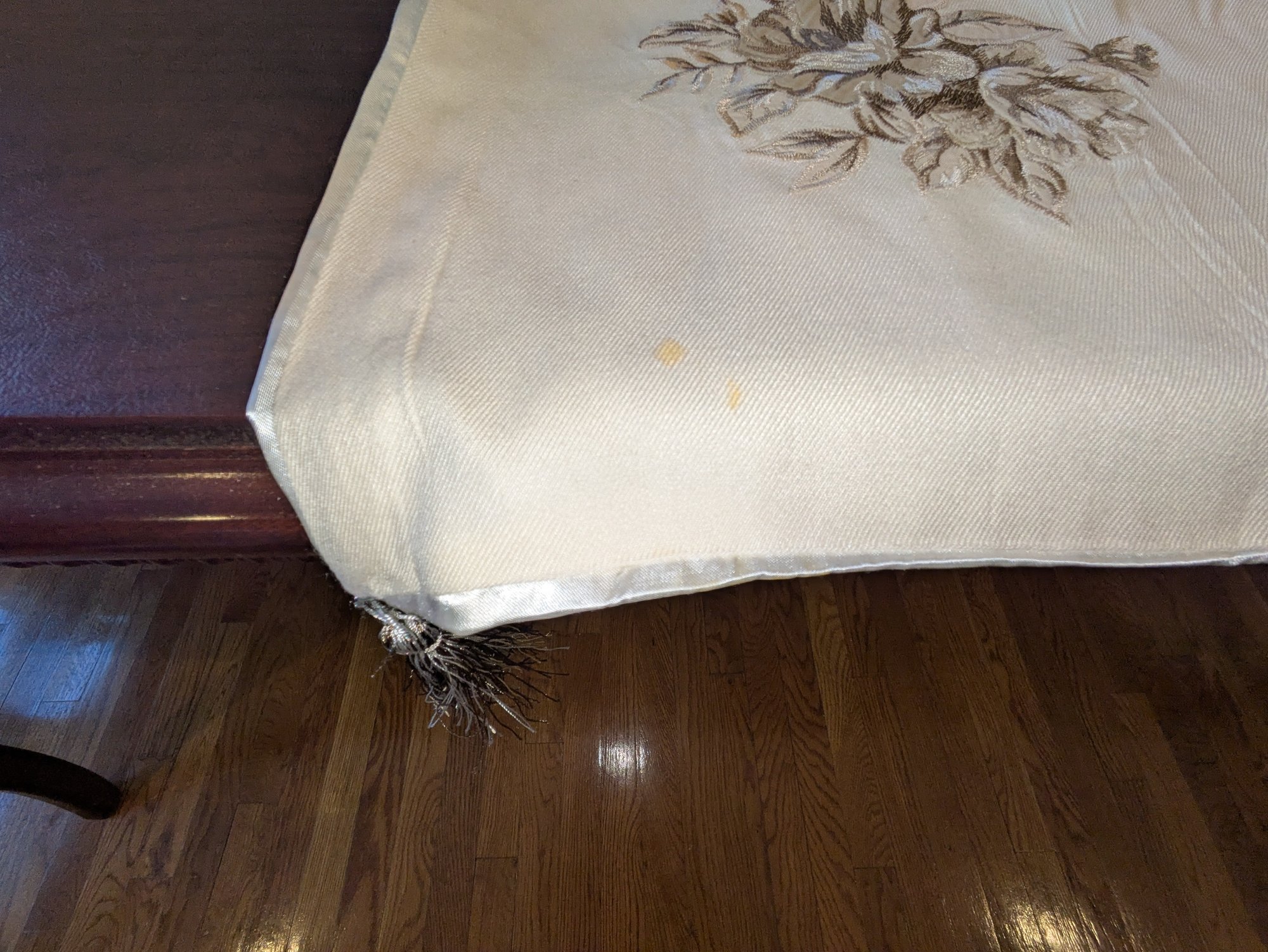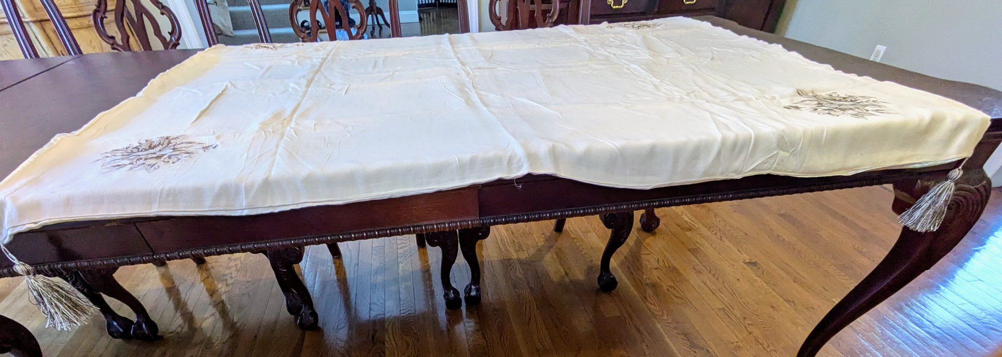 Laura Ashley Viscose & Poly, Embroidered Corner Edge & Tassel Detailed Square Tablecloth. Stunning Detailing and Design. There is a stain on both the front and back, consistent with age and use. Please see all photos as part of the description and condition. 58" x 50"