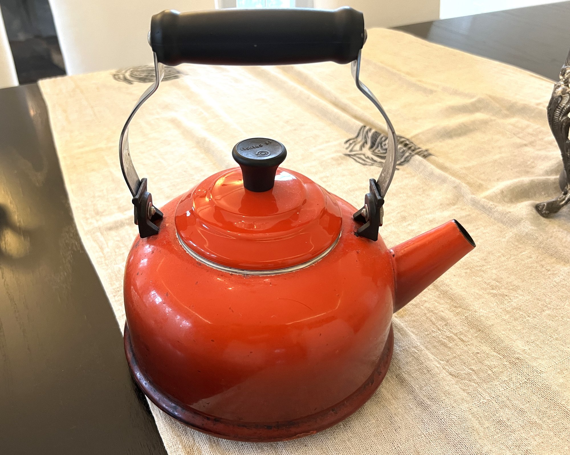 Red enameled metal stovetop tea kettle by Le Creuset.
