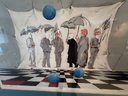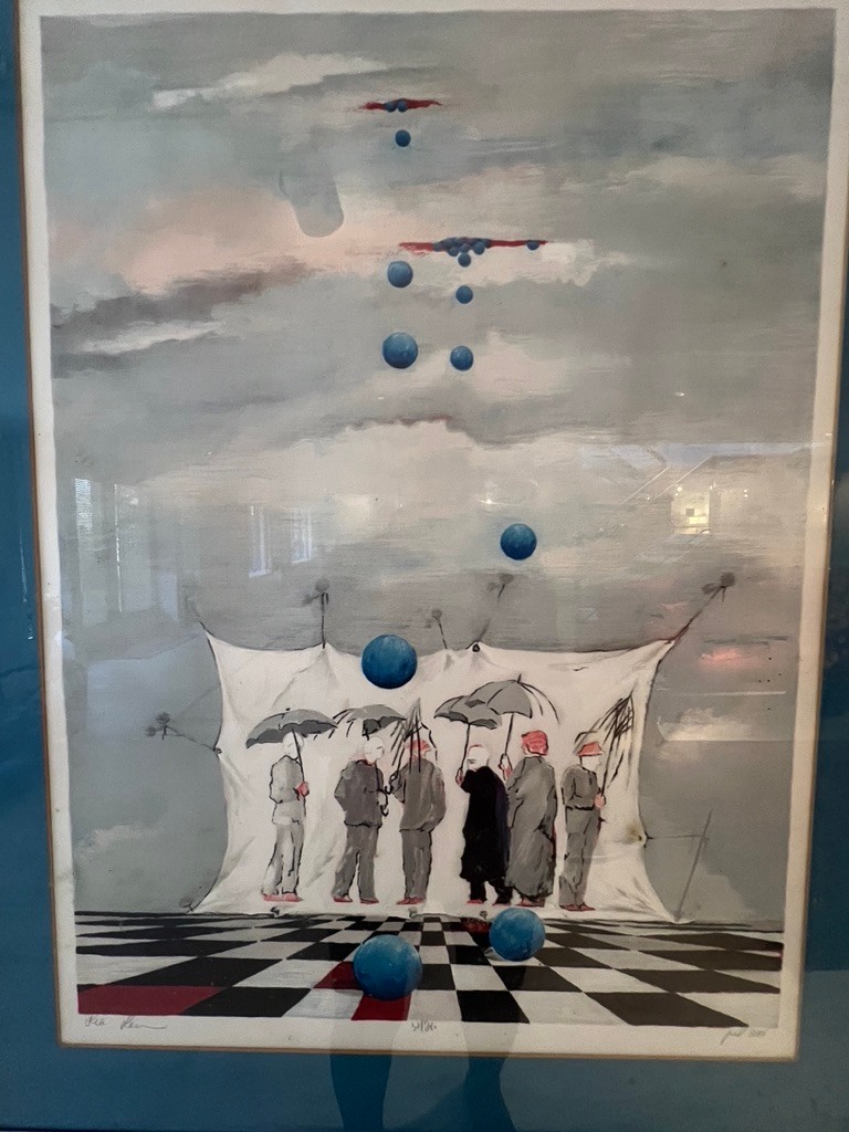 The artwork features figures holding umbrellas on a black and white checkered floor, with blue spheres floating in the sky and falling towards them.