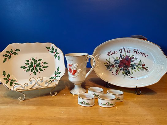 2 plates, 1 santa mug (Michael); 4 napkins rings. with boxes