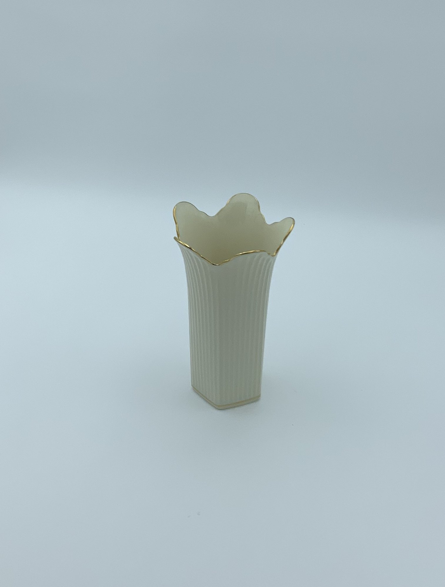 Fine quality Lenox vase in the Meridian pattern. Cream ribbed 5-sided vase with gold trim. Excellent condition and an elegant piece to add to your decor.