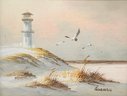 Lighthouse seaside with seagulls, acrylic on board, original painting by Gorman. This painting offers a peaceful and nostalgic view of the coast, perfect for adding a serene touch to any room. Painting is in a wooden frame at approx 12.50 x .75 x 10.50".