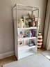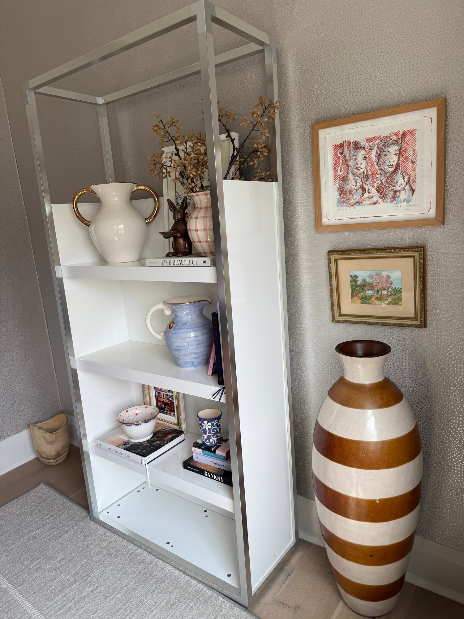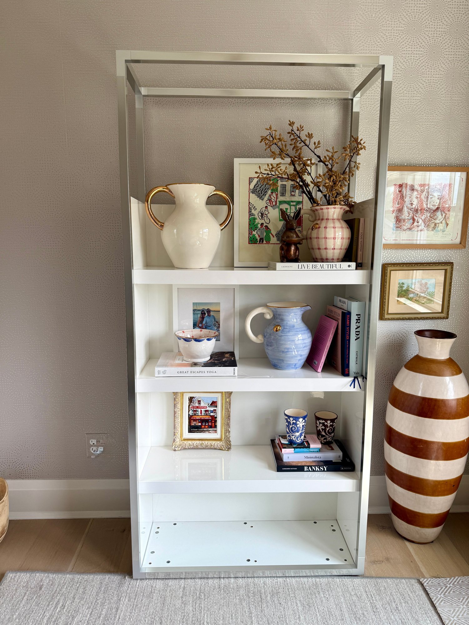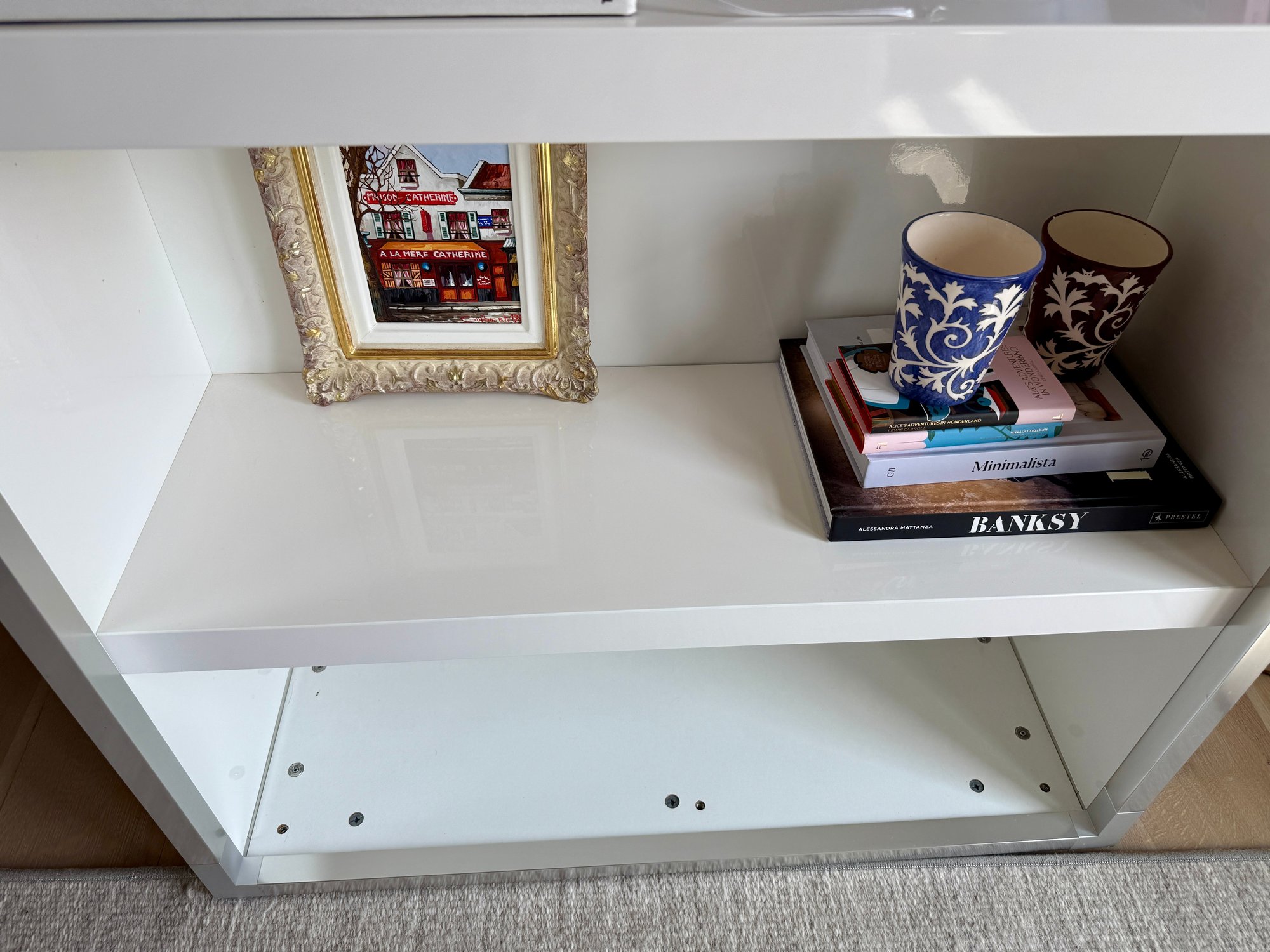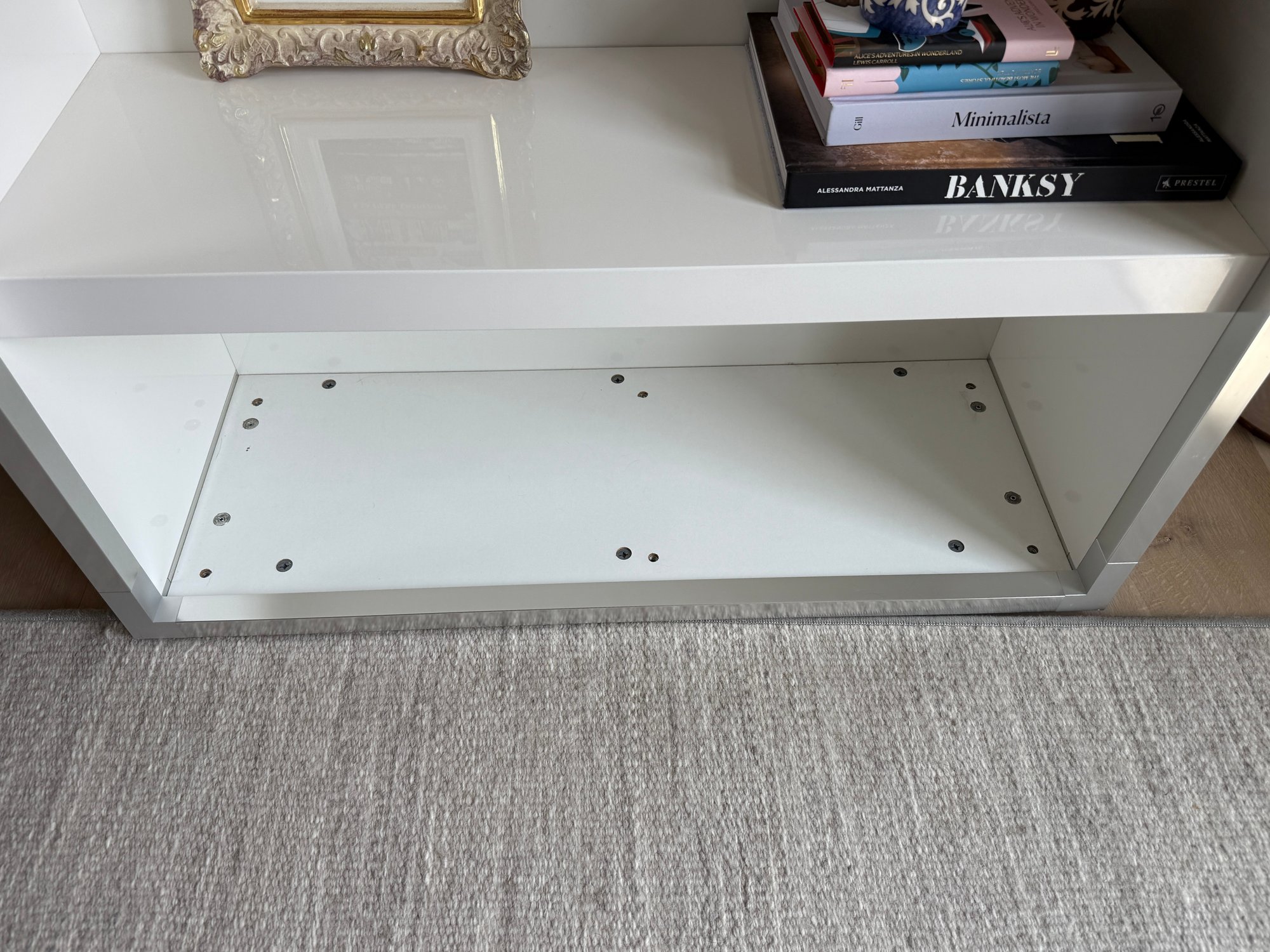 Bottom shelf is missing overlay that conceals screws. Can easily be covered by books and other decor pieces.