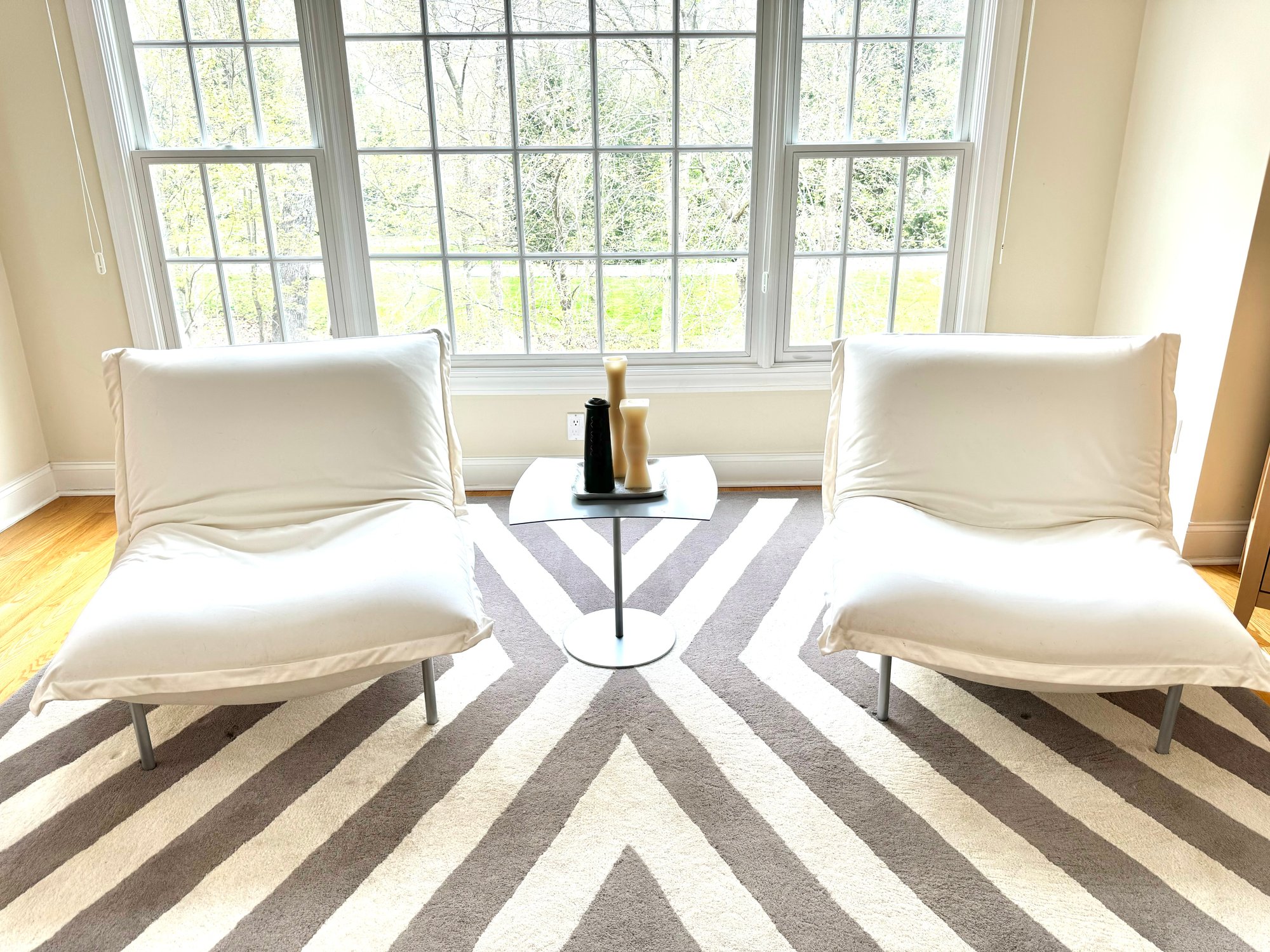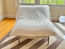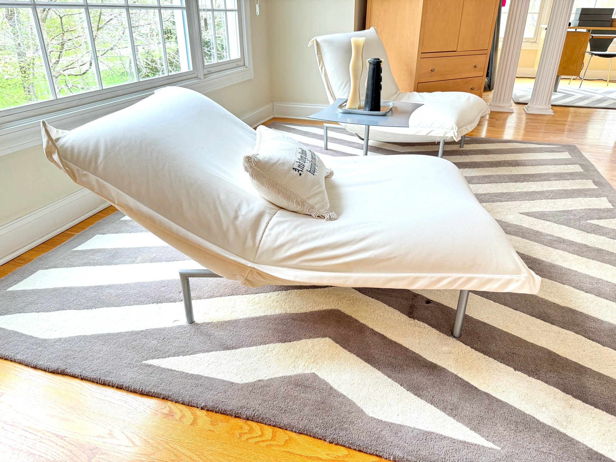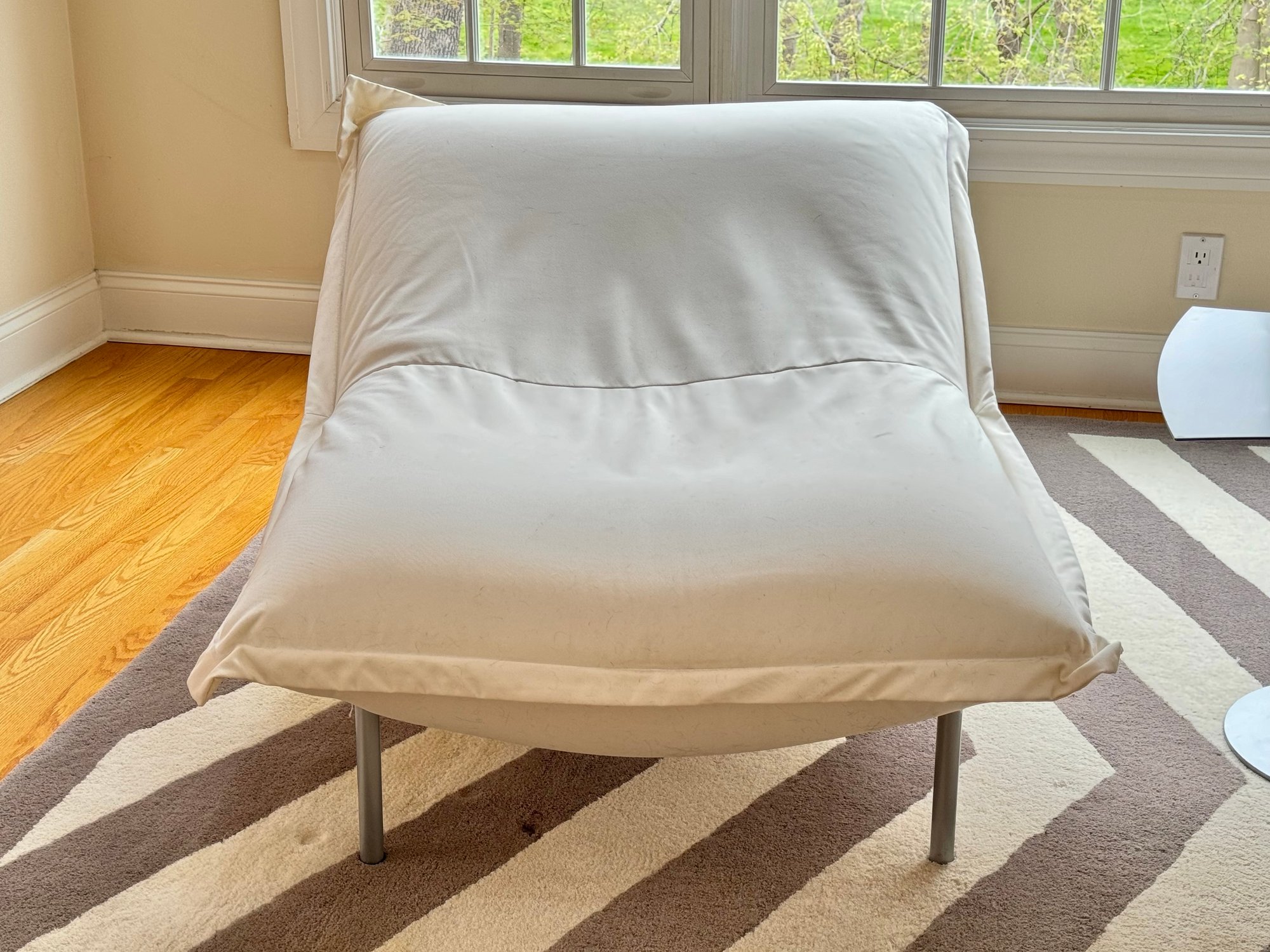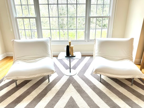 This is a very modern and contemporary pairing of super comfortable Ligne Roset side chairs in an off white soft cotton upholstery. They sit atop a brushed silver metal base and can recline back to be flat. Chair covers have zippers for easy maintenance. In very nice condition.