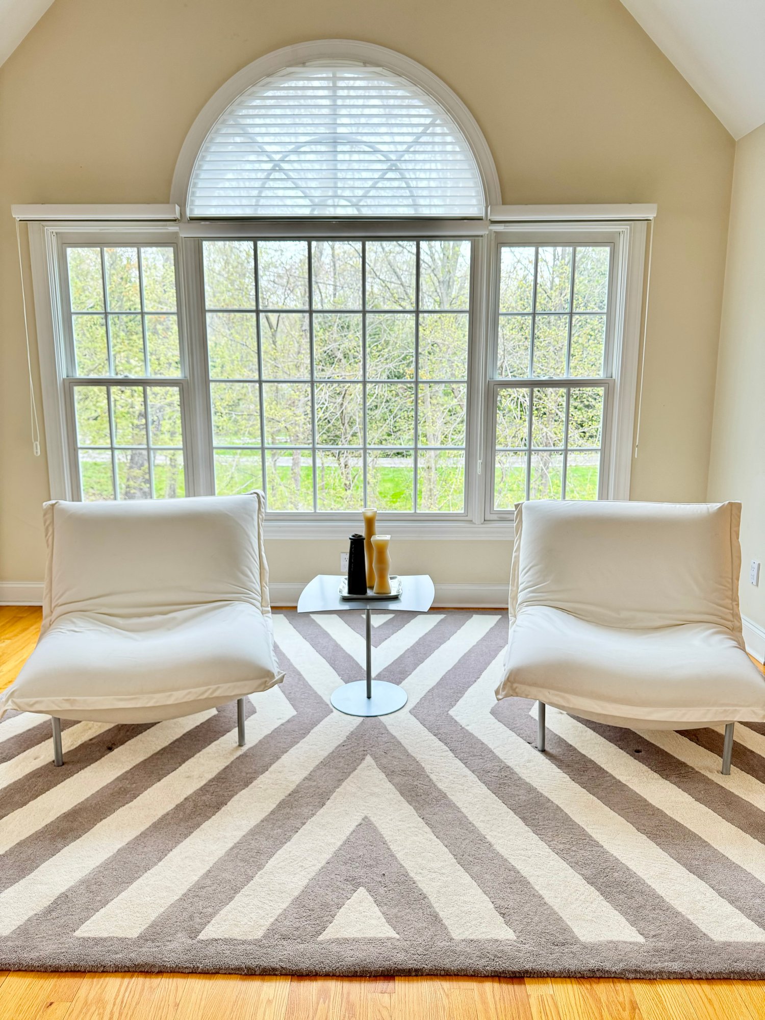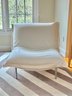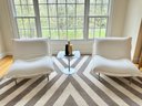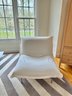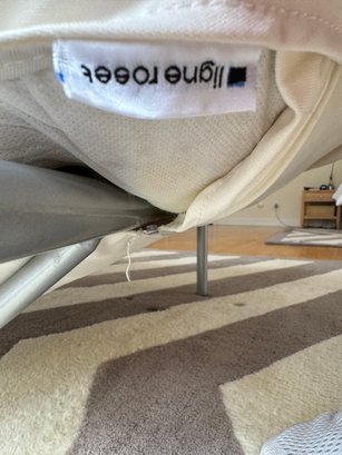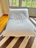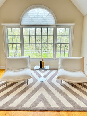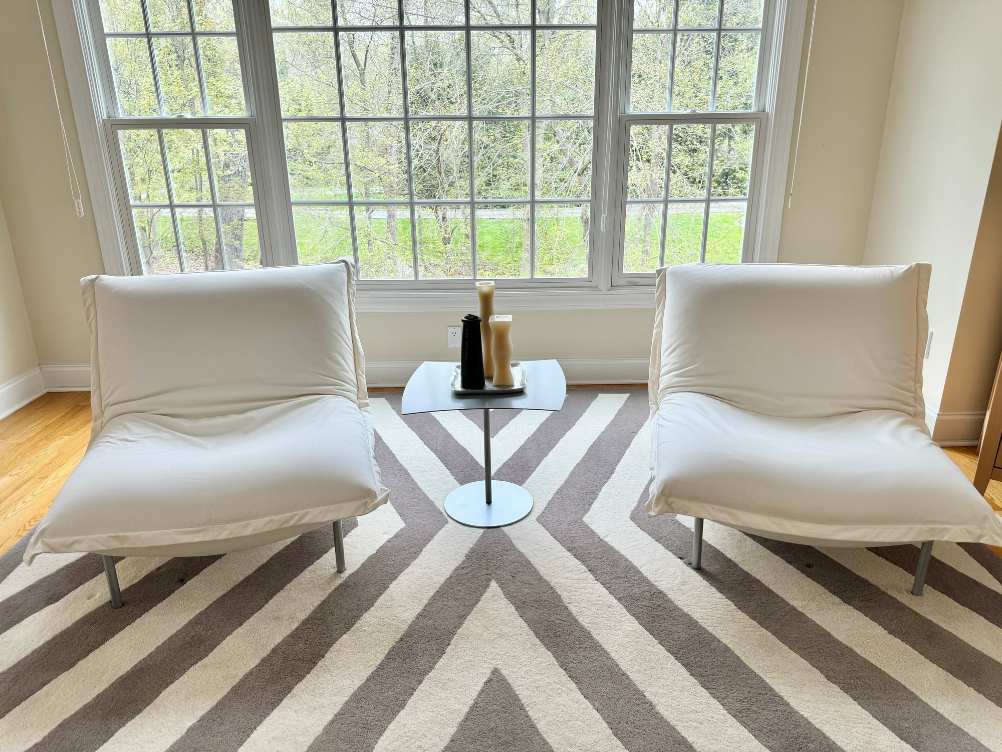 This is a very modern and contemporary pairing of super comfortable Ligne Roset side chairs in an off white soft cotton upholstery. They sit atop a brushed silver metal base and can recline back to be flat. Chair covers have zippers for easy maintenance. In very nice condition.