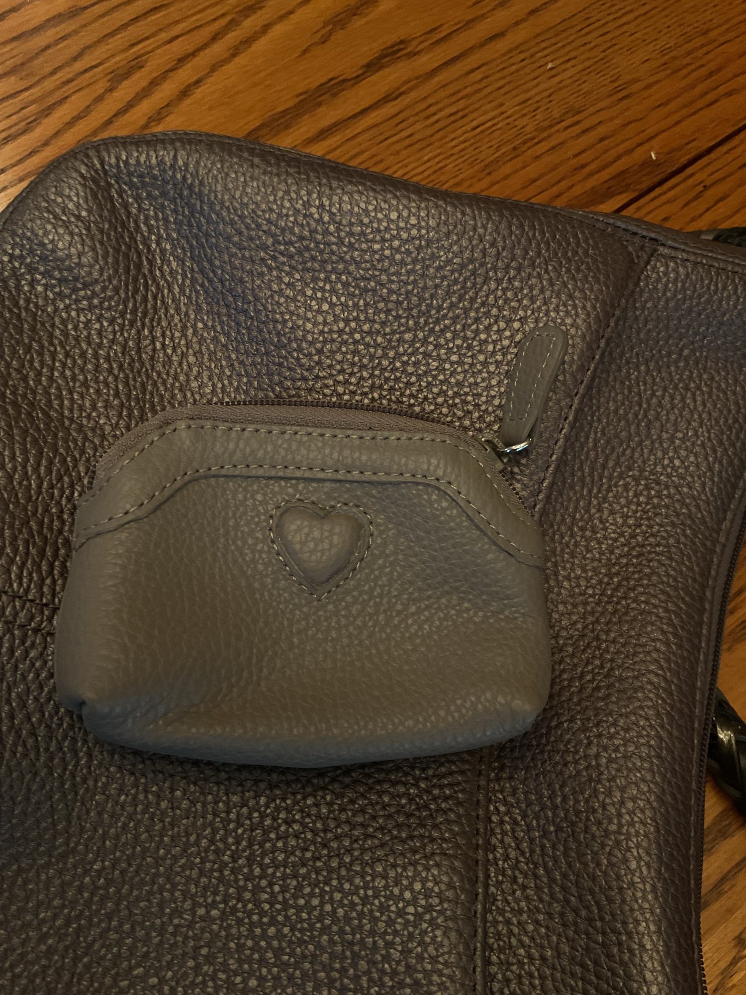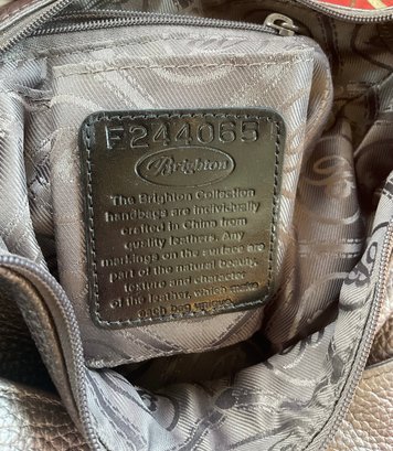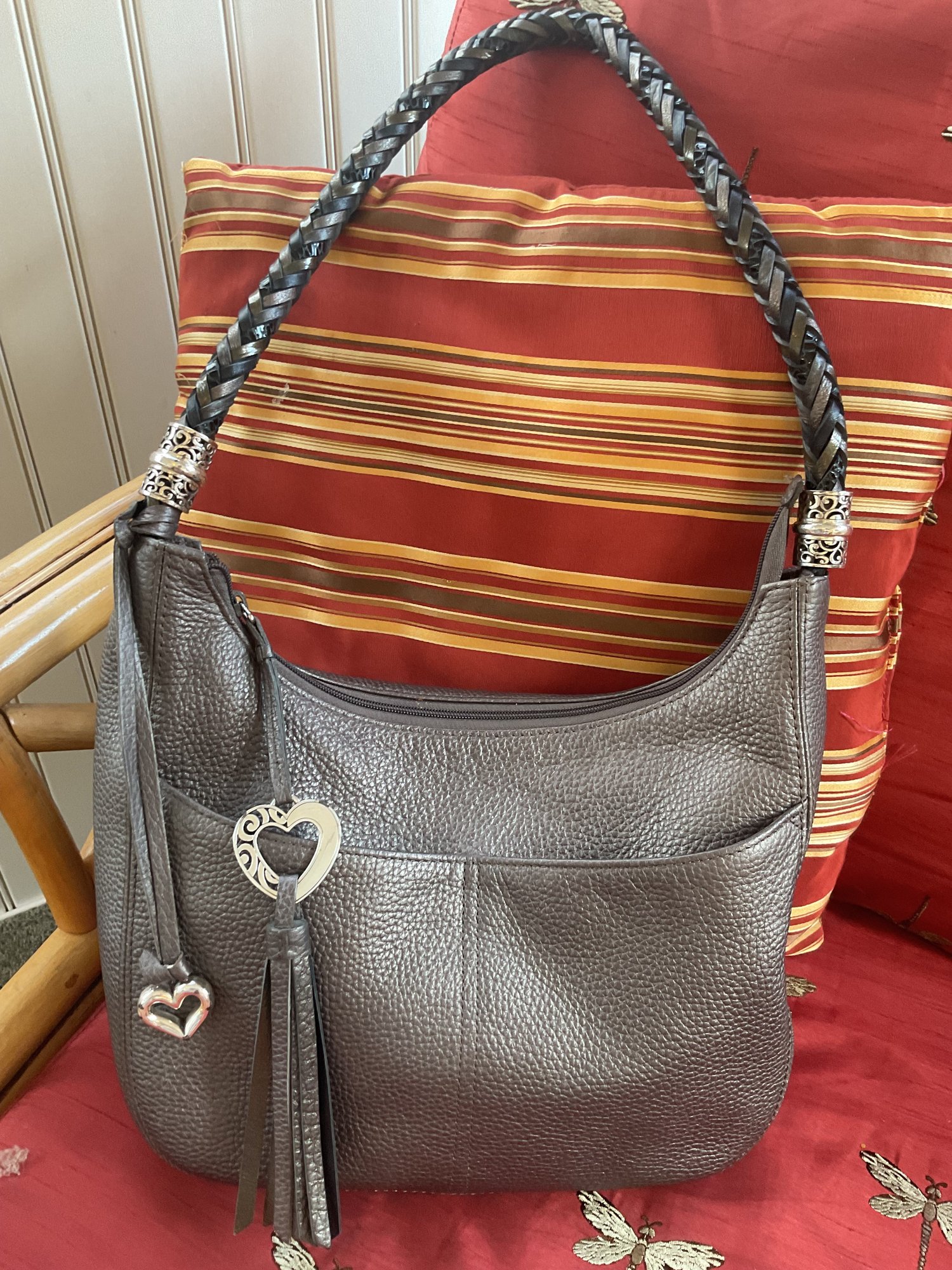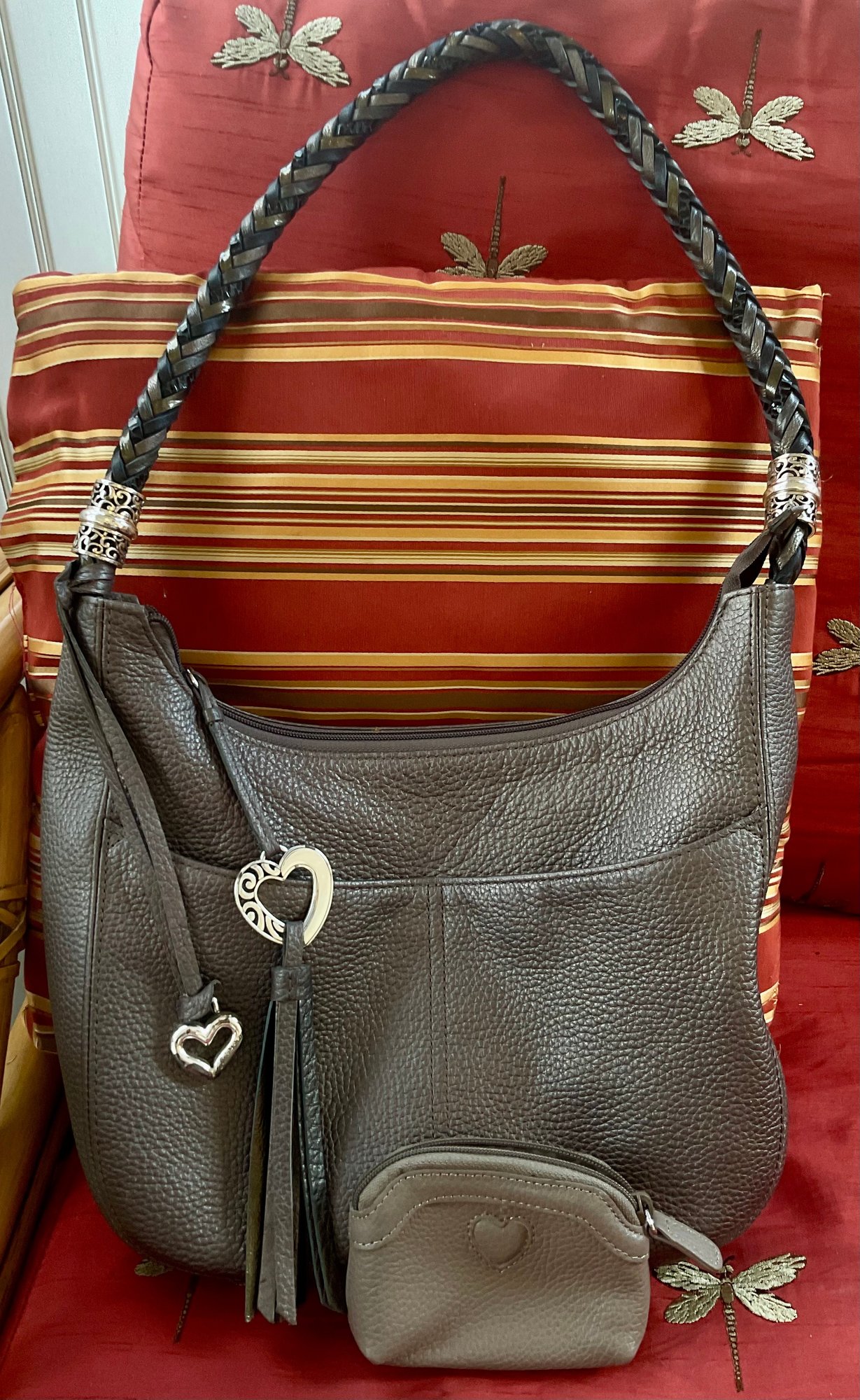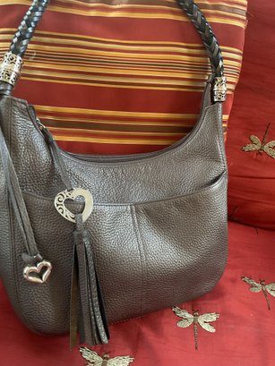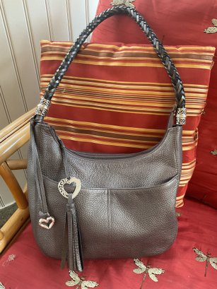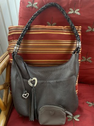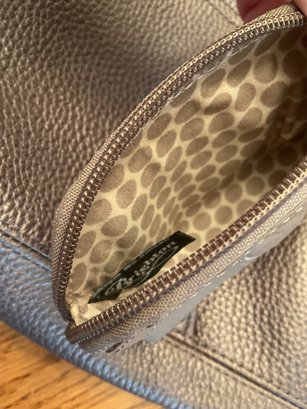 This high quality bag has stunning details such as the black and silver braided shoulder strap. Silver tone scrollwork with the signature heart charms/tassel. The high quality pebbled leather has a metallic finish and is a dark gray/pewter color. Serial number is in the internal pocket #F244065. Both shoulder bag and coin purse are in great condition