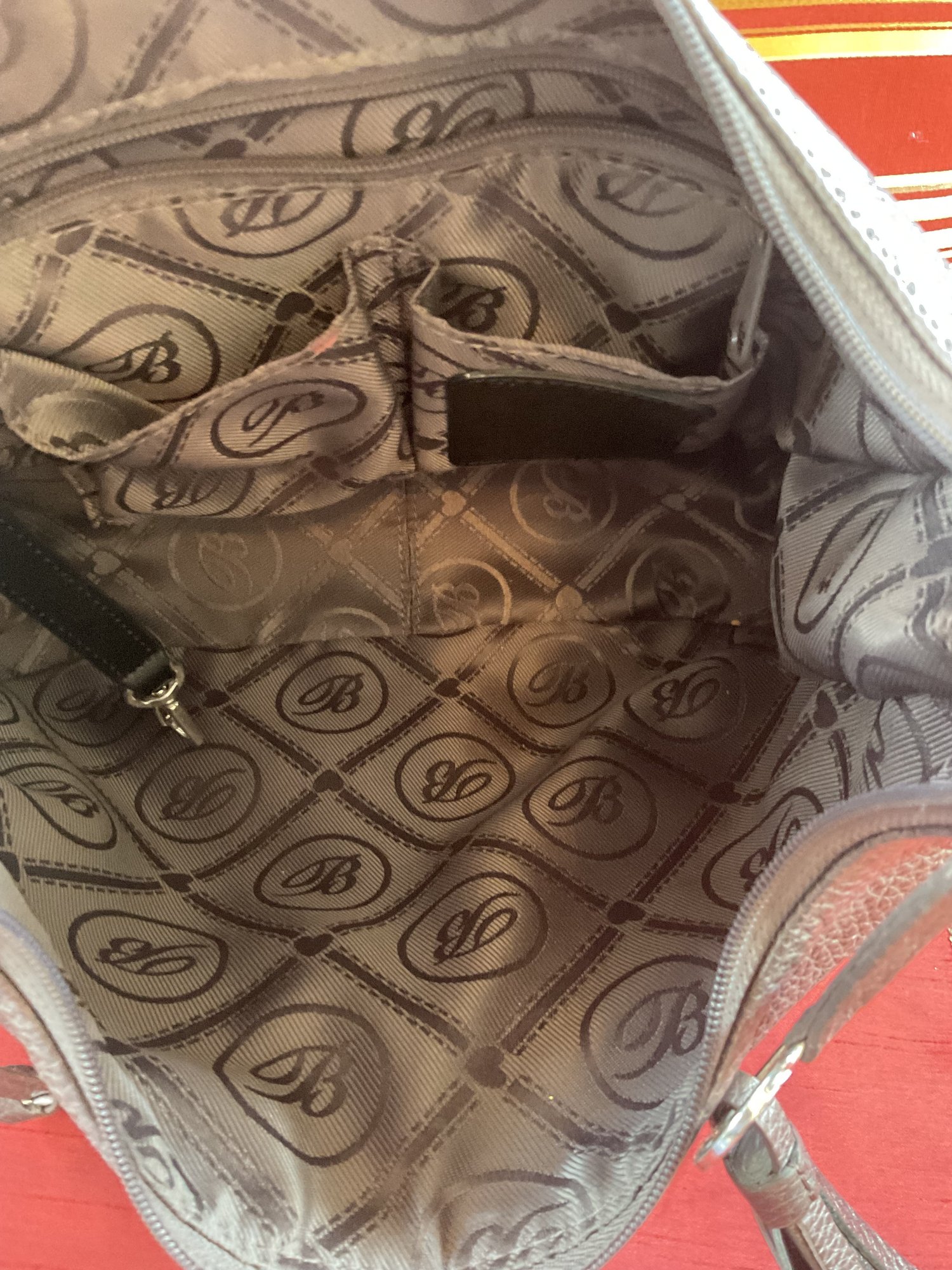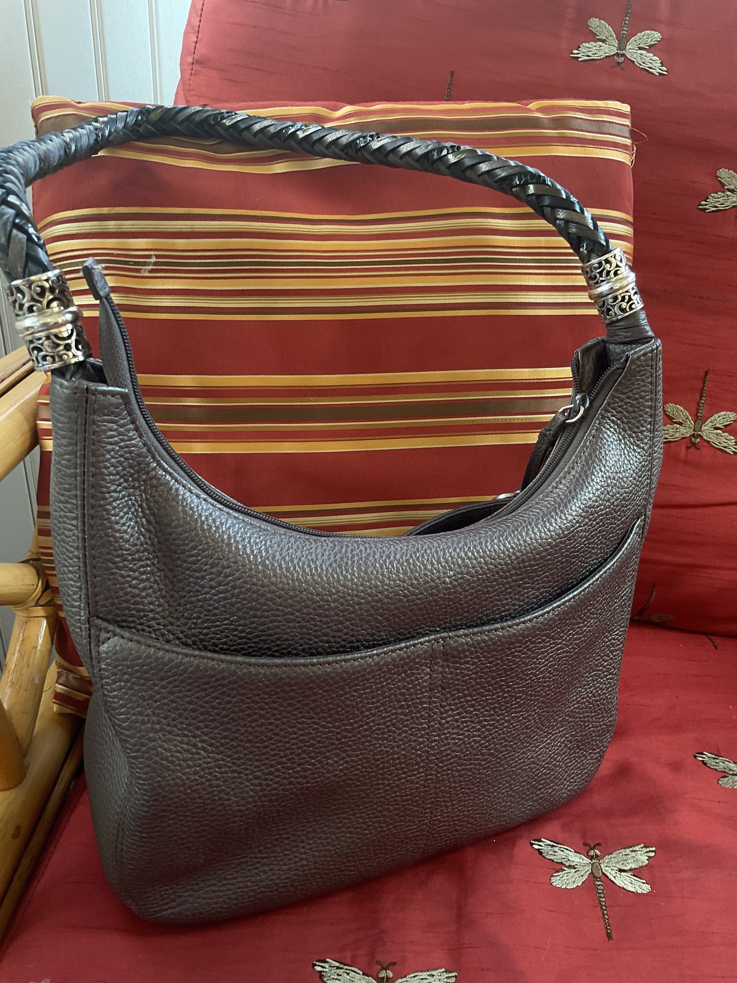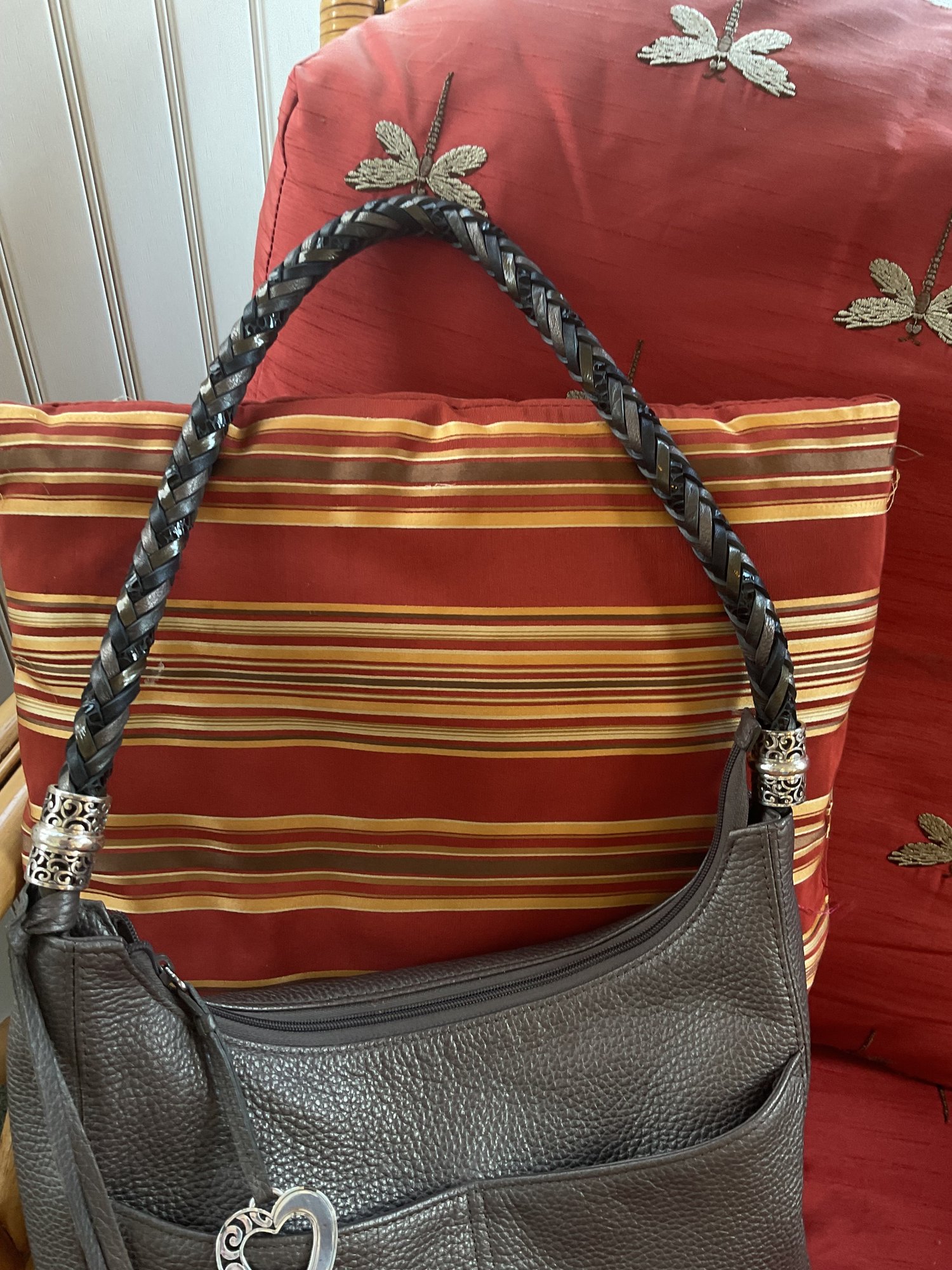 This high quality bag has stunning details such as the black and silver braided shoulder strap. Silver tone scrollwork with the signature heart charms/tassel. The high quality pebbled leather has a metallic finish and is a dark gray/pewter color. Serial number is in the internal pocket #F244065. Both shoulder bag and coin purse are in great condition