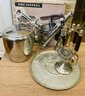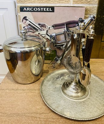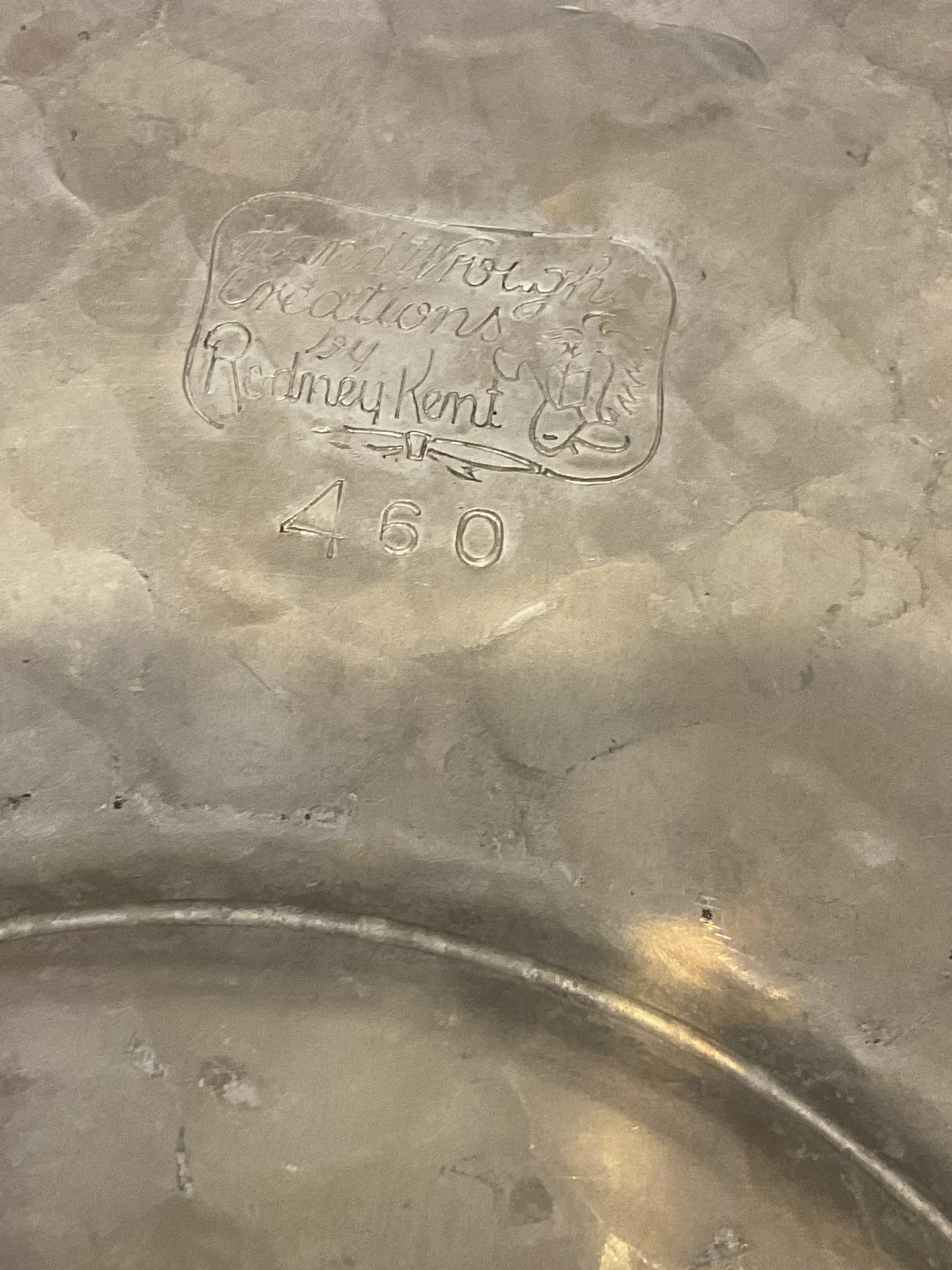 barware tools on stand 10 5/8 in tall and a hand wrought creations plate by Rodney Kent