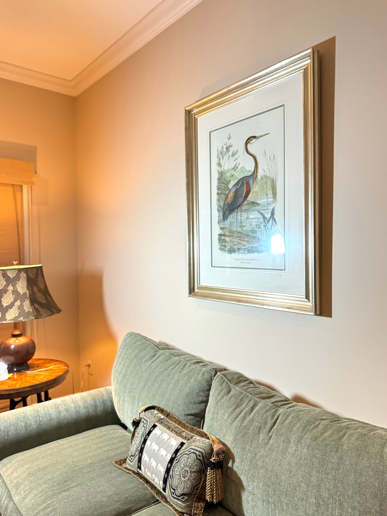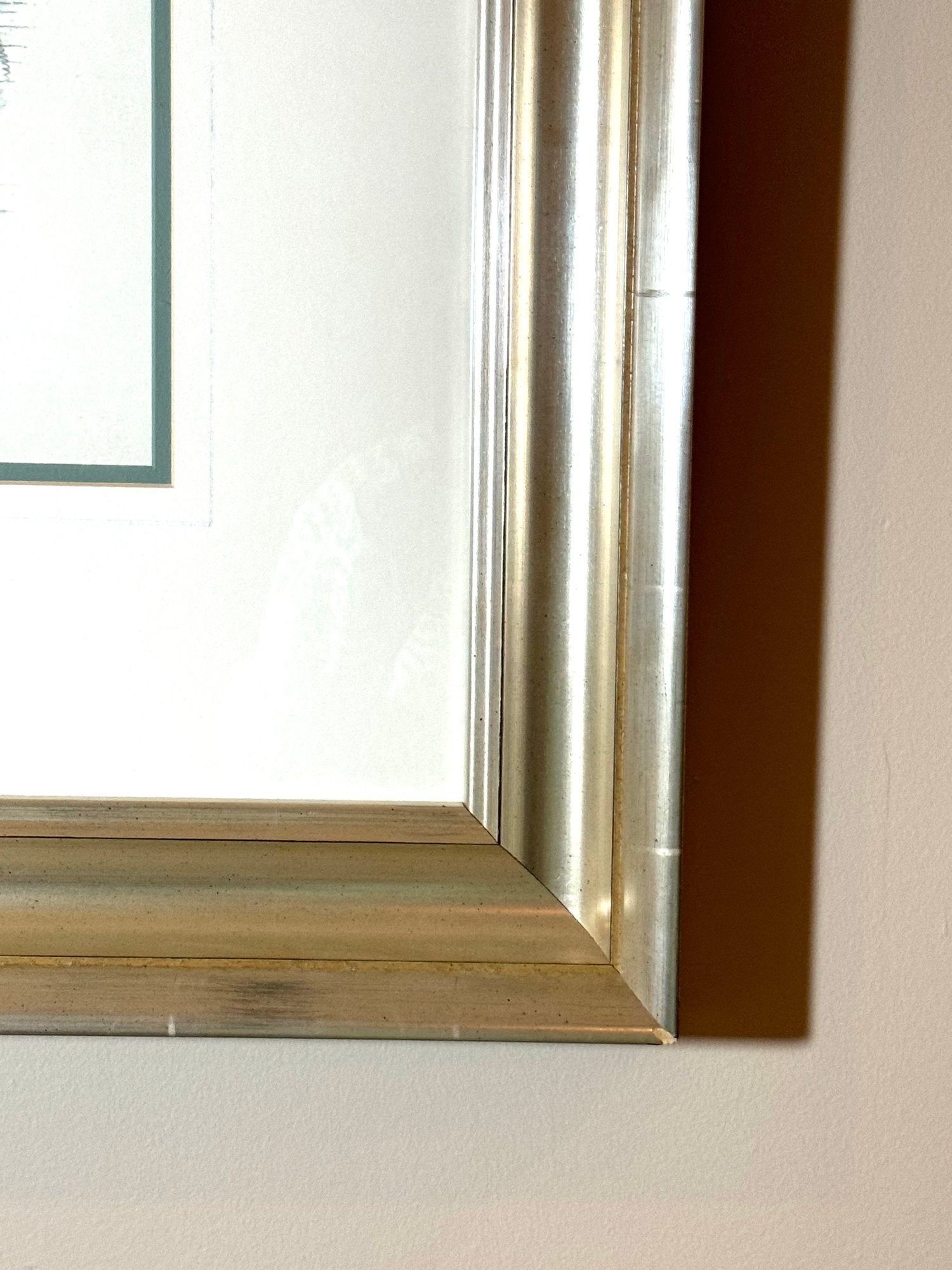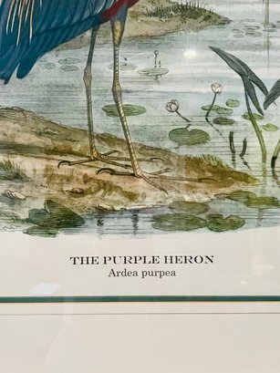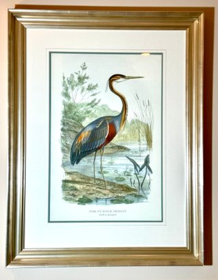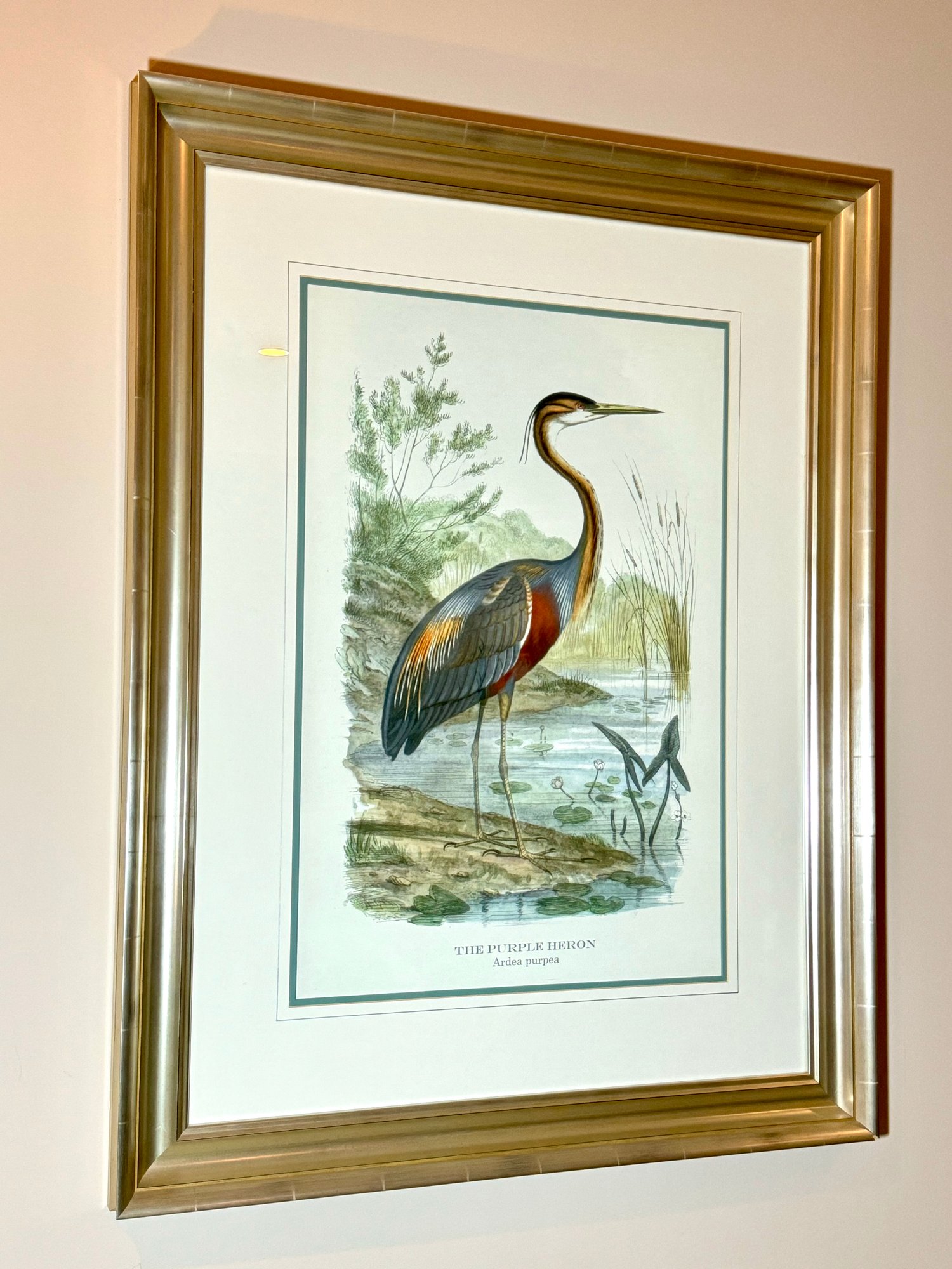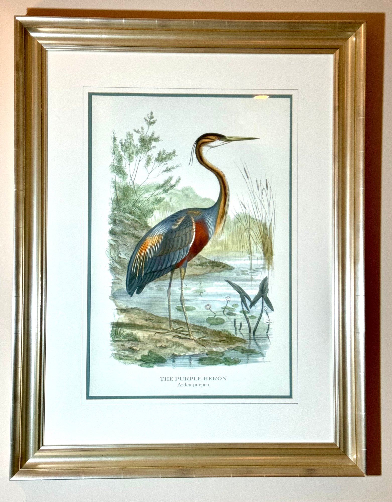 This very sweet print depicts the Purple Heron standing upright and very alert. Giclee inspired by 17th Century natural history chromolithograph. It has been custom framed in a beautiful brushed silver wood paneled style heavy frame under an ivory matte with silver border edge detail. Condition is very good. Size 45 H x 34.5 W x 2 D *Please note SIZE as can appear smaller in photo :)